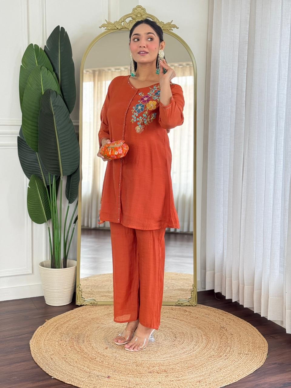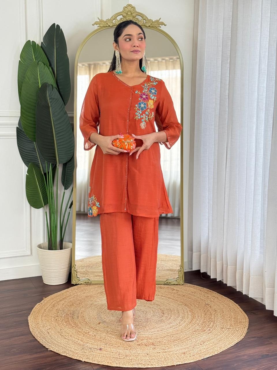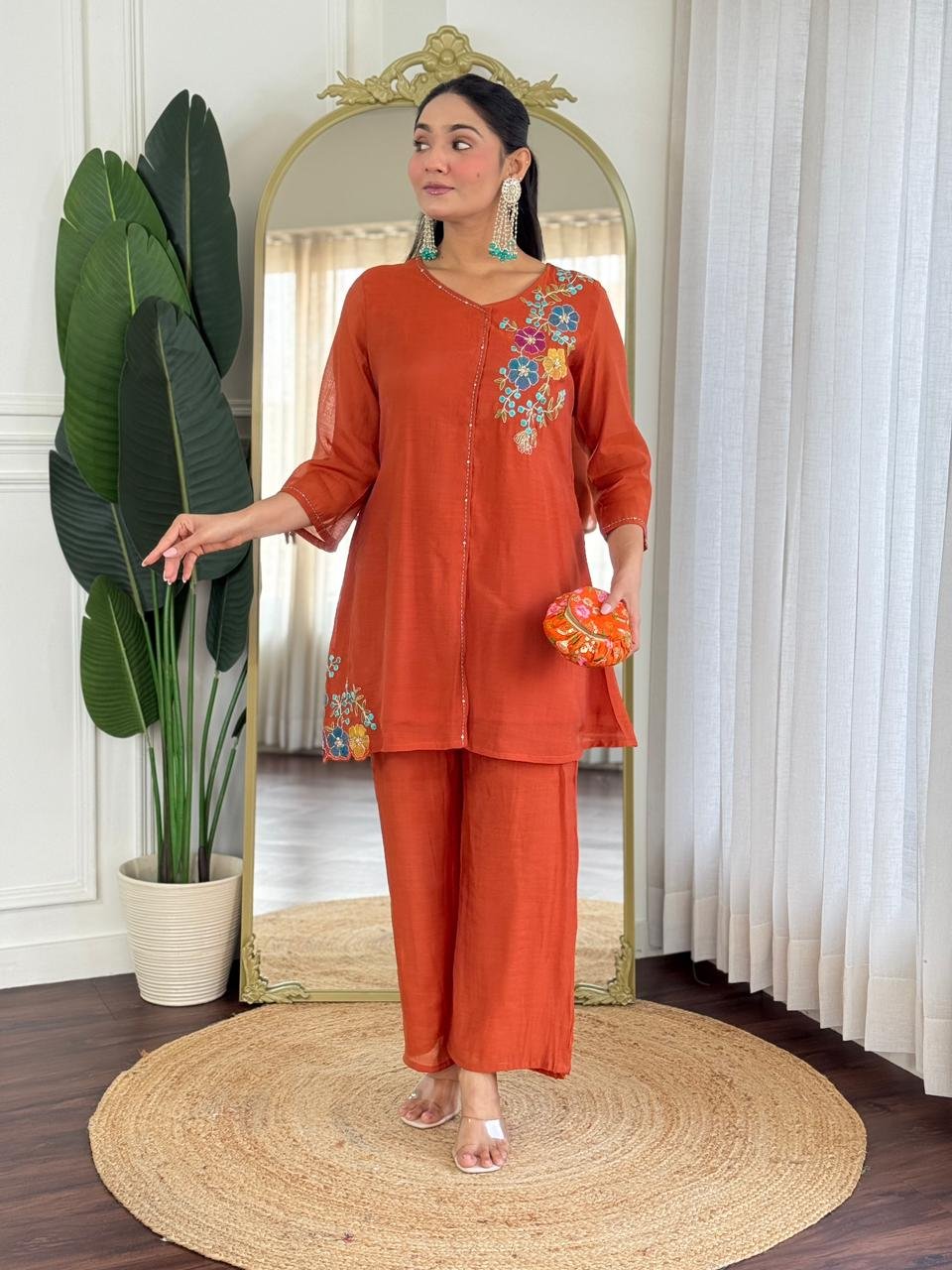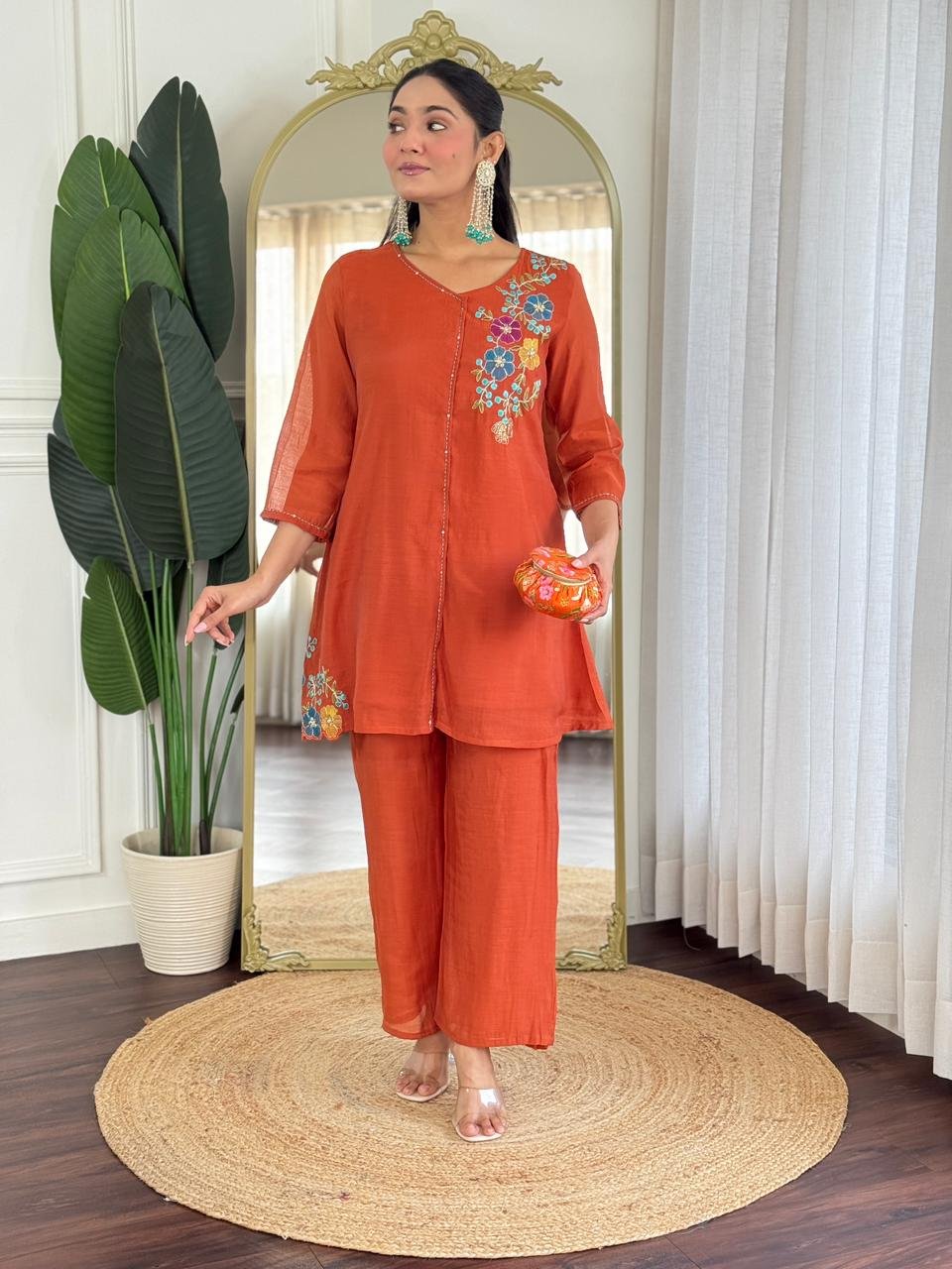 The CS-045 Mul Chanderi Co-Ord Set is a sophisticated ensemble crafted from premium Mal Chanderi fabric. The intricate hand khat and thread embroidery adds richness while maintaining a refined silhouette.