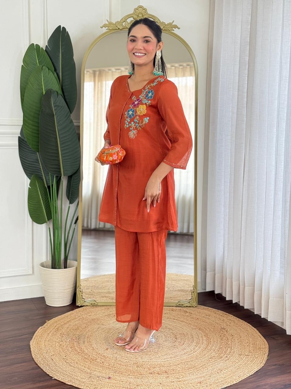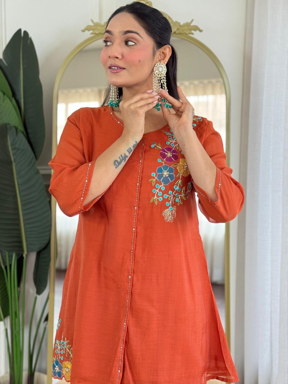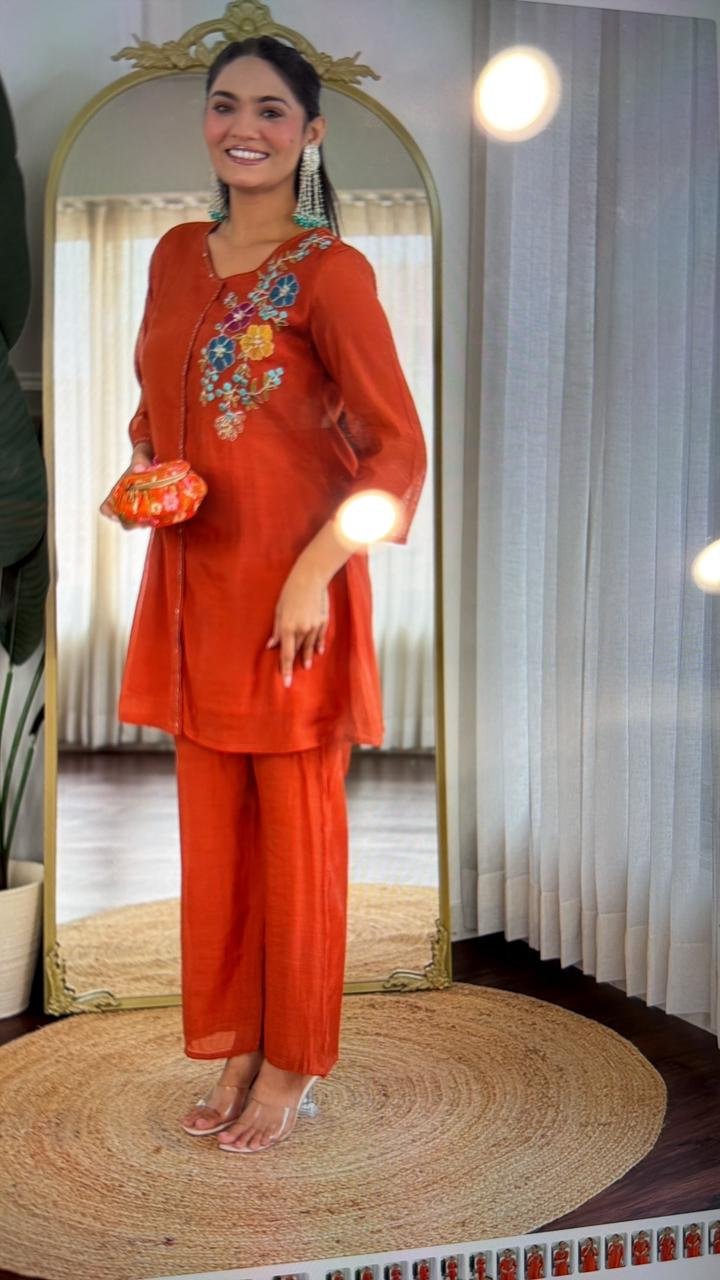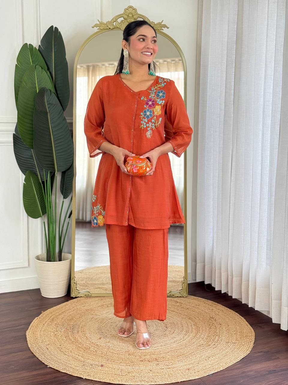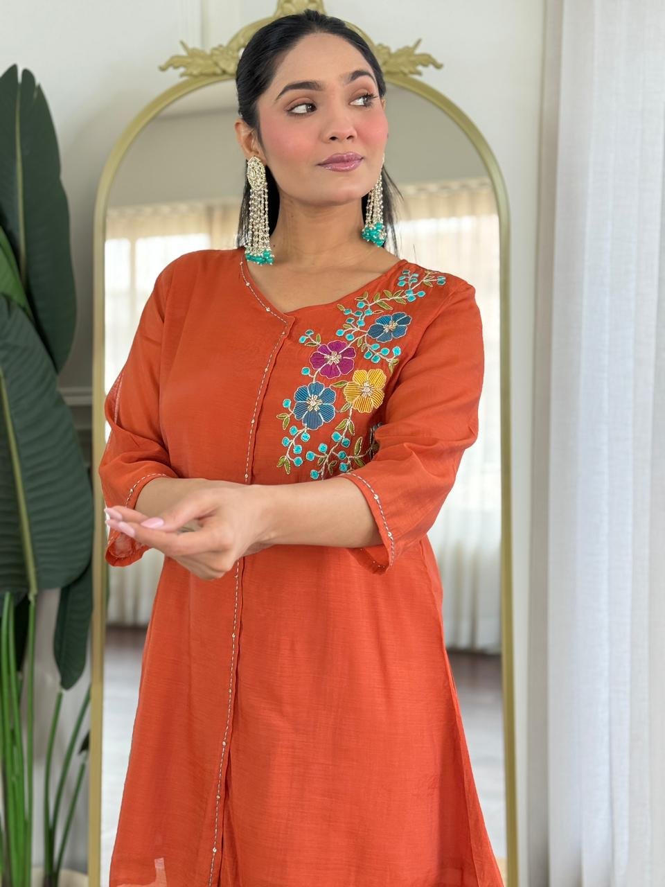 The CS-045 Mul Chanderi Co-Ord Set is a sophisticated ensemble crafted from premium Mal Chanderi fabric. The intricate hand khat and thread embroidery adds richness while maintaining a refined silhouette.