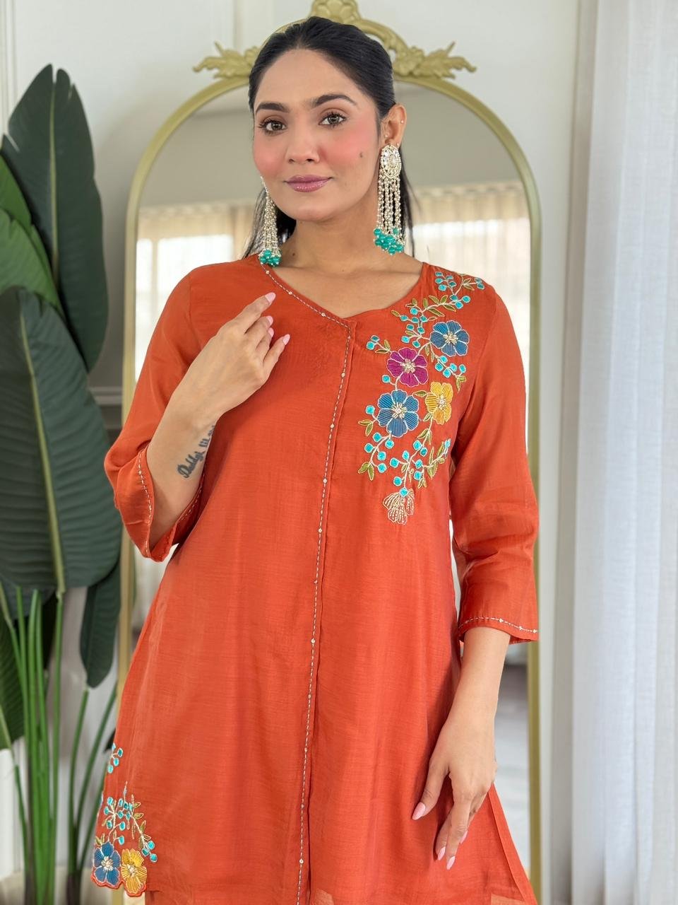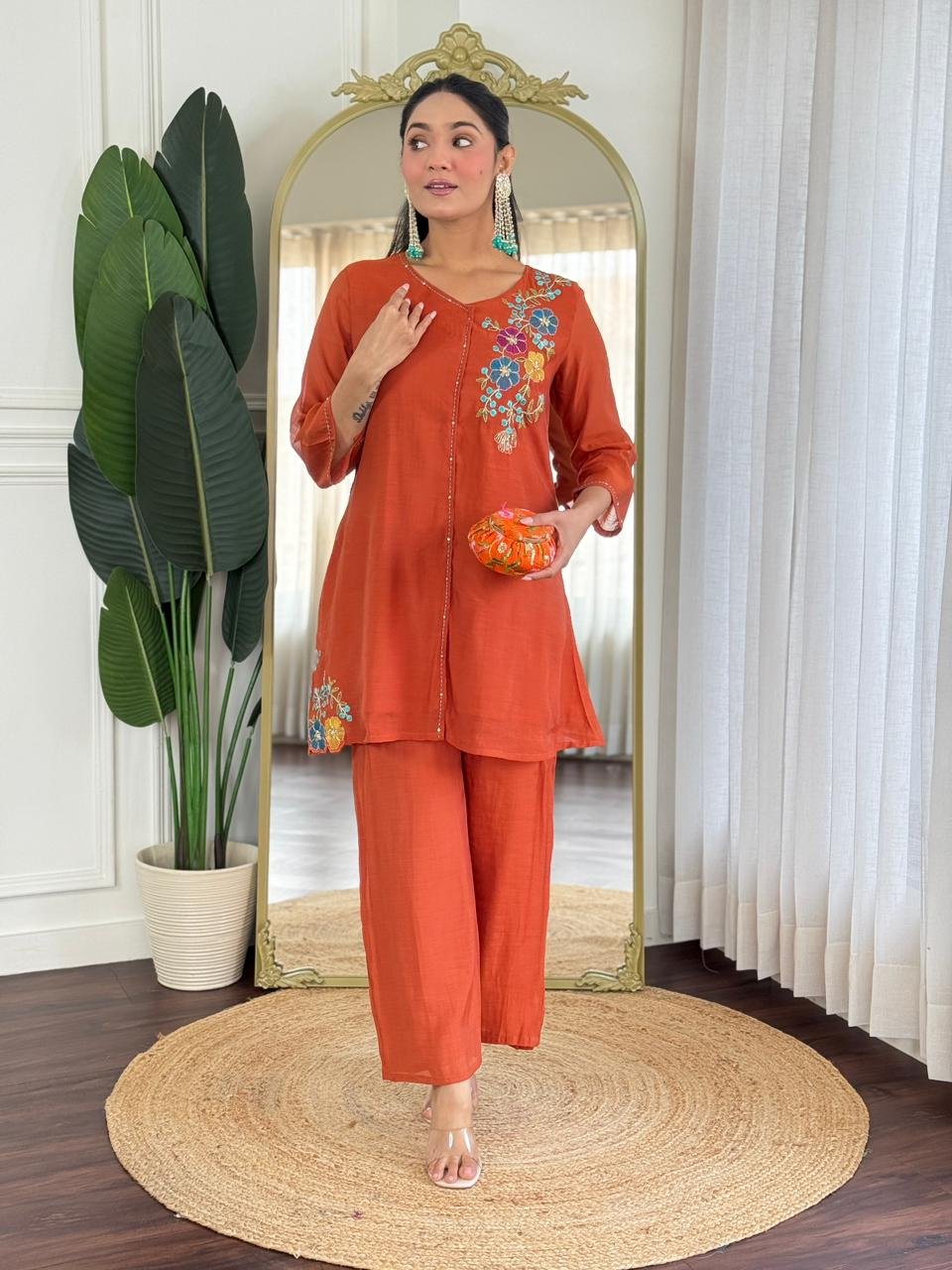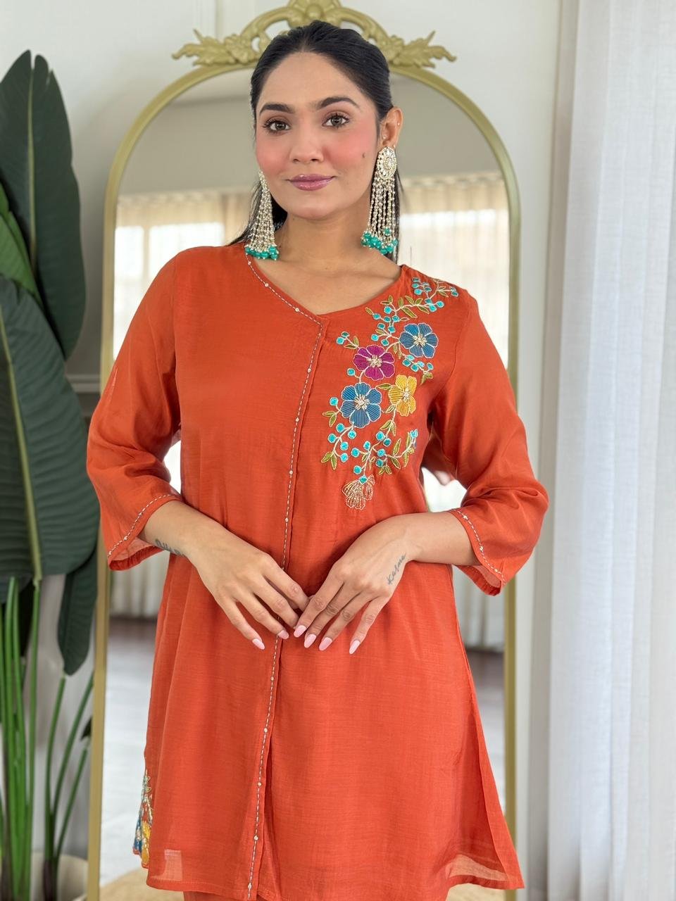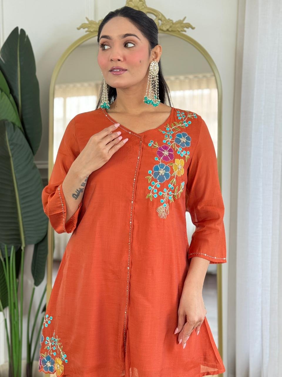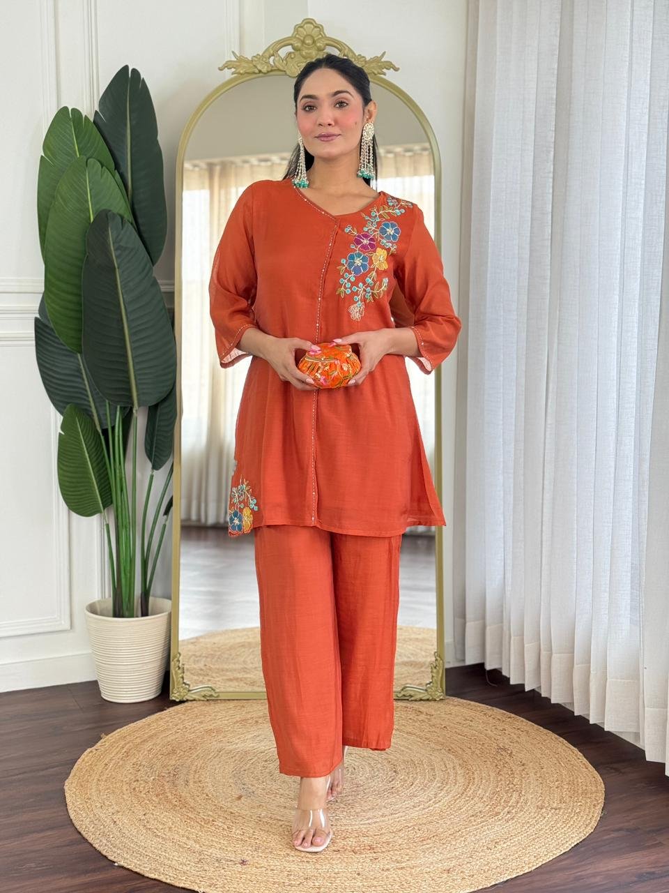 The CS-045 Mul Chanderi Co-Ord Set is a sophisticated ensemble crafted from premium Mal Chanderi fabric. The intricate hand khat and thread embroidery adds richness while maintaining a refined silhouette.