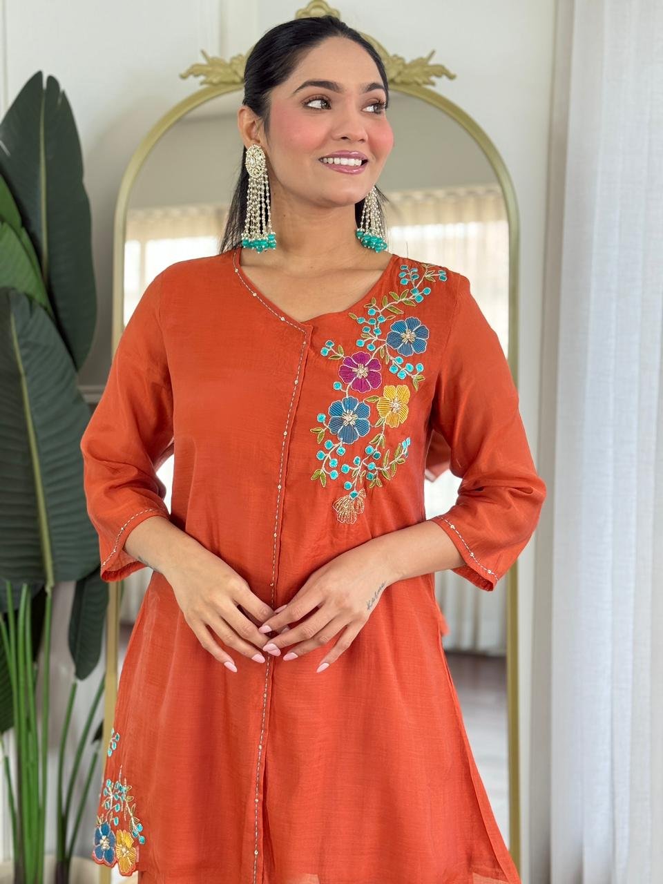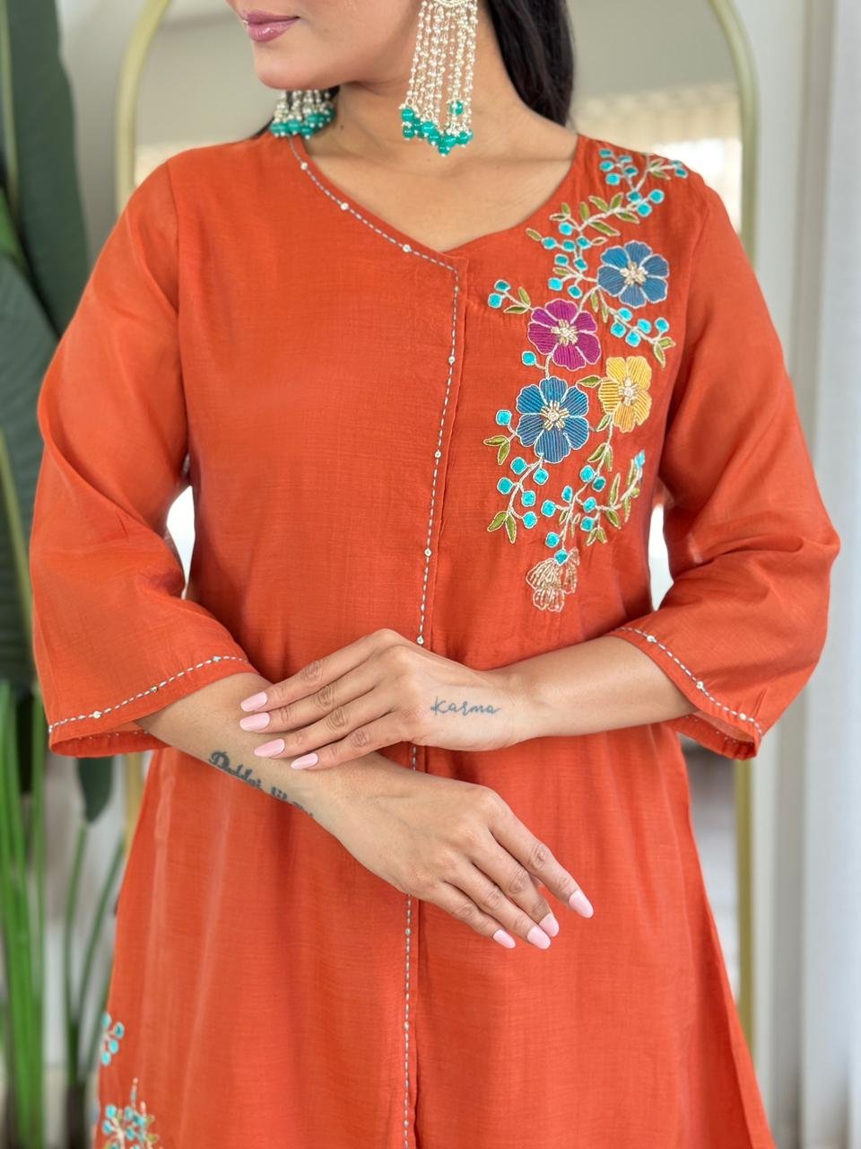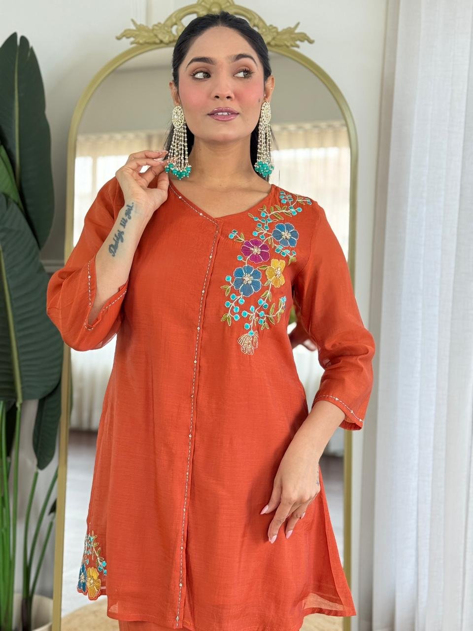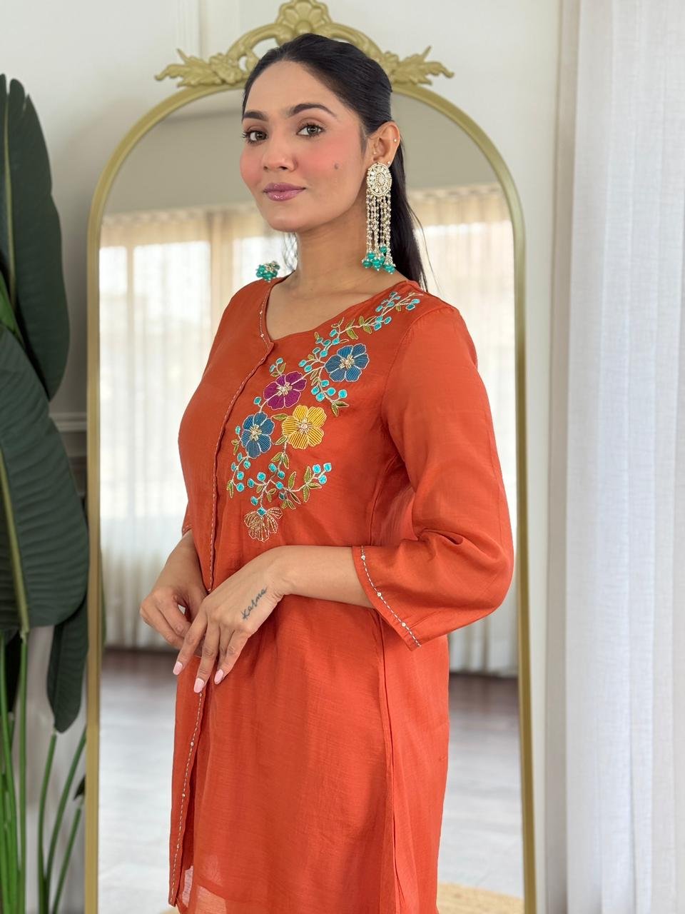 The CS-045 Mul Chanderi Co-Ord Set is a sophisticated ensemble crafted from premium Mal Chanderi fabric. The intricate hand khat and thread embroidery adds richness while maintaining a refined silhouette.