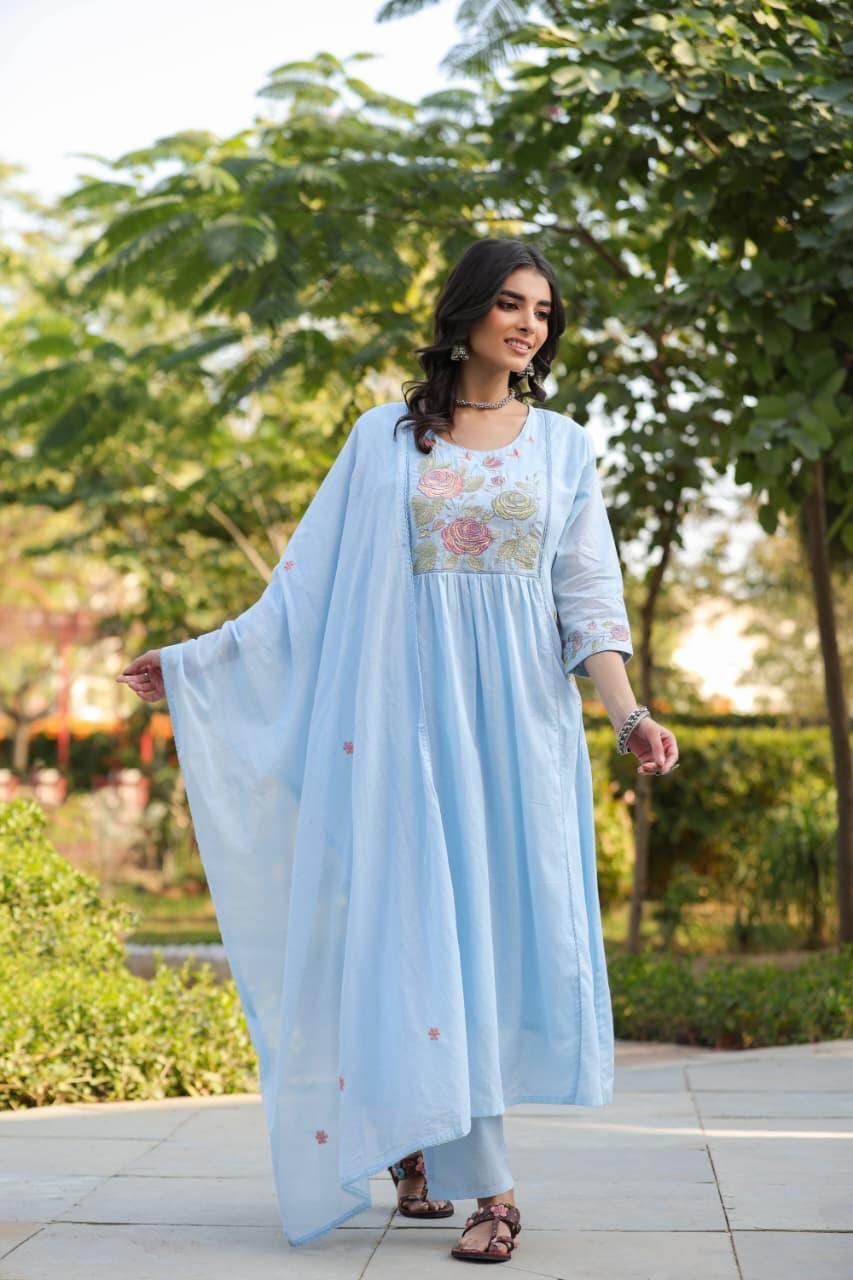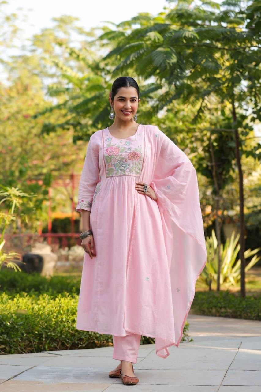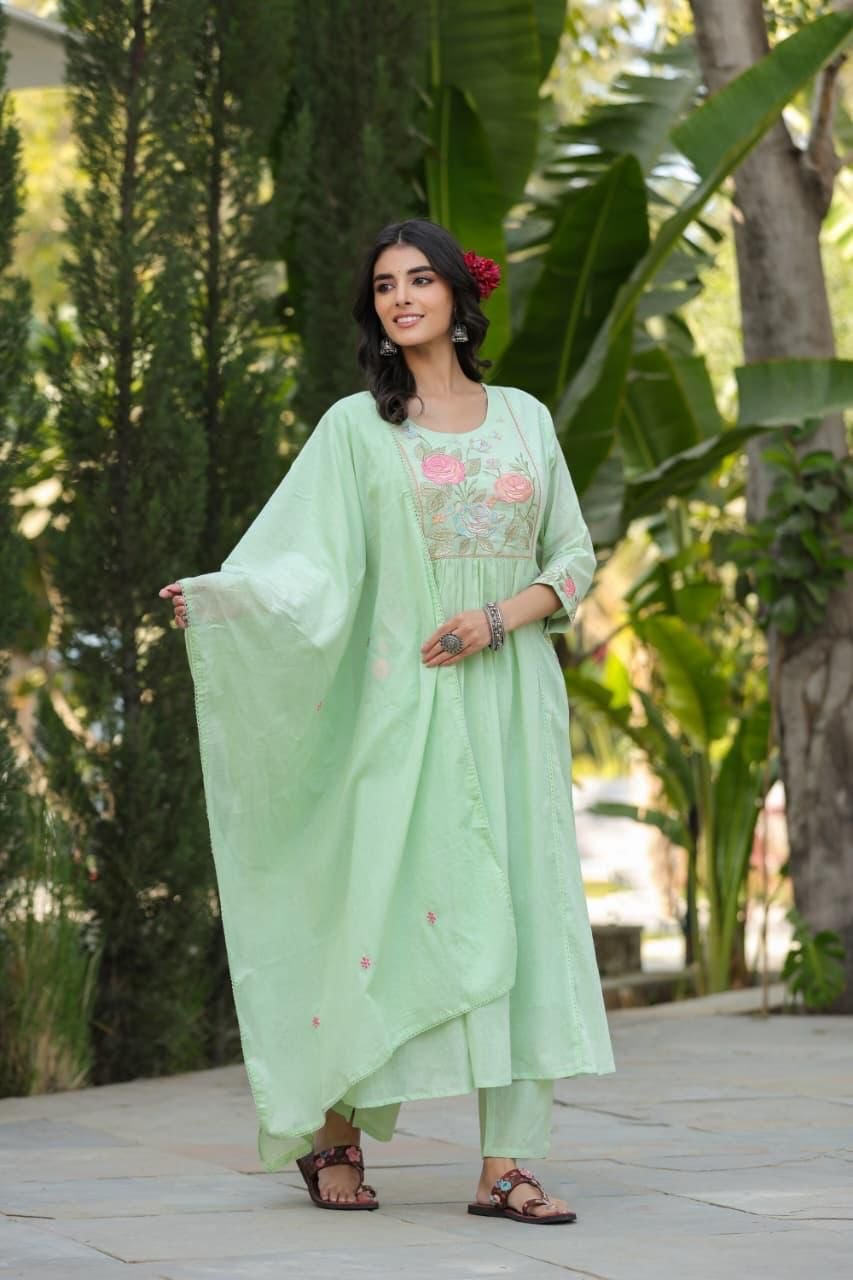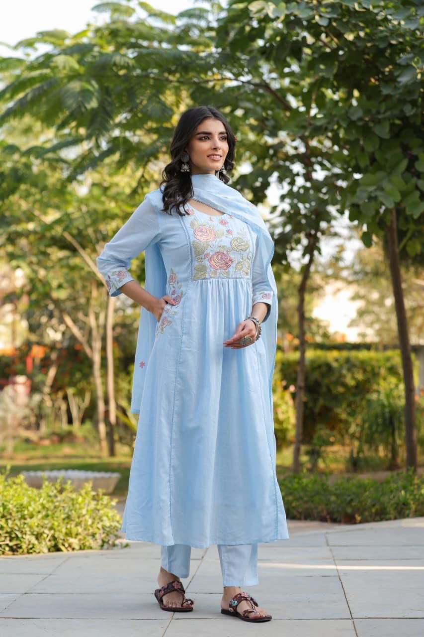 Featuring a beautifully embroidered yoke and pockets, along with a coordinated embroidered dupatta, the set delivers a refined ethnic look suitable for everyday wear, office, or small festive occasions.