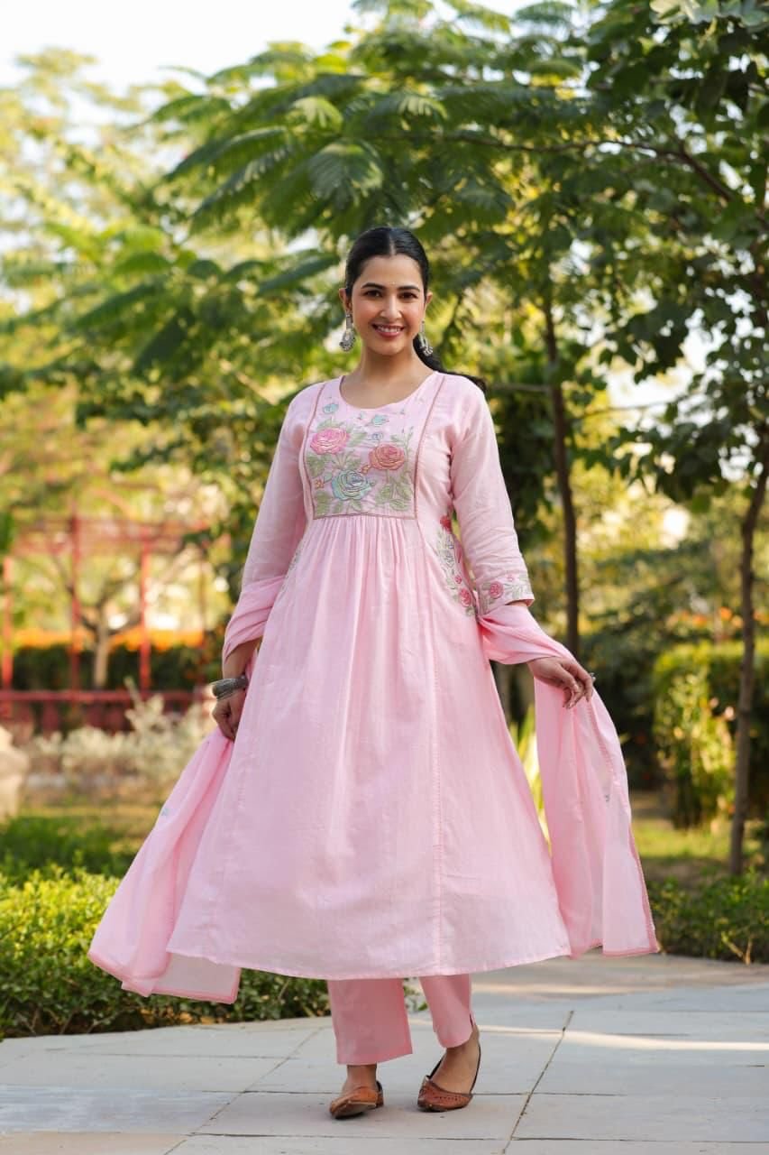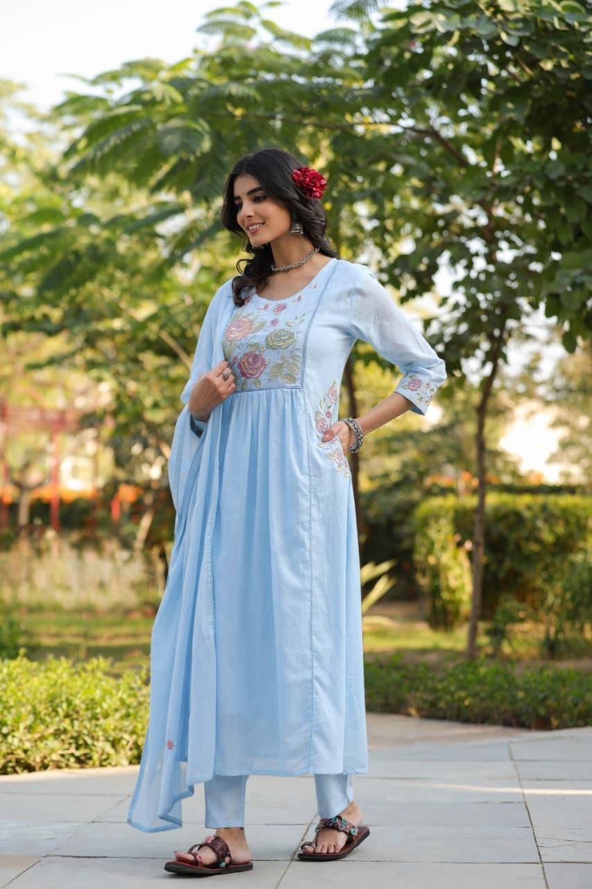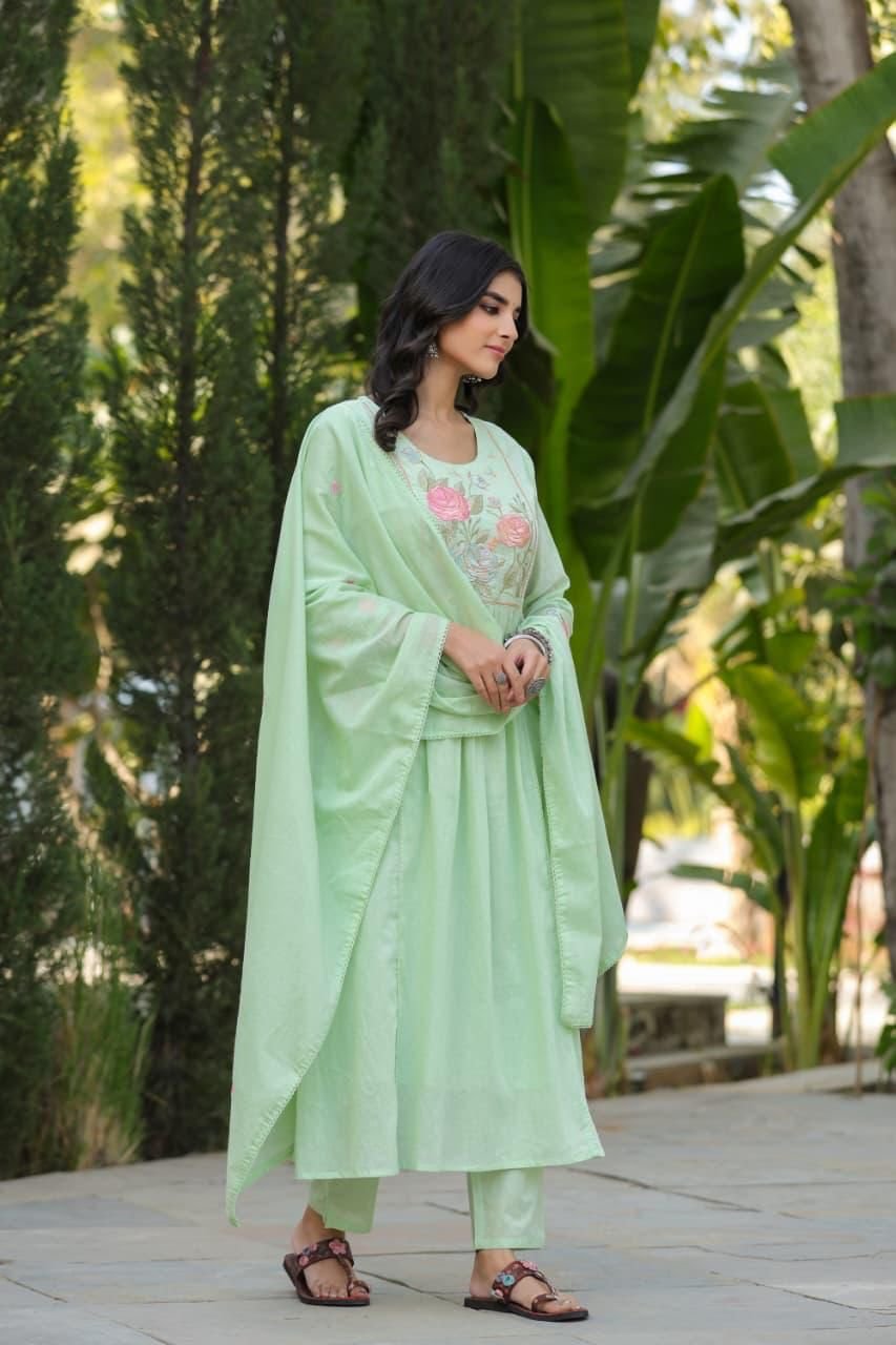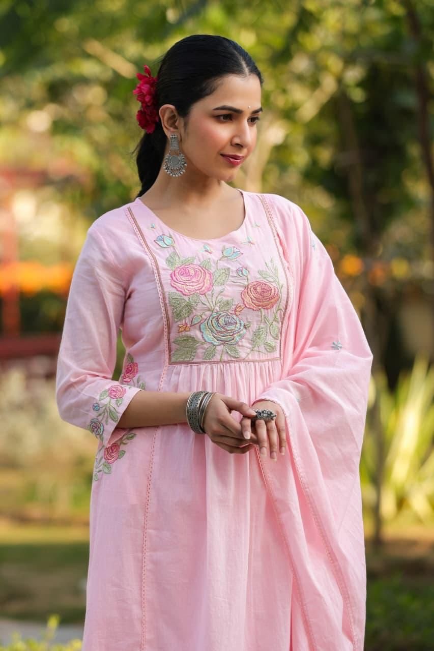 Featuring a beautifully embroidered yoke and pockets, along with a coordinated embroidered dupatta, the set delivers a refined ethnic look suitable for everyday wear, office, or small festive occasions.
