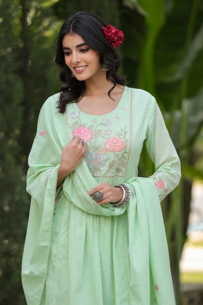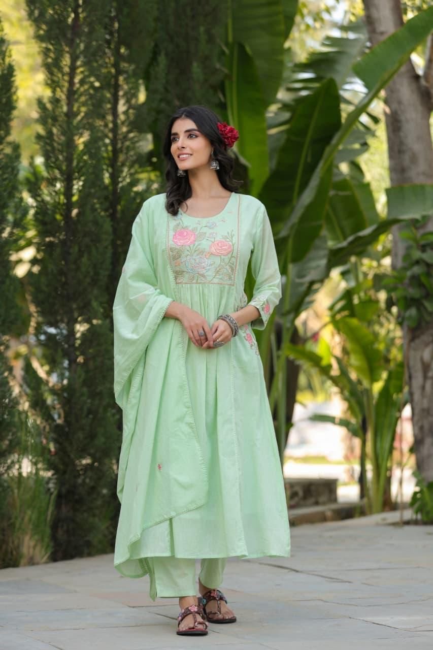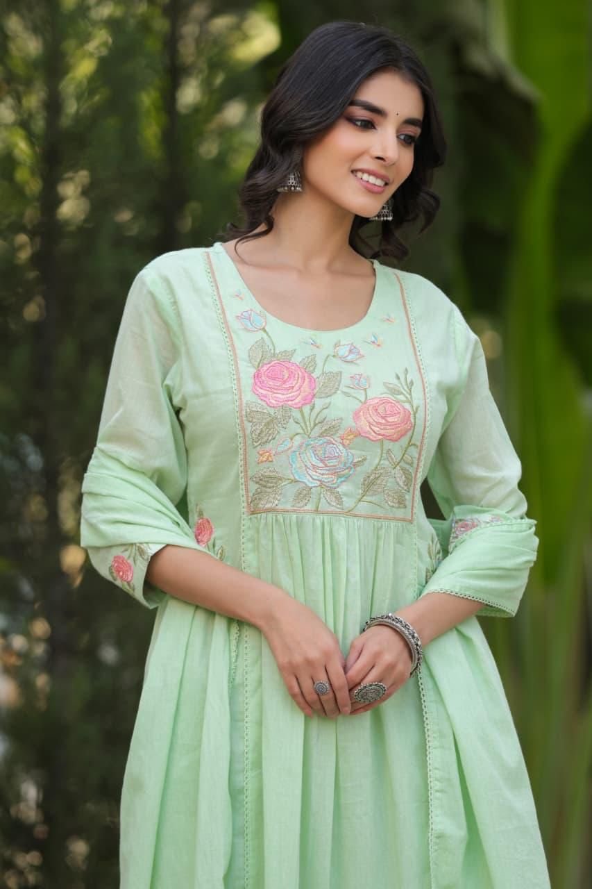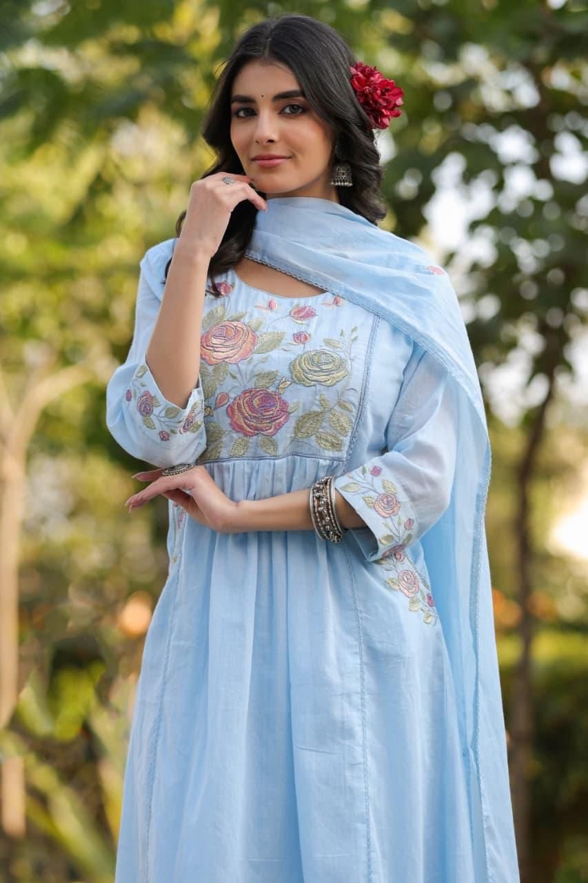 Featuring a beautifully embroidered yoke and pockets, along with a coordinated embroidered dupatta, the set delivers a refined ethnic look suitable for everyday wear, office, or small festive occasions.