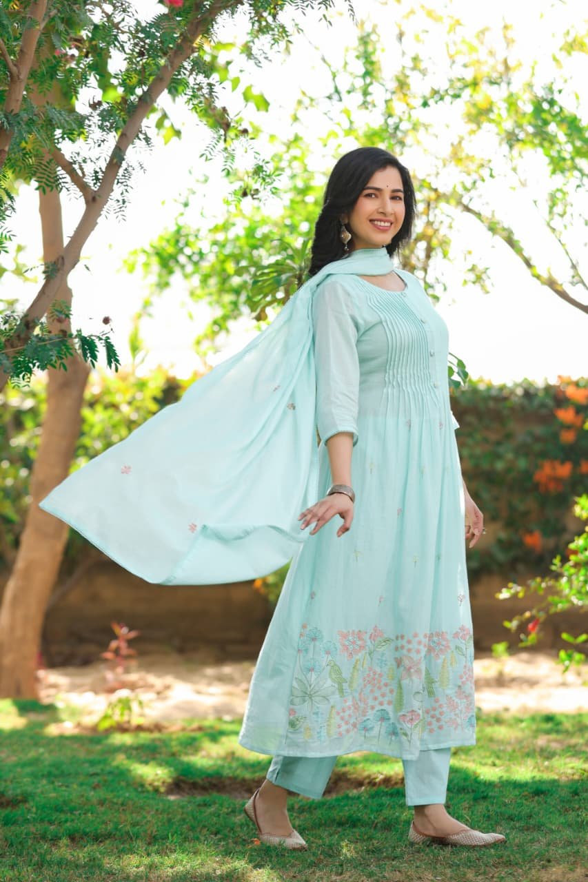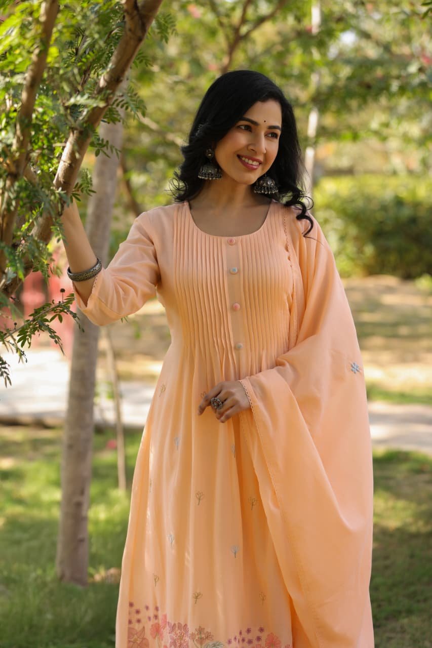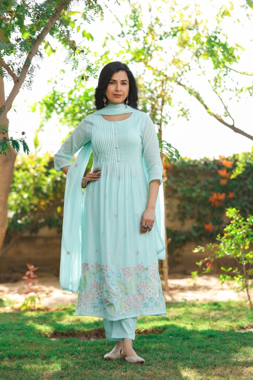 The kurta features beautiful pintucks detailing and full embroidery, giving it a rich and elegant look. Paired with an embroidered dupatta, the outfit creates a refined ethnic ensemble.