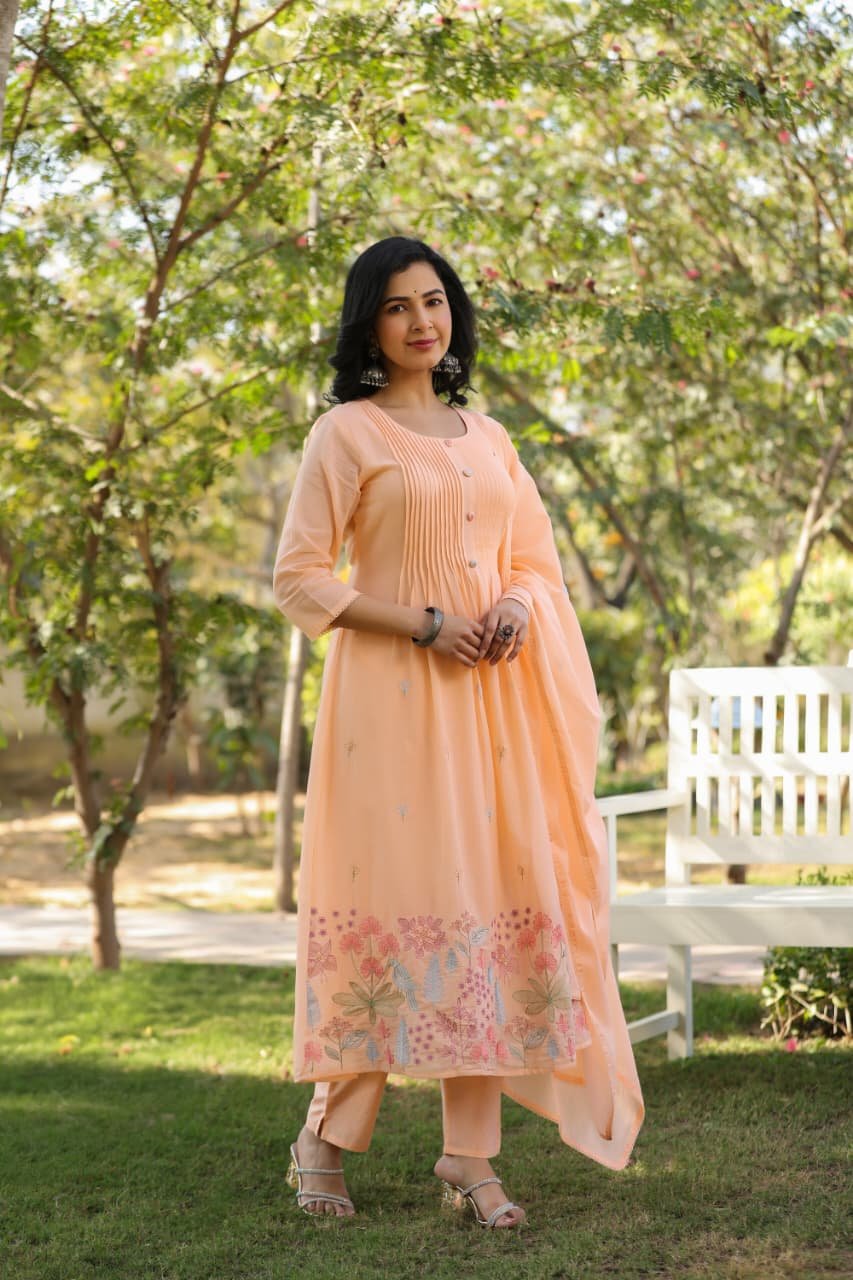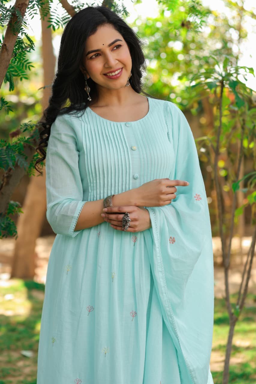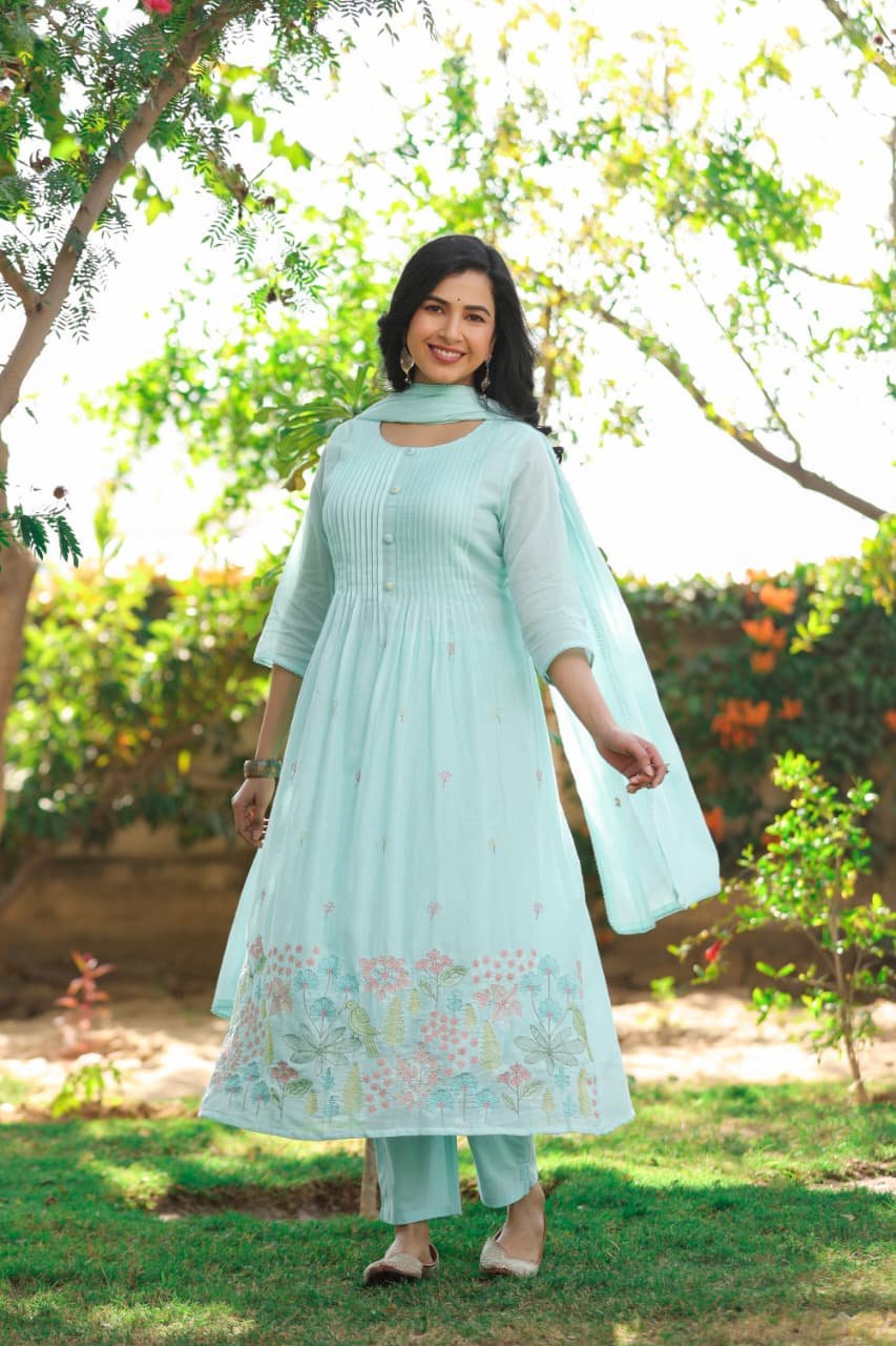 The kurta features beautiful pintucks detailing and full embroidery, giving it a rich and elegant look. Paired with an embroidered dupatta, the outfit creates a refined ethnic ensemble.