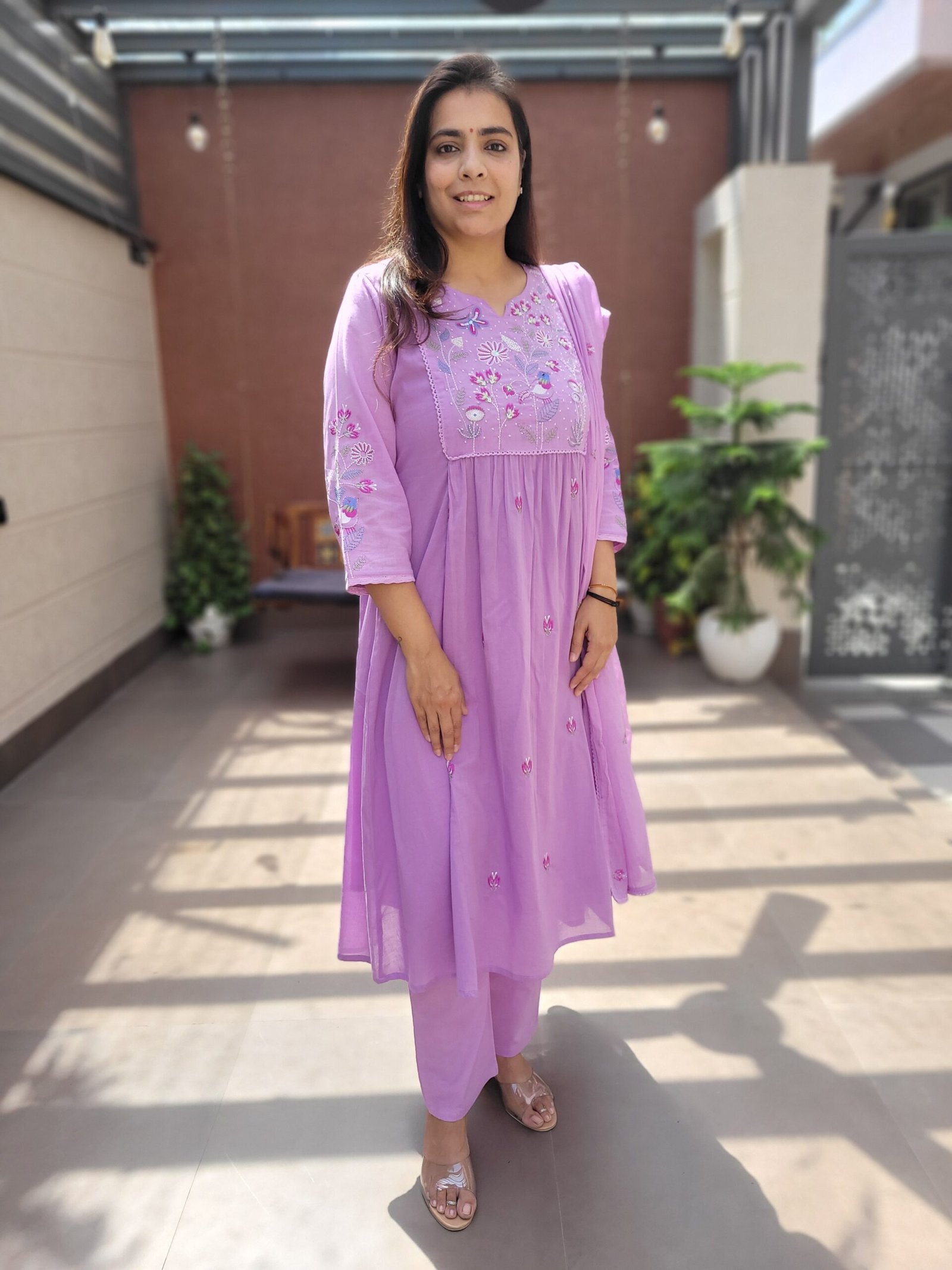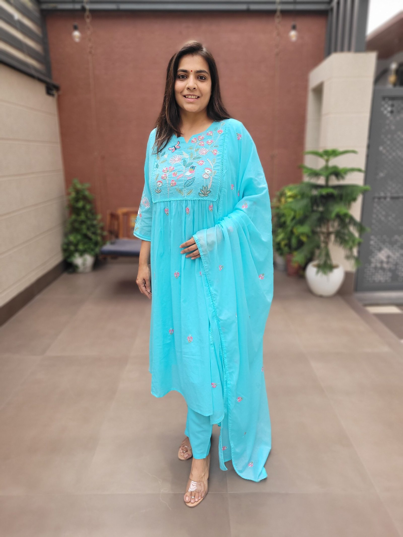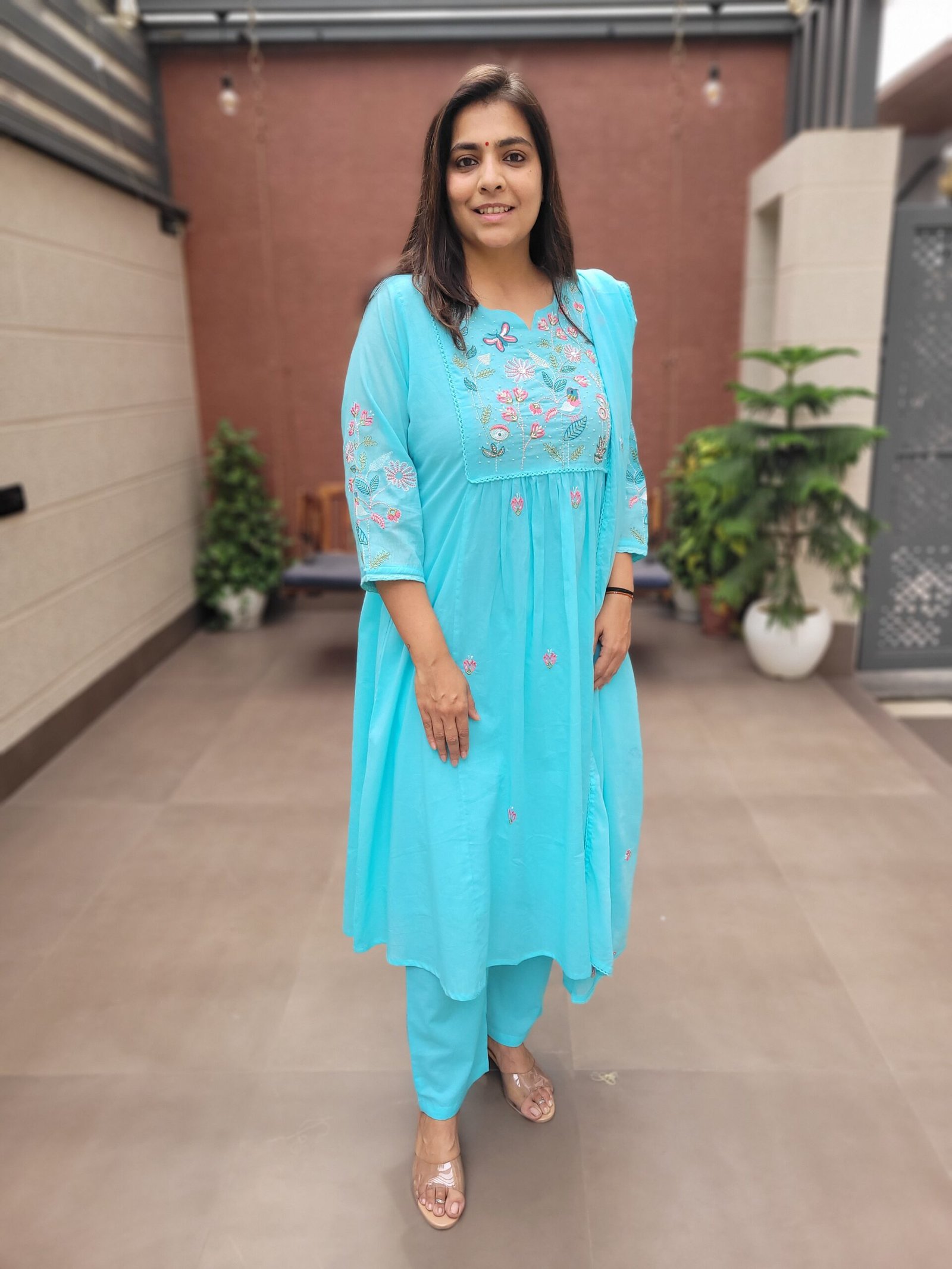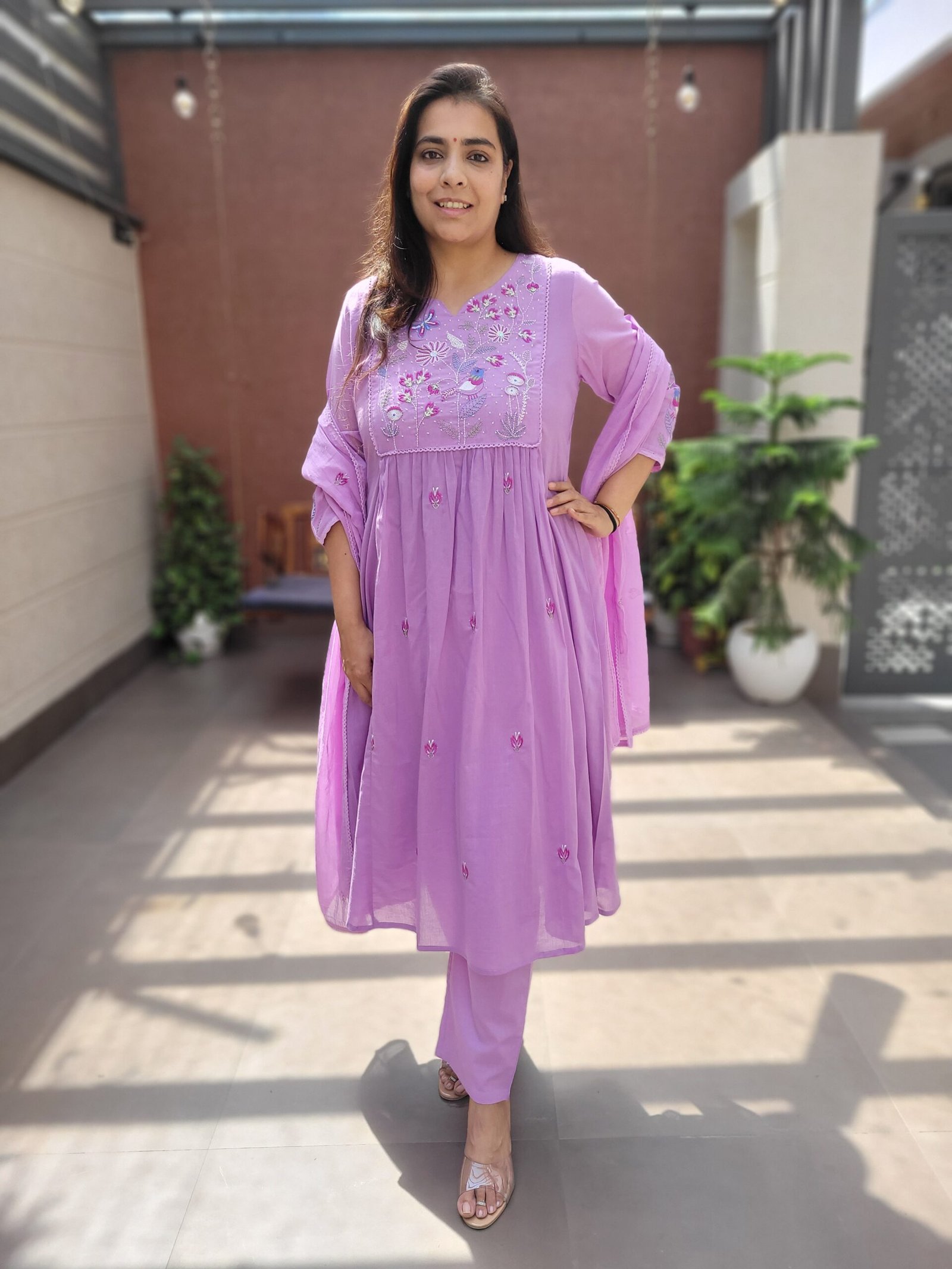 The A-line kurta with embroidery and handwork enhances the overall look, while the cotton lining ensures ease of wear. Ideal for daily wear, casual outings, and light festive occasions.