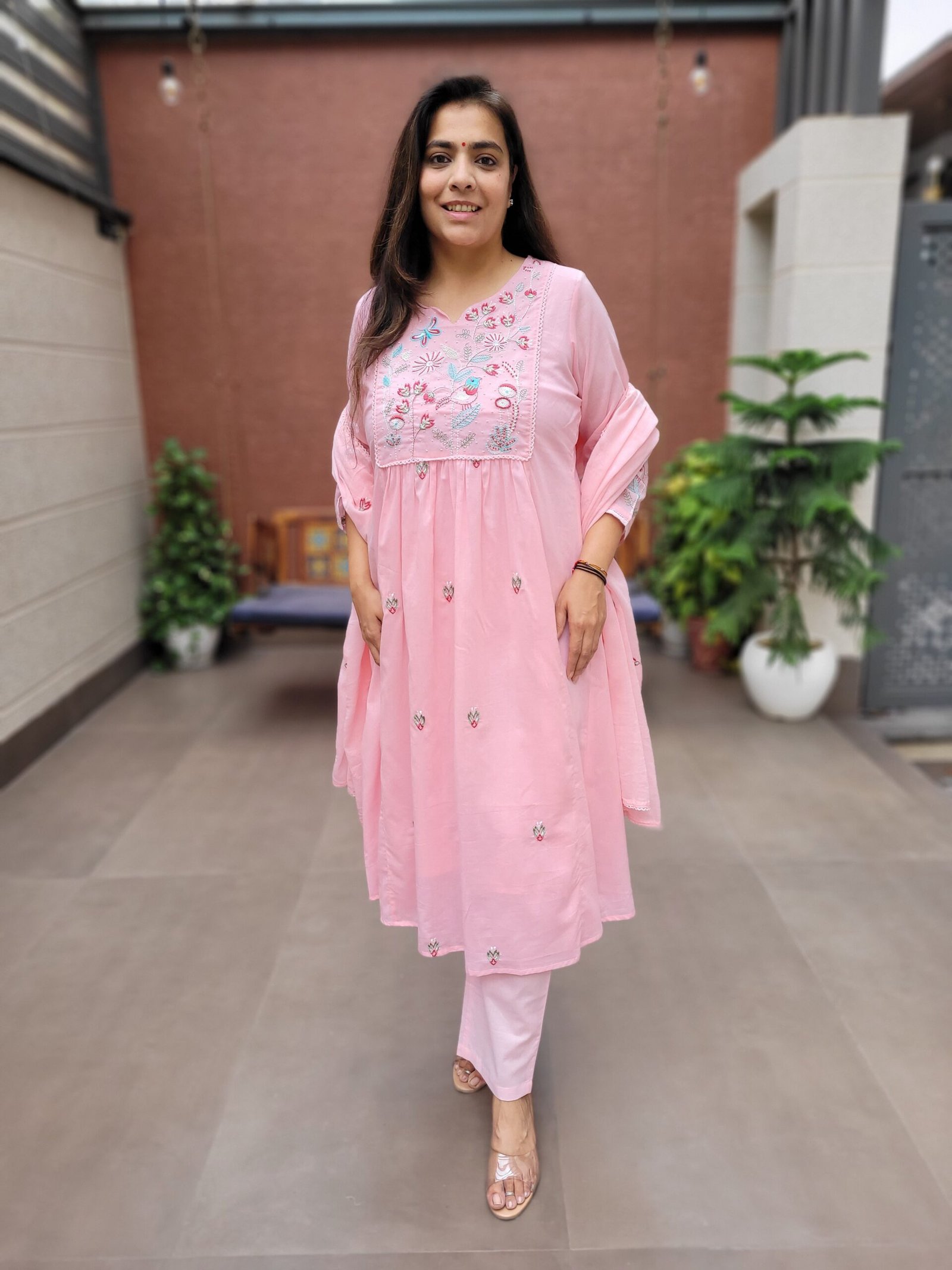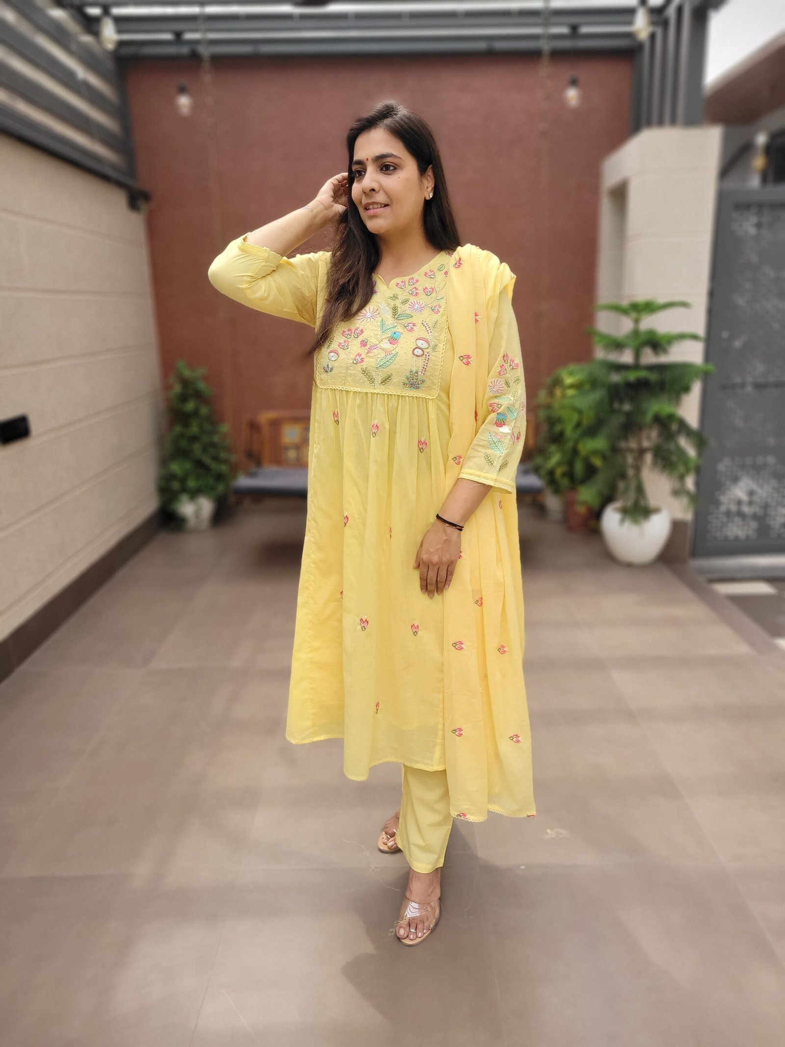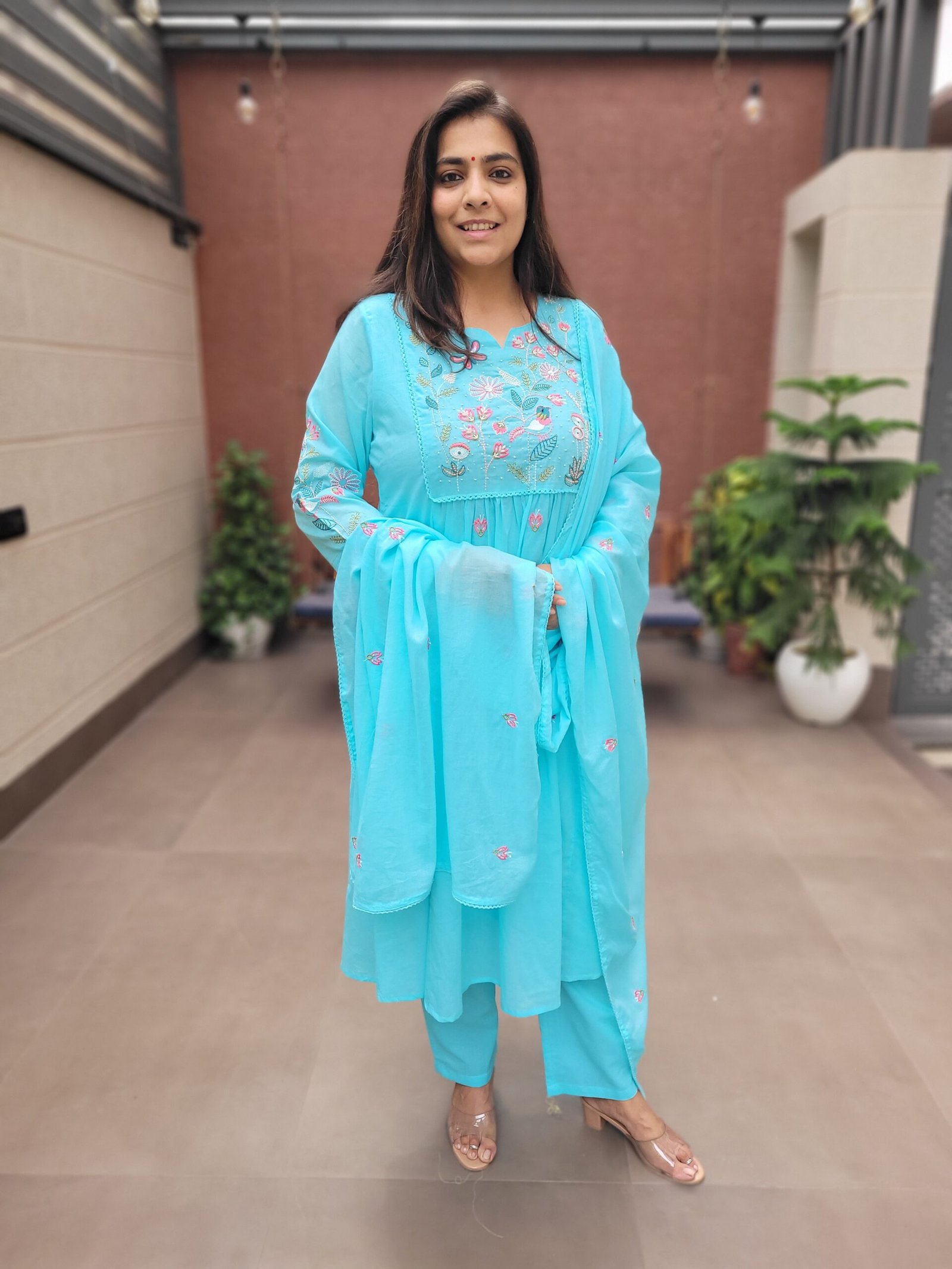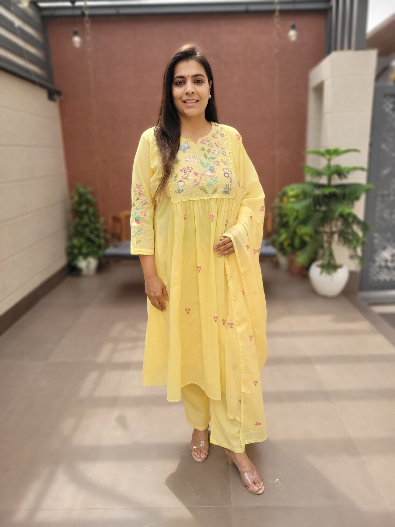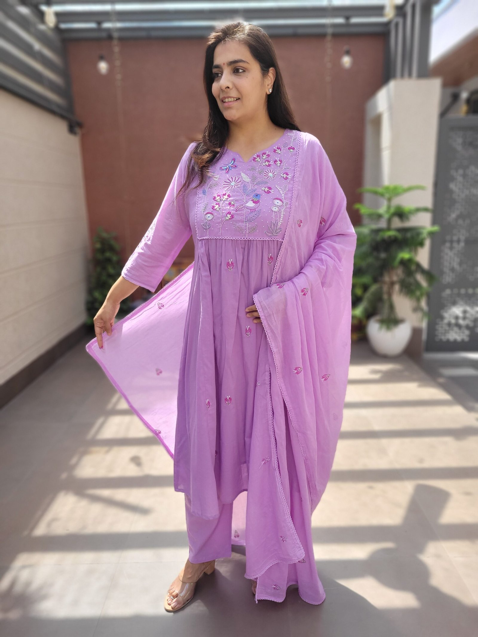 The A-line kurta with embroidery and handwork enhances the overall look, while the cotton lining ensures ease of wear. Ideal for daily wear, casual outings, and light festive occasions.