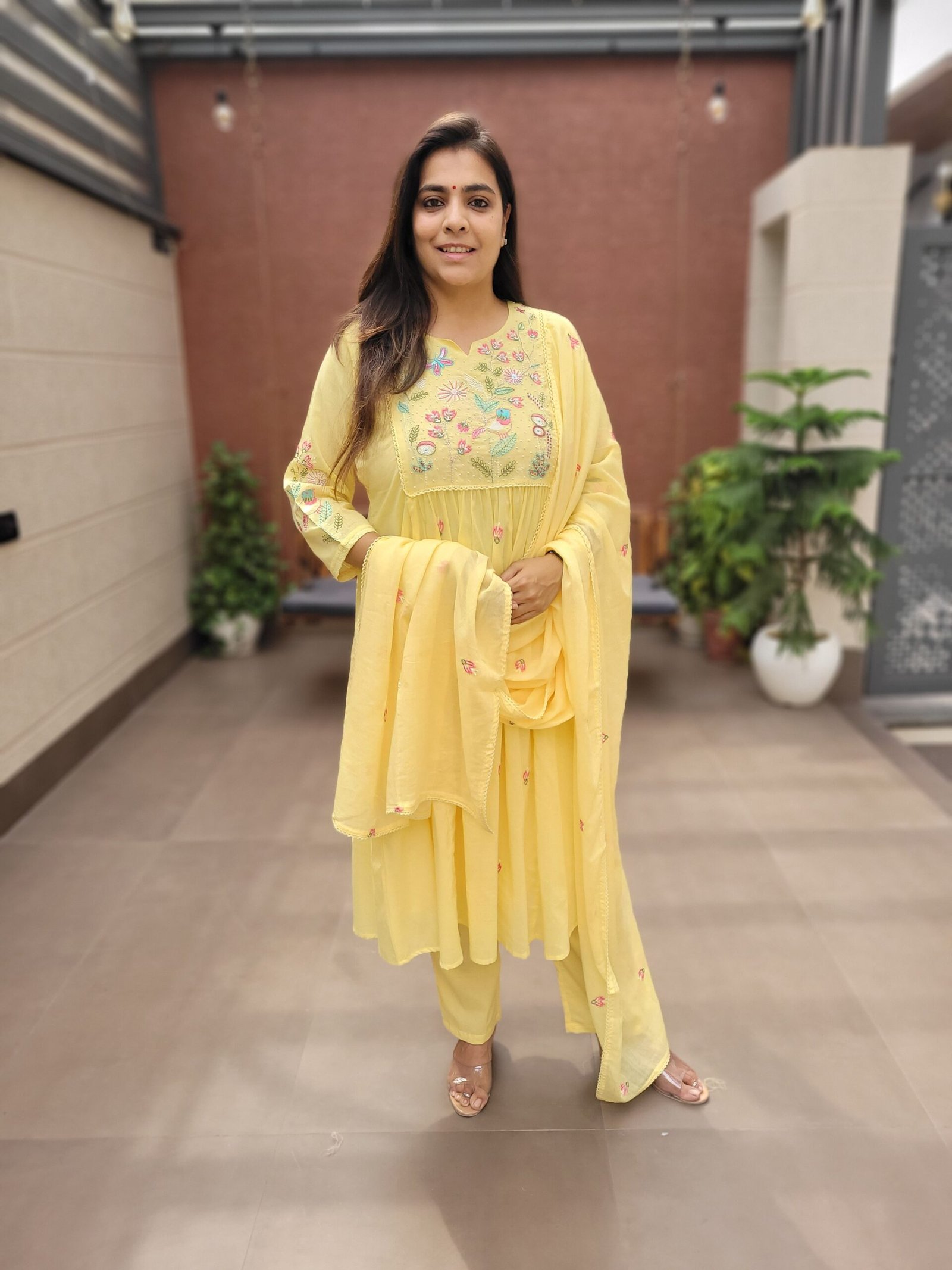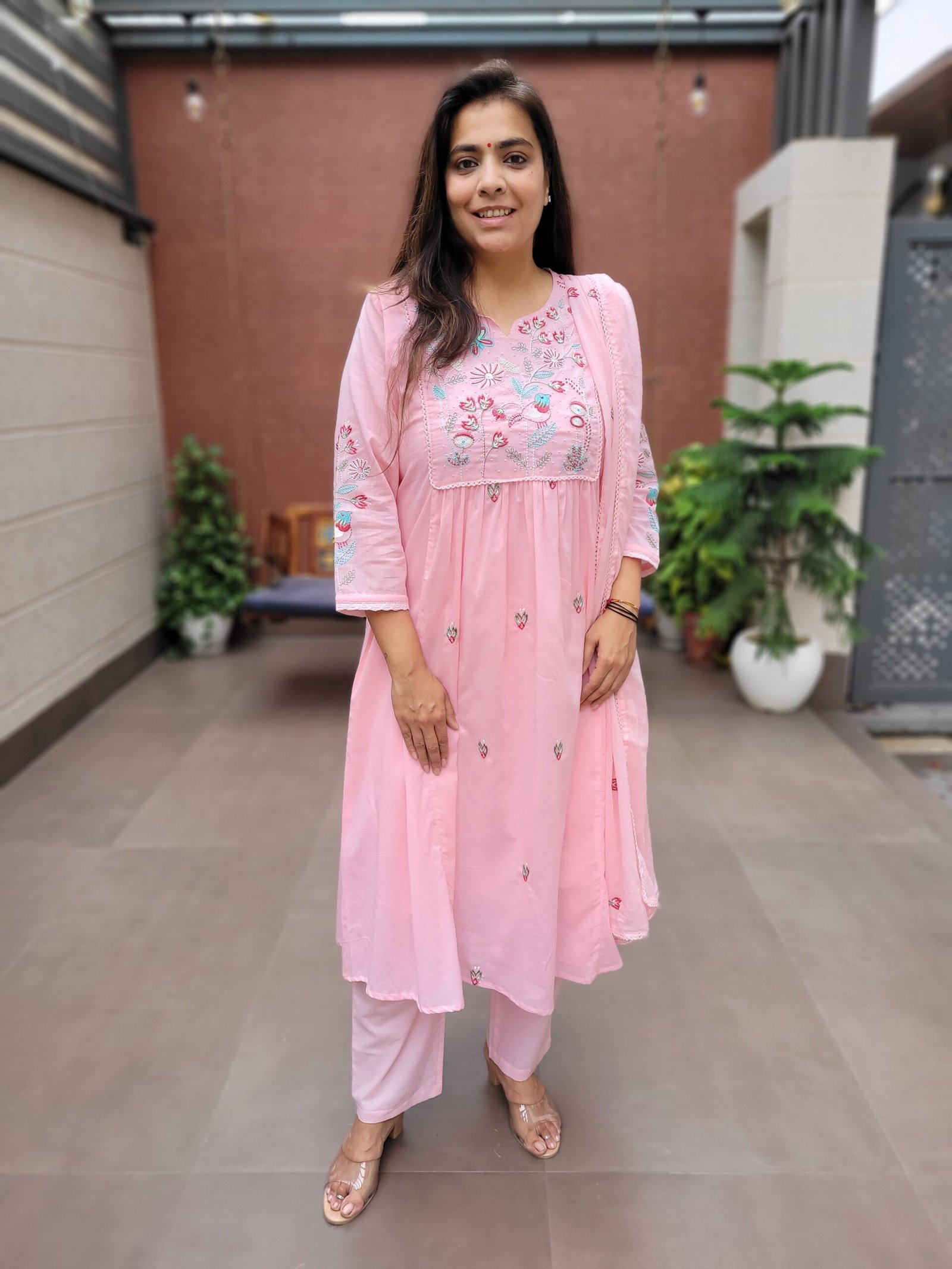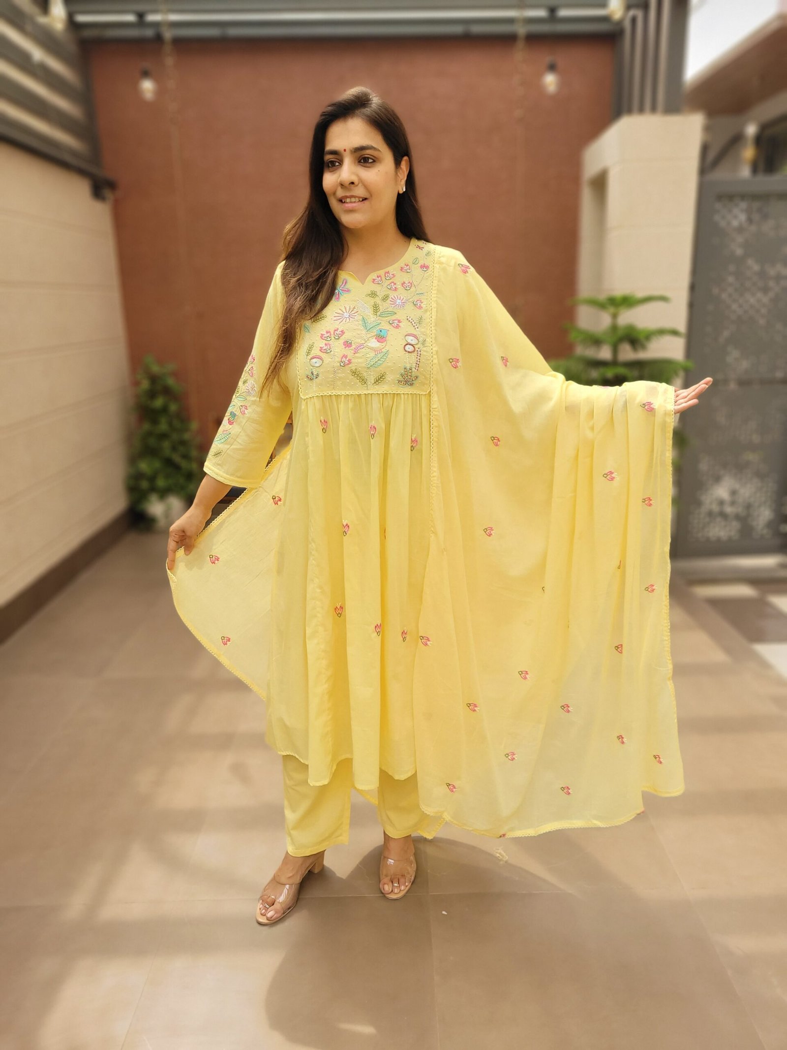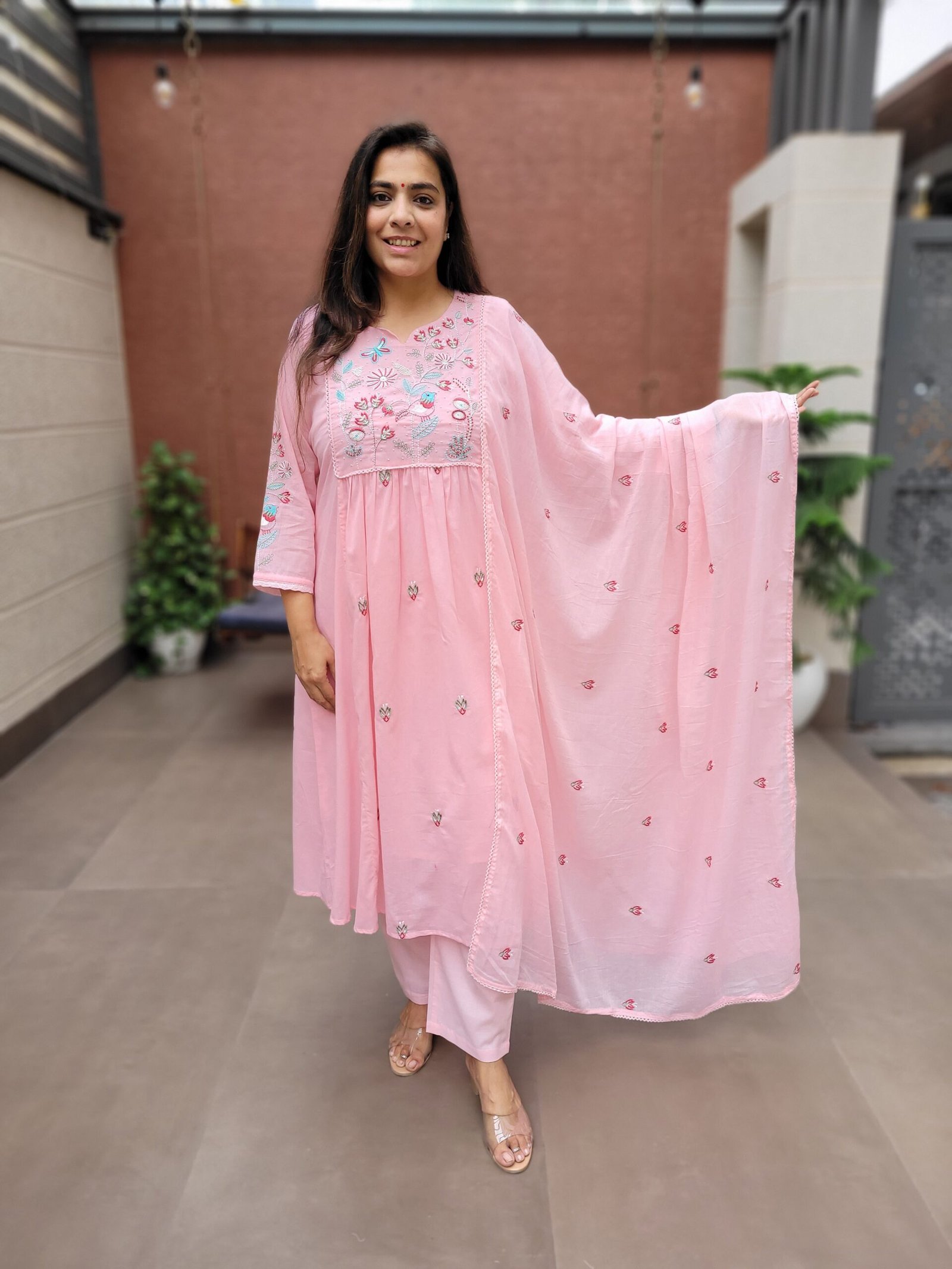 The A-line kurta with embroidery and handwork enhances the overall look, while the cotton lining ensures ease of wear. Ideal for daily wear, casual outings, and light festive occasions.