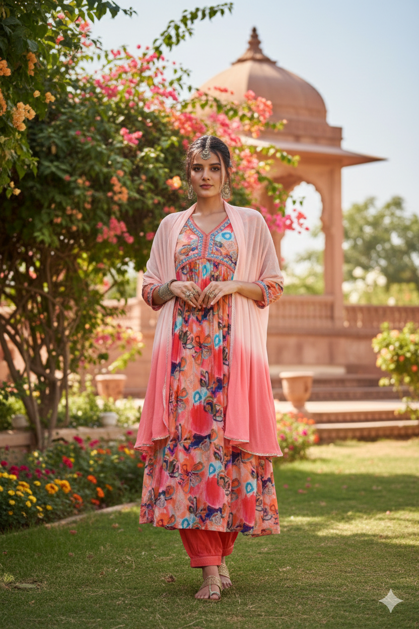 Paired with a trendy Afghani bottom, this set offers a bold yet elegant look, perfect for festive occasions and statement ethnic styling.