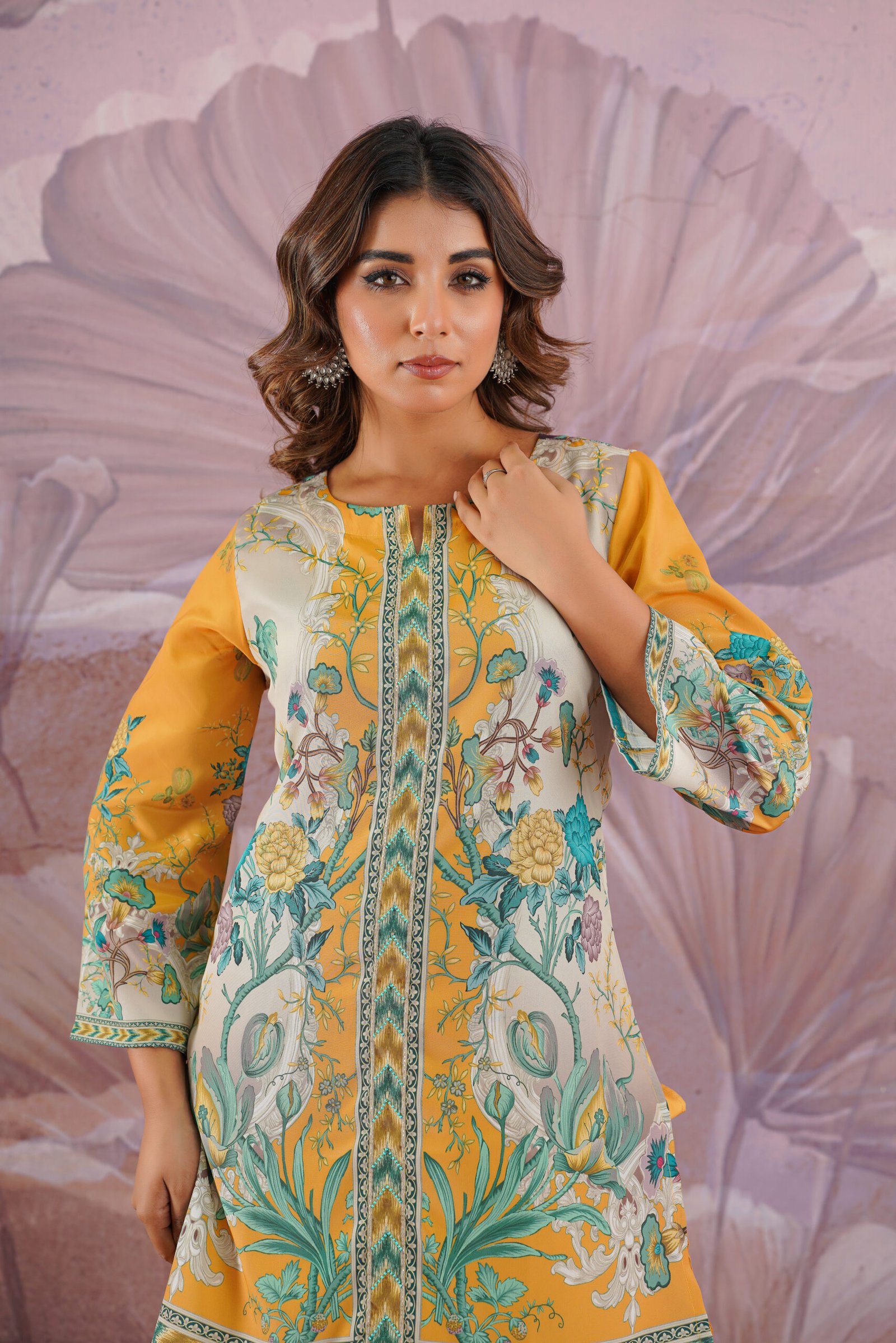 The delicate beads work adds a touch of refined charm, enhancing the overall elegance without being overpowering. The warm mustard hue gives a vibrant, contemporary look that suits a variety of occasions and complements multiple skin tones.