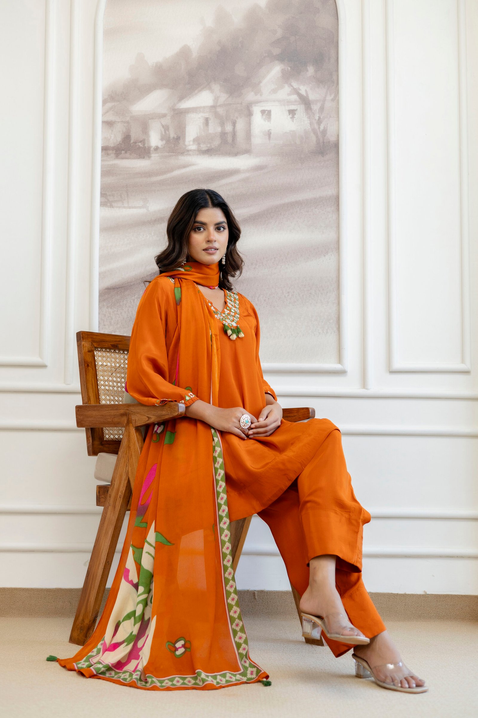 The DU-114 Natural Crepe Short Kurta 3PC Suit Set is a stylish fusion of traditional design and modern aesthetics. Crafted from luxurious Natural Crepe fabric, it features delicate mirror work that adds a festive shimmer. The breathable cotton lining ensures comfort, while the Chinon digital print dupatta adds a touch of grace.