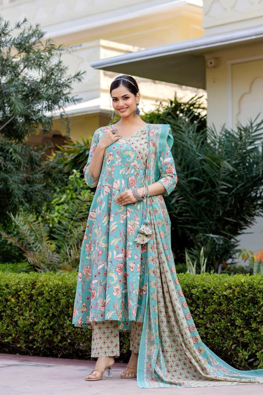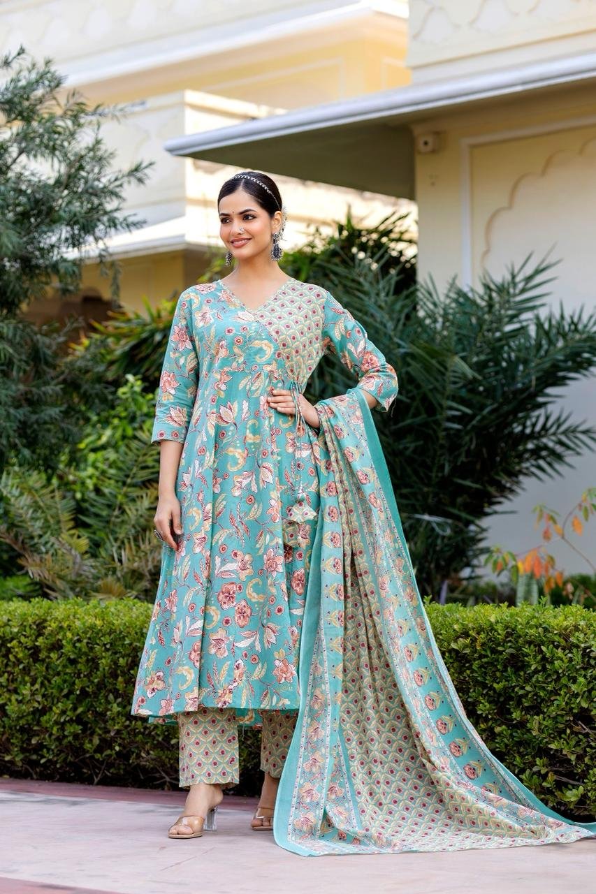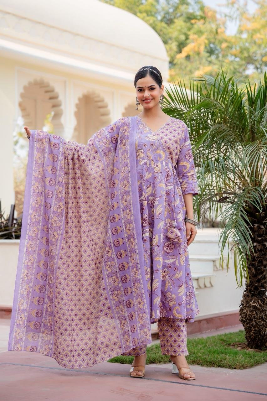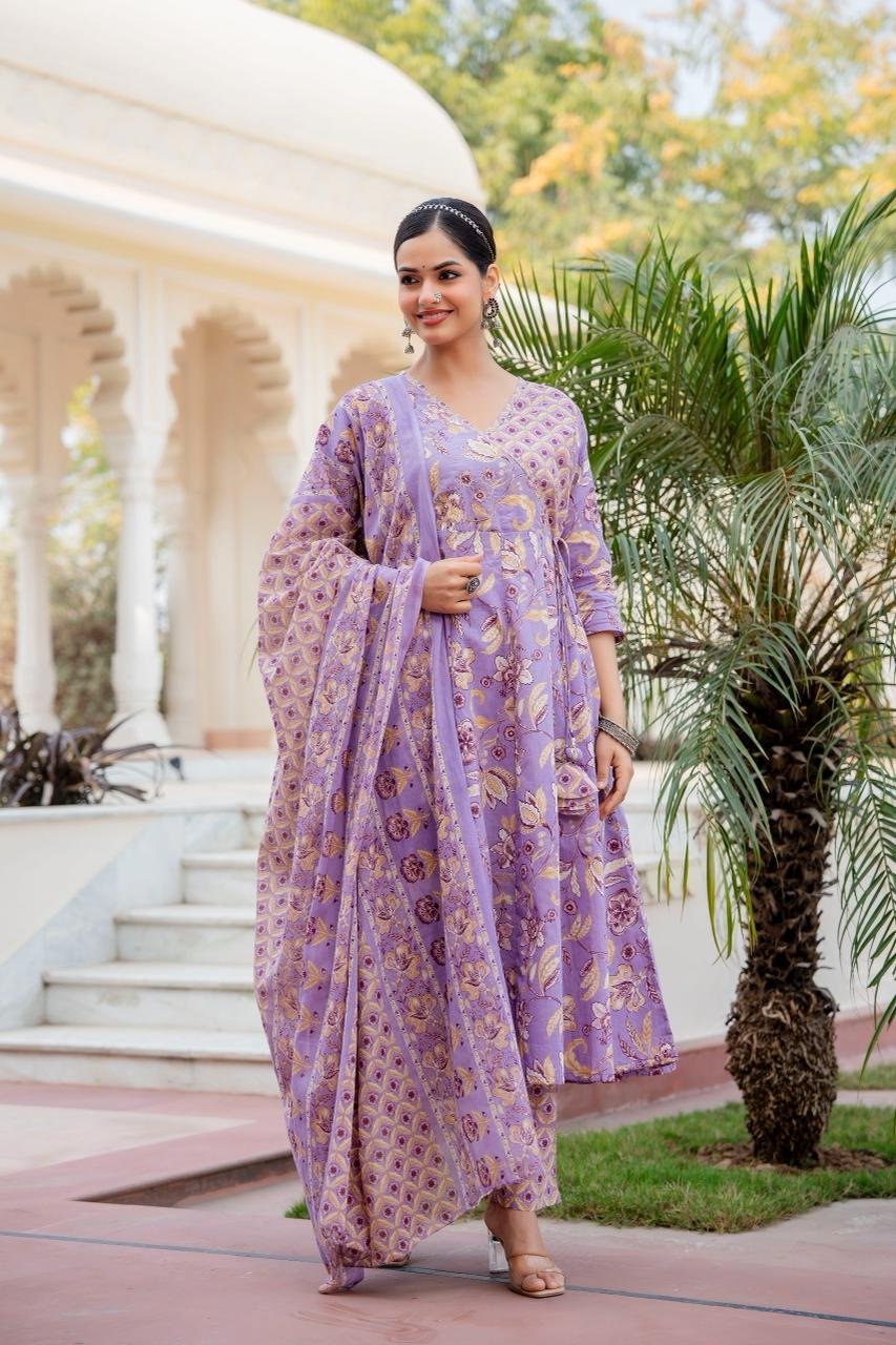 The AK-104 Angrakha Anarkali 3PC Set is designed for women who love timeless ethnic silhouettes with all-day comfort. Crafted from pure cotton fabric, this set offers a soft, breathable feel, perfect for warm weather and long wear.
