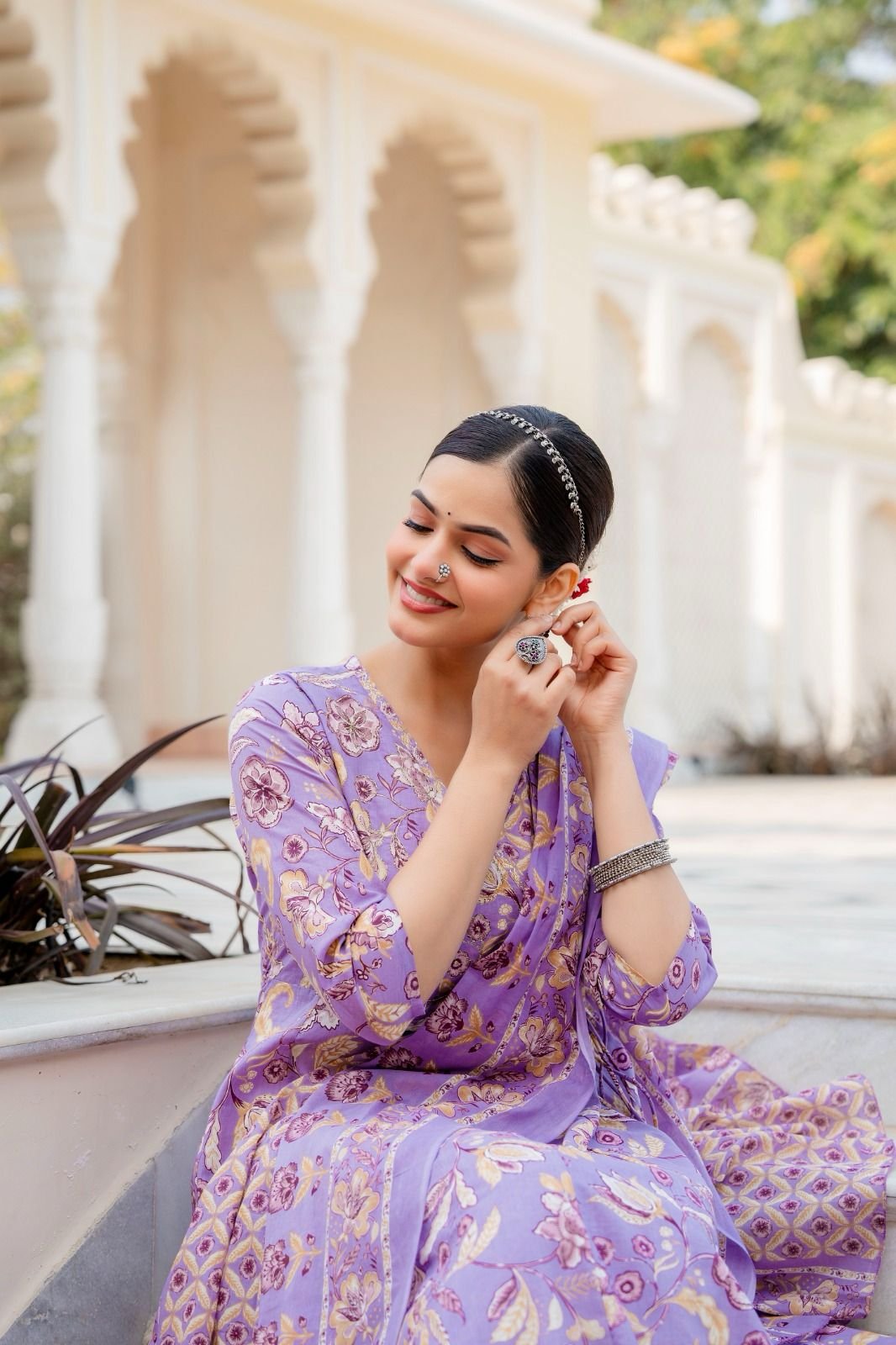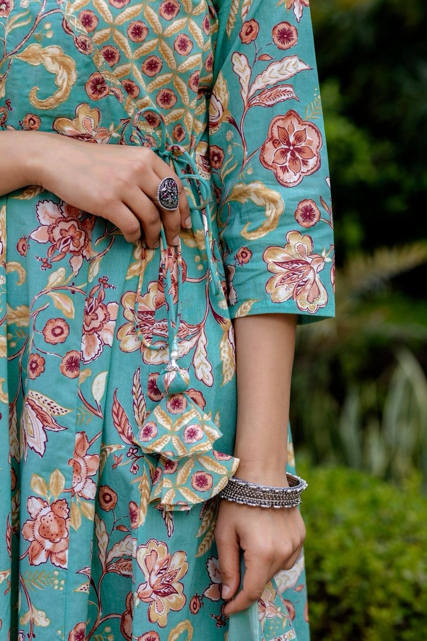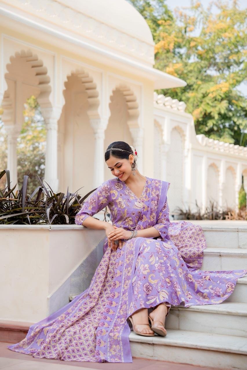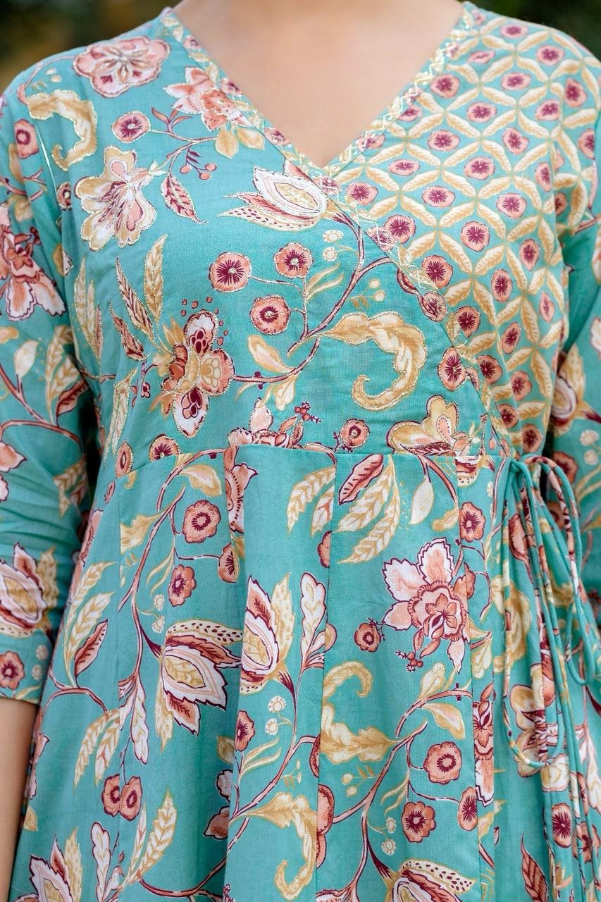 Featuring a traditional Angrakha-style Anarkali, the kurta is enhanced with change work detailing and a graceful 12-kali flare, creating a beautifully flowing silhouette. Ideal for festive celebrations, cultural gatherings, and daytime functions, this ensemble looks elegant in refreshing Sea and Lavender shades.