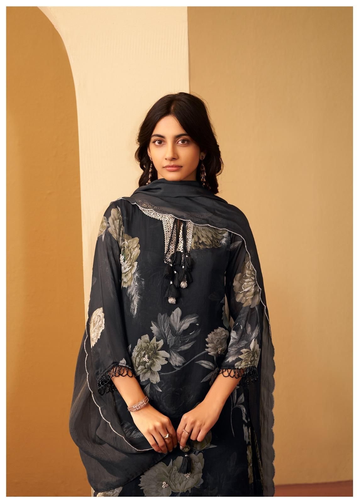 The DU-365 Short Kurta Divider Set is designed for those who appreciate elegance paired with finely crafted details. The short kurta features a beautifully highlighted yoke embellished with sequins, creating a subtle yet eye-catching shimmer that instantly enhances the neckline. The sleeves are enriched with delicate bead detailing, adding a touch of artistic charm while maintaining a graceful, refined look.