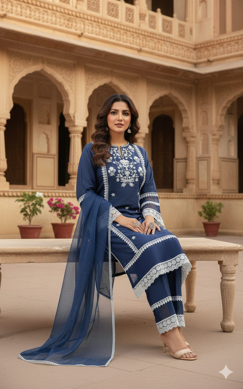 The DU-085 Pakistani 3PC Set showcases intricate Chikankari embroidery combined with elegant lace work on rich Roman silk fabric. The design reflects classic Pakistani aesthetics with a graceful, refined finish.