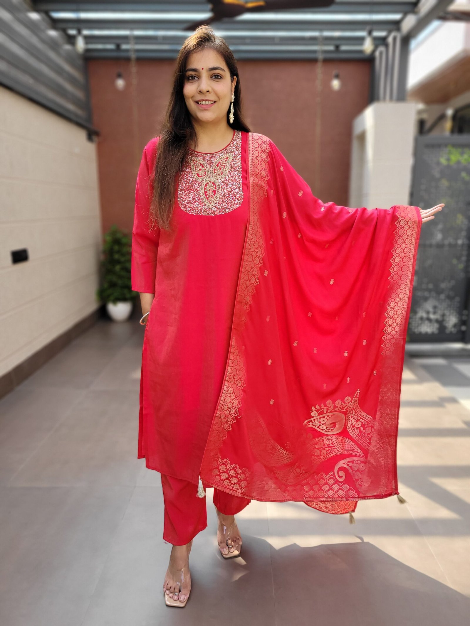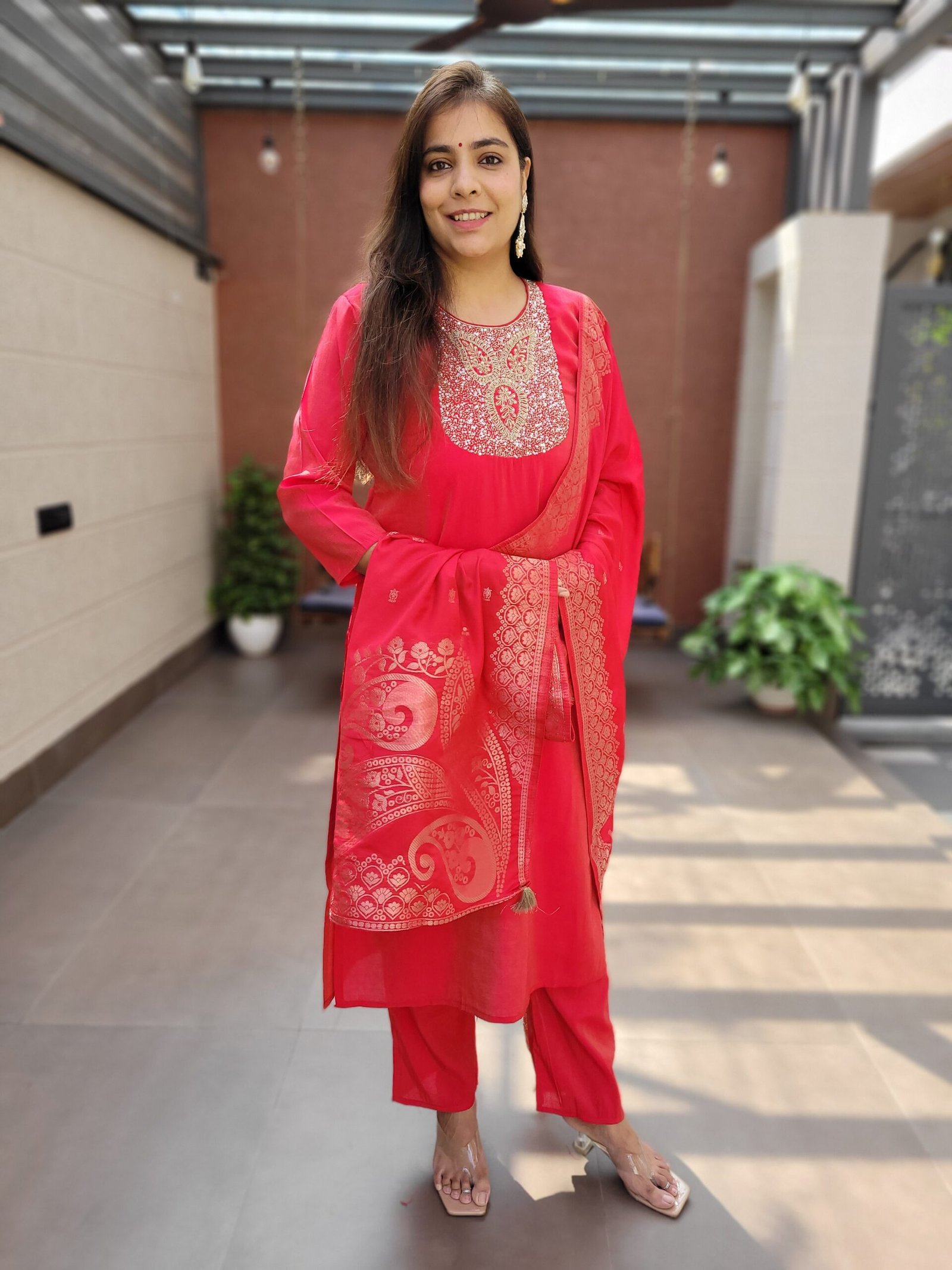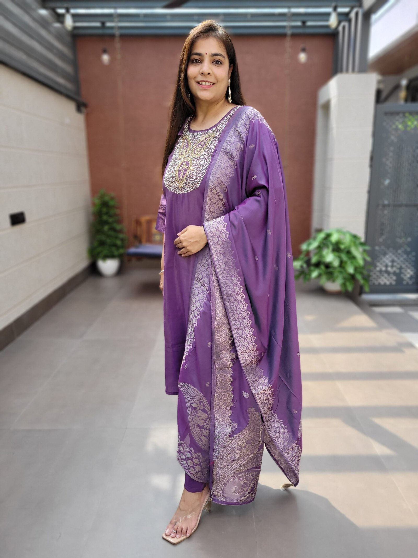 The PW-146 Heavy Handwork Partywear 3PC Suit Set is crafted from luxurious Roman shimmer fabric, offering a radiant and graceful drape. The kurta is adorned with intricate beads and sequins work, complemented by a soft lining and a rich Banarasi dupatta, creating a perfect festive or party-ready look.