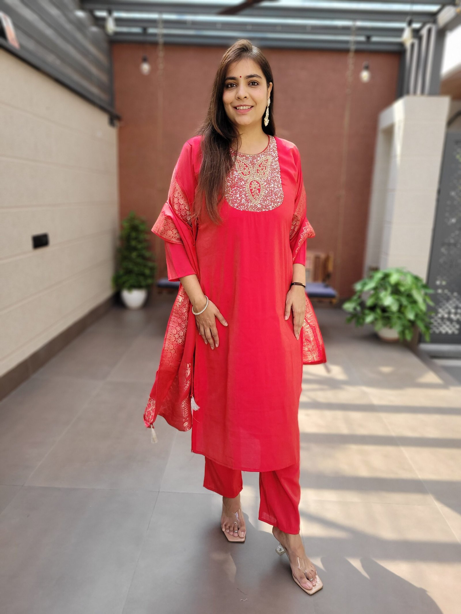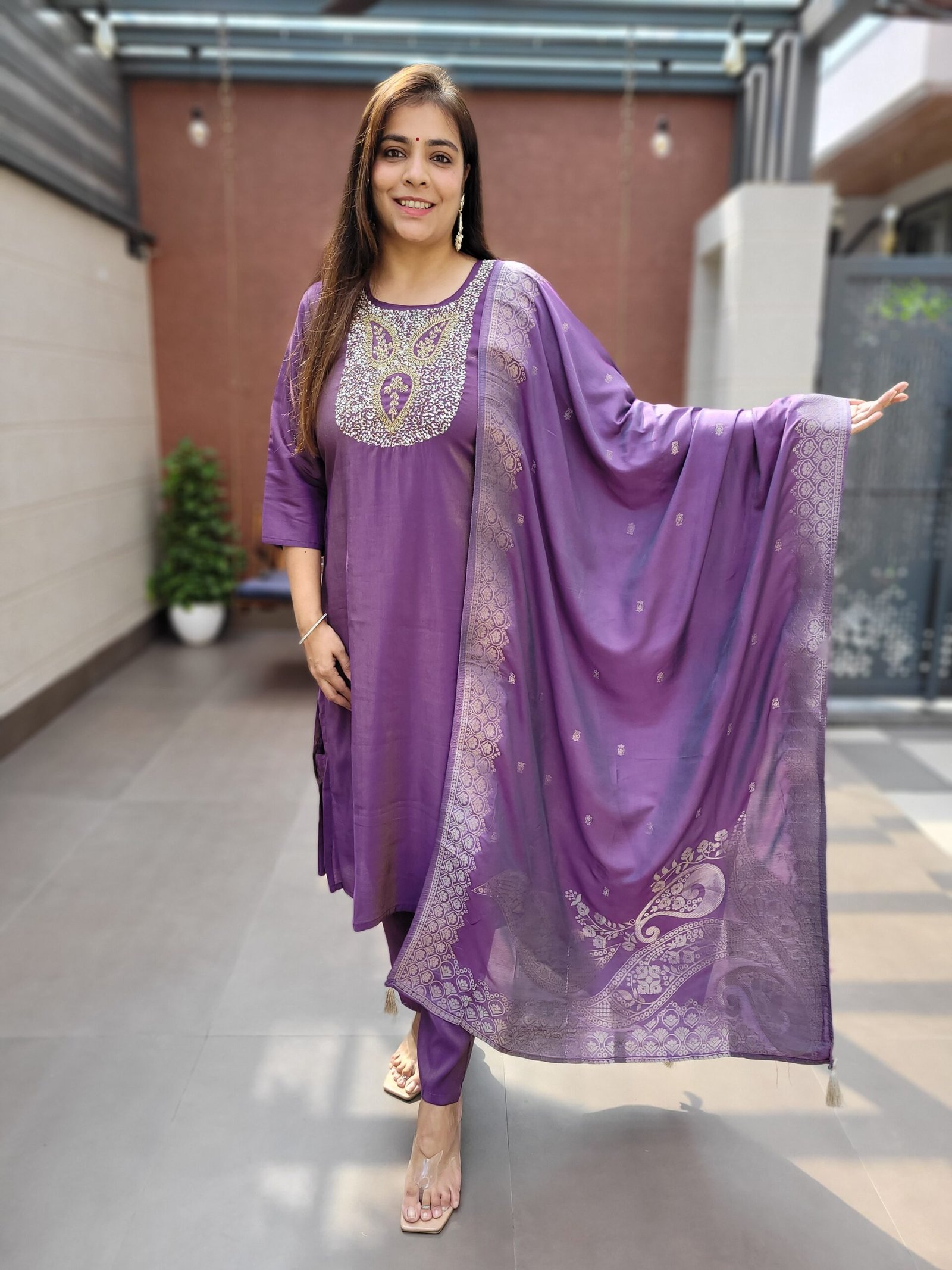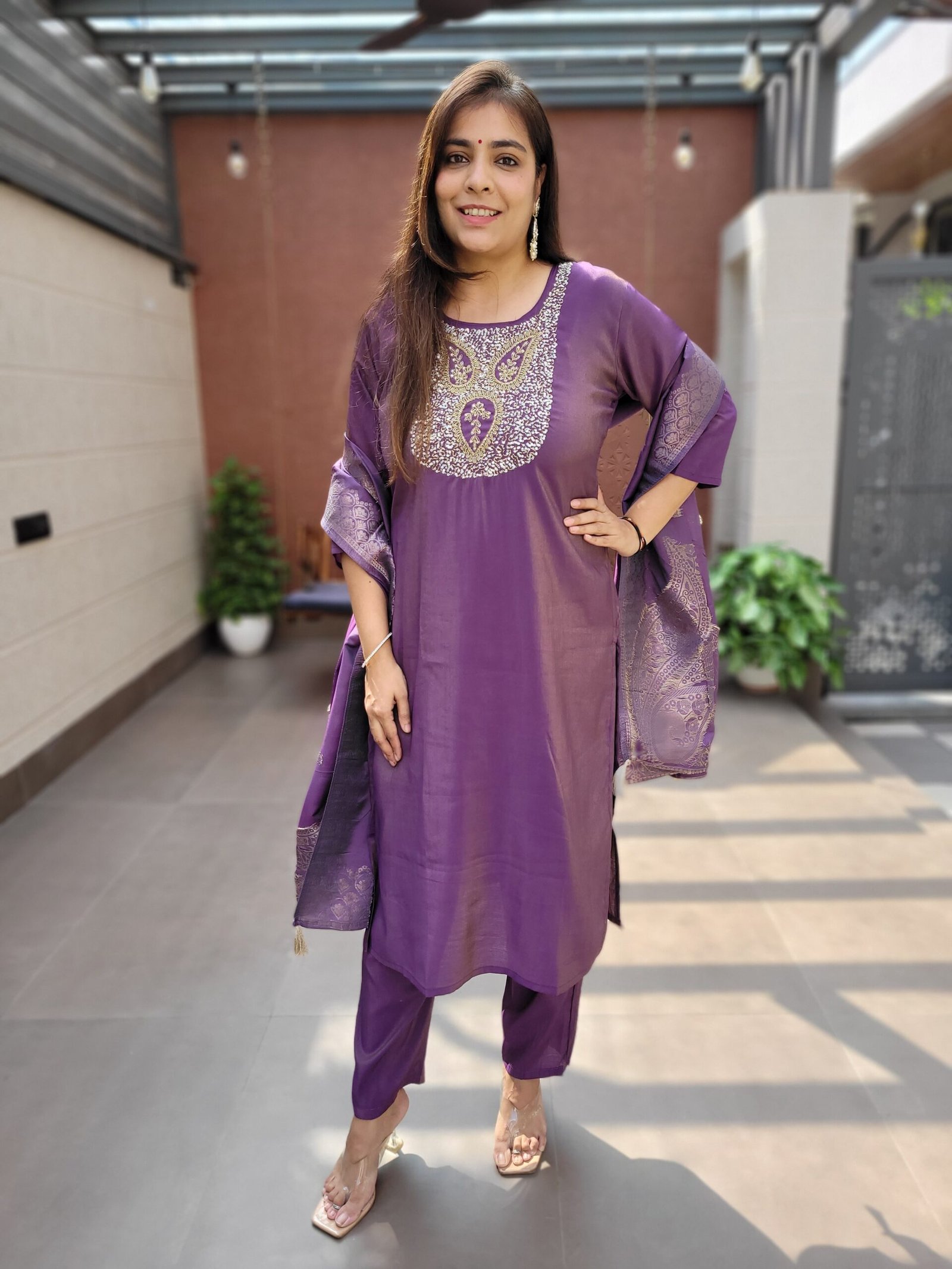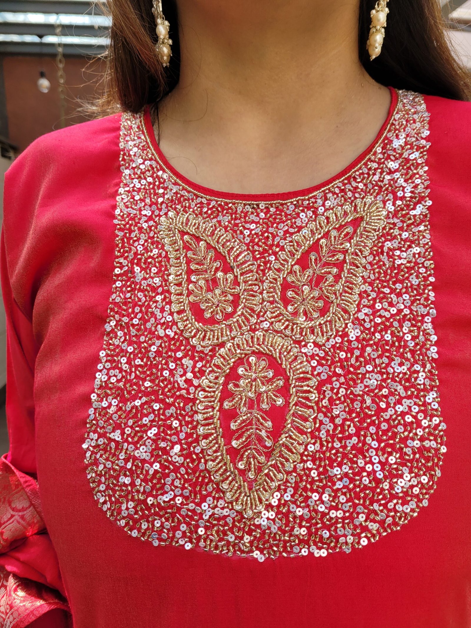 The PW-146 Heavy Handwork Partywear 3PC Suit Set is crafted from luxurious Roman shimmer fabric, offering a radiant and graceful drape. The kurta is adorned with intricate beads and sequins work, complemented by a soft lining and a rich Banarasi dupatta, creating a perfect festive or party-ready look.