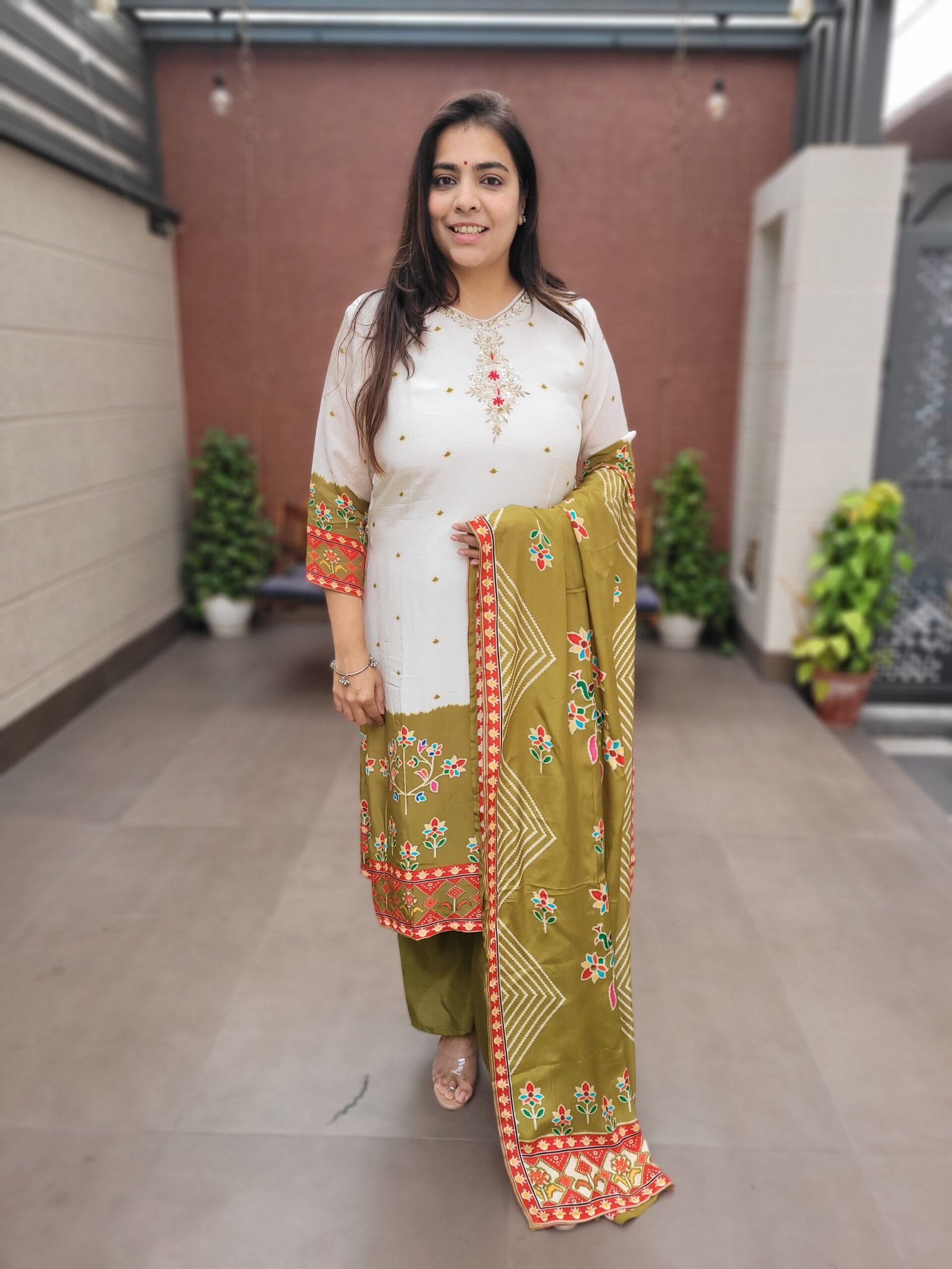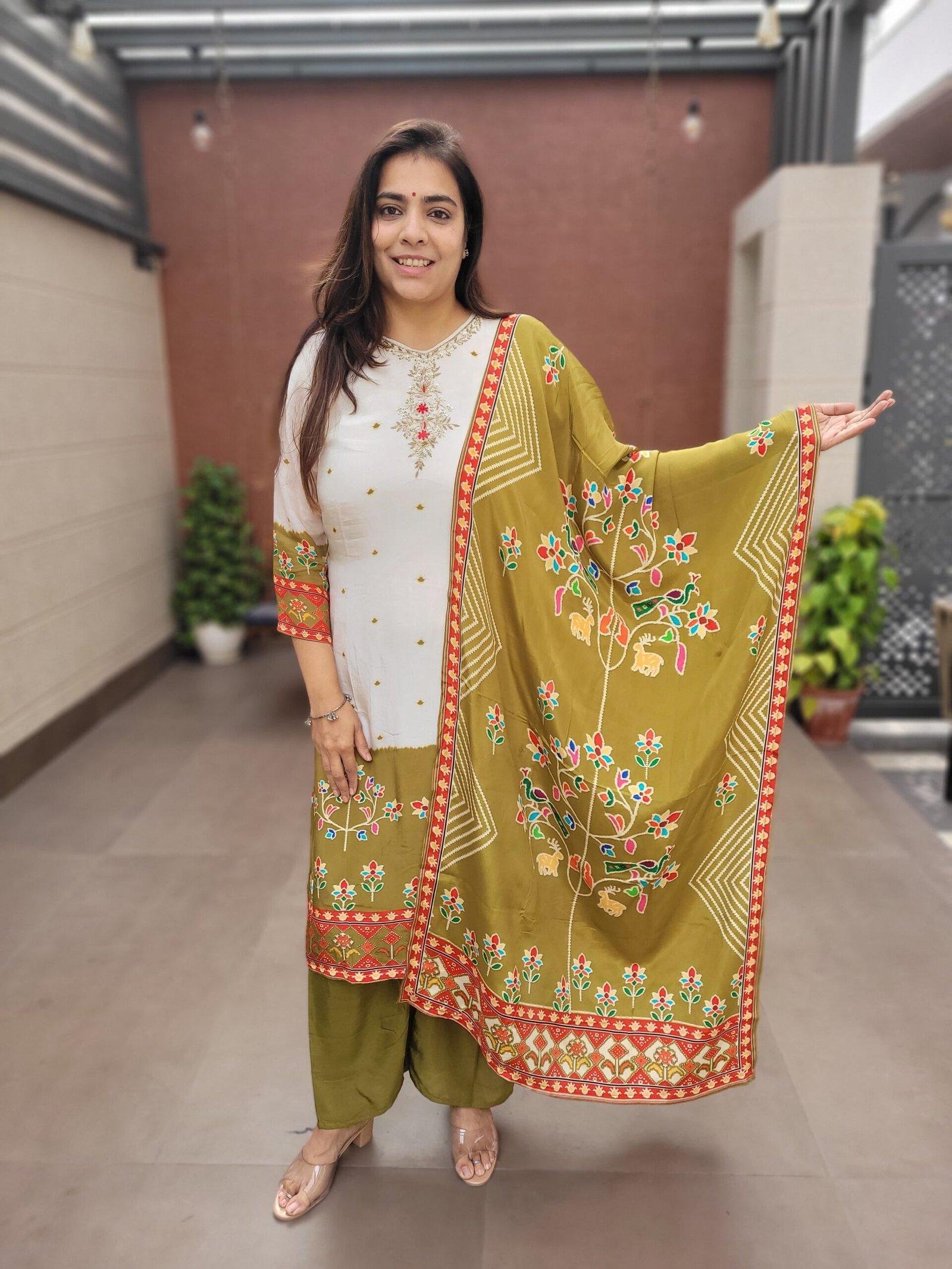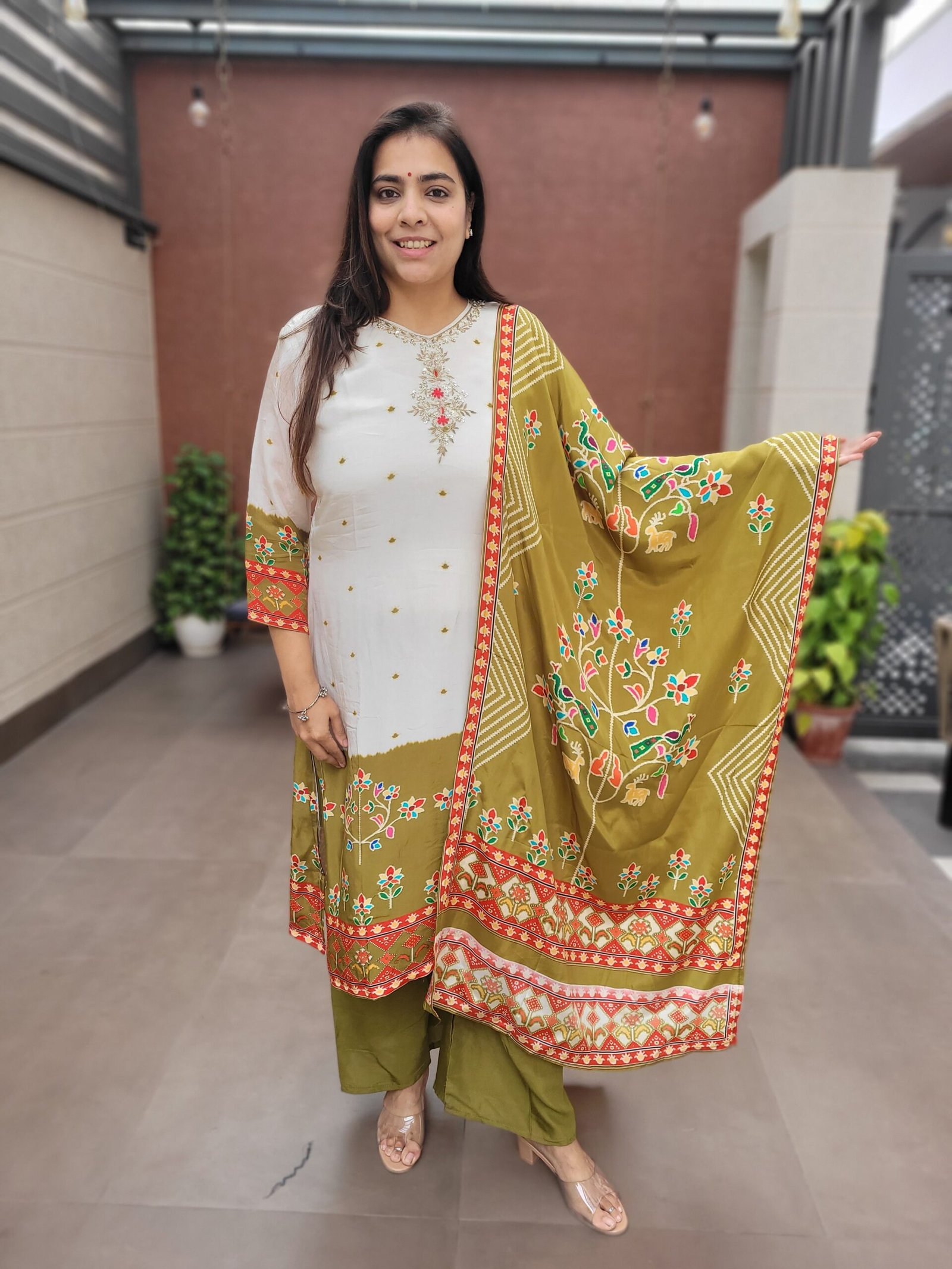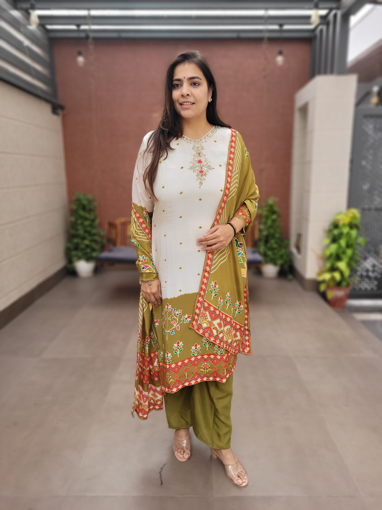 The DU-109 Patola 3PC Suit Set is designed for women who love statement ethnic wear with a modern twist. Crafted from luxurious natural crepe fabric, this ensemble offers a fluid drape and refined appearance.