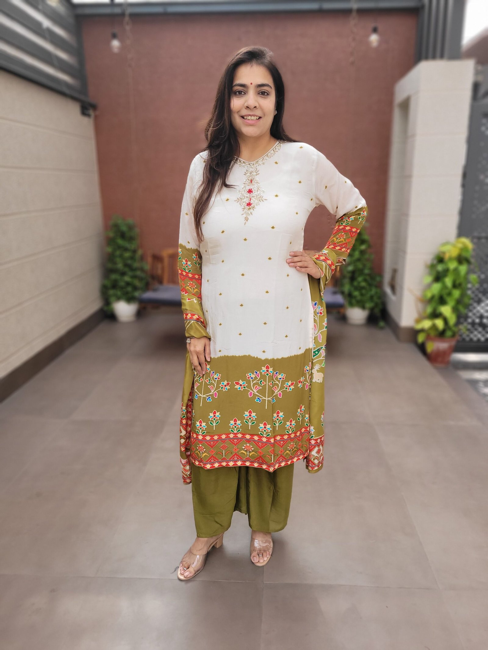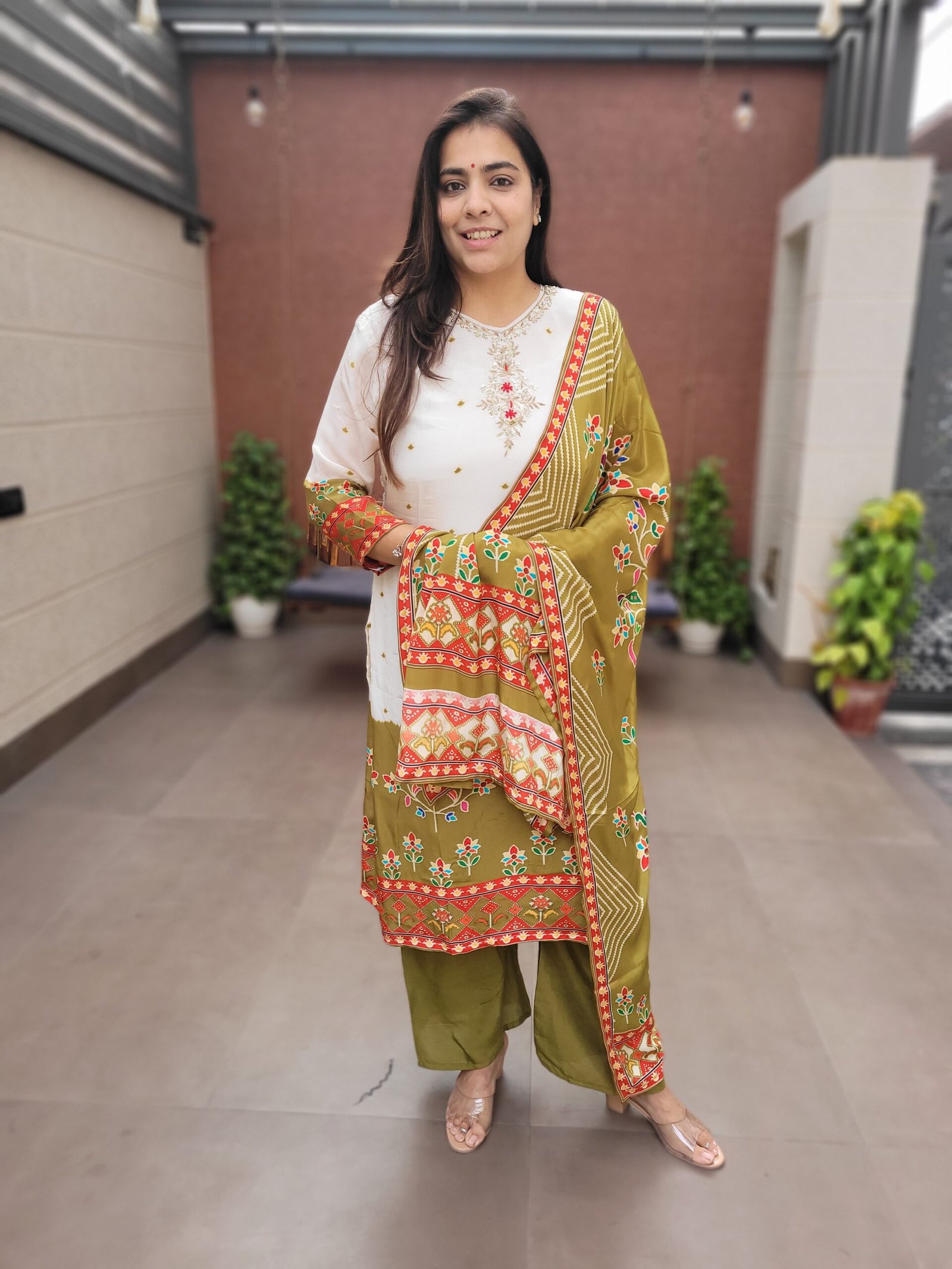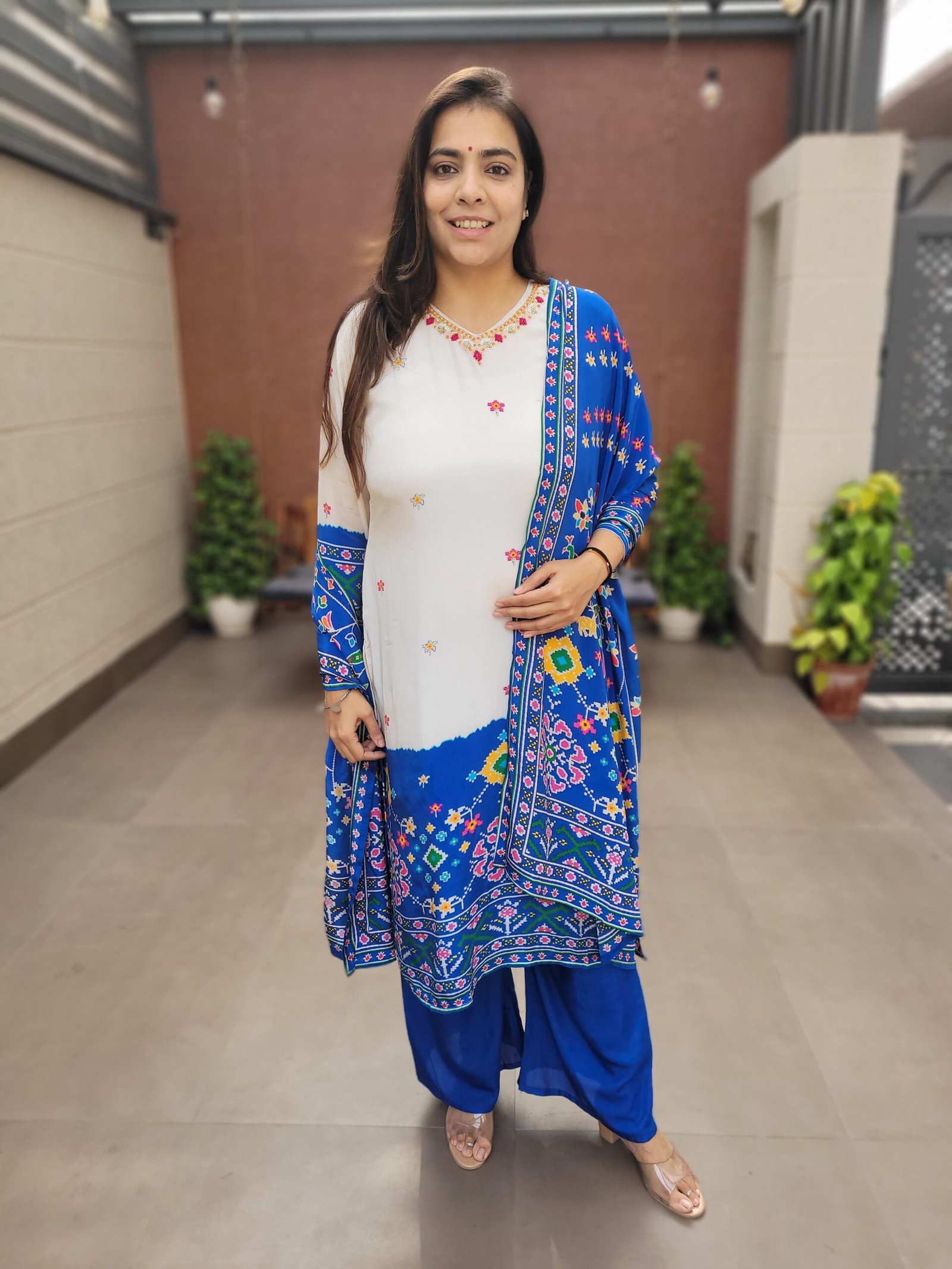 The kurta features delicate handwork on the yoke, beautifully complemented by a stylish ombre Patola print. Paired with a matching natural crepe dupatta, this set is perfect for festive celebrations and elegant evening events.