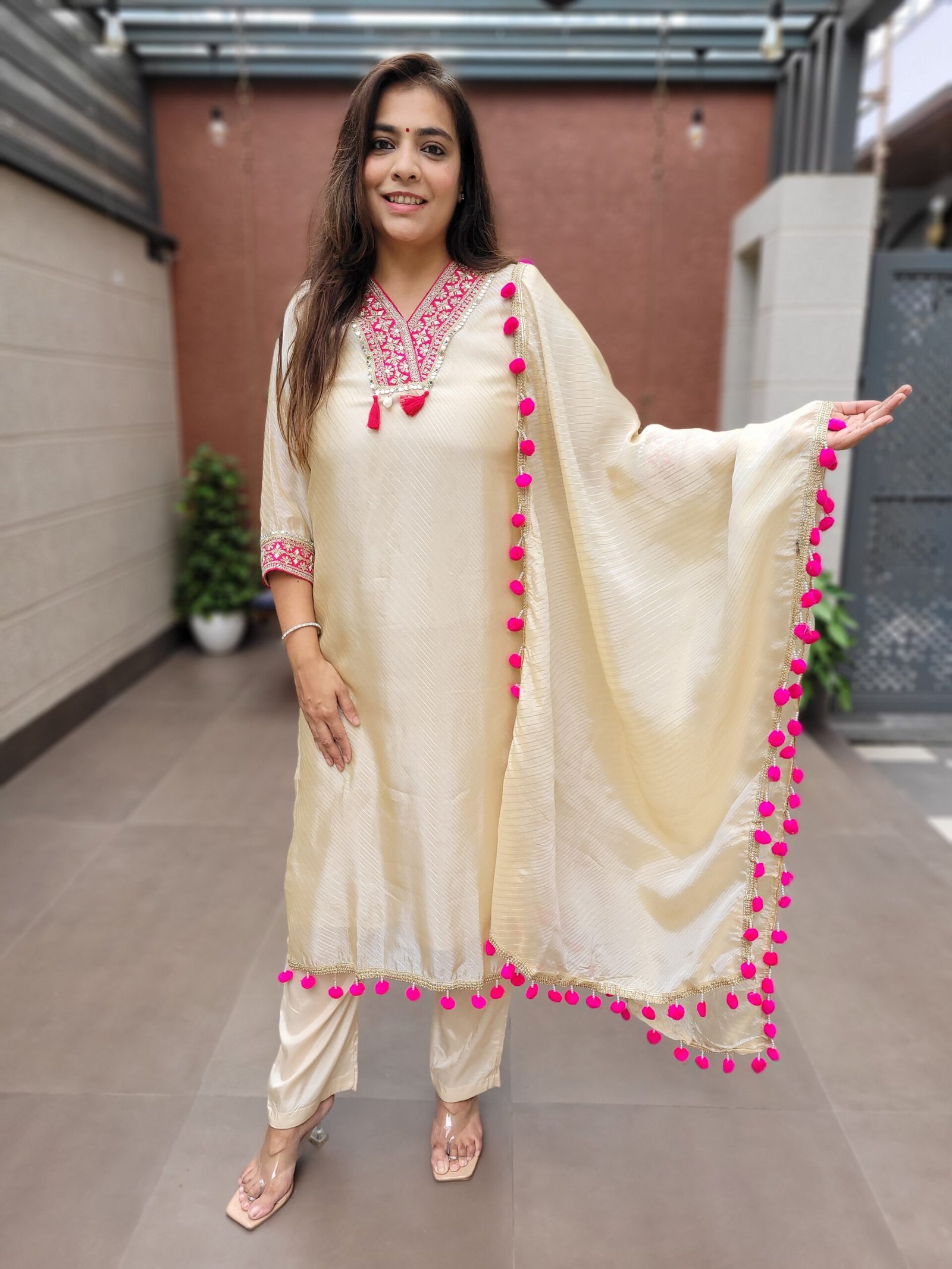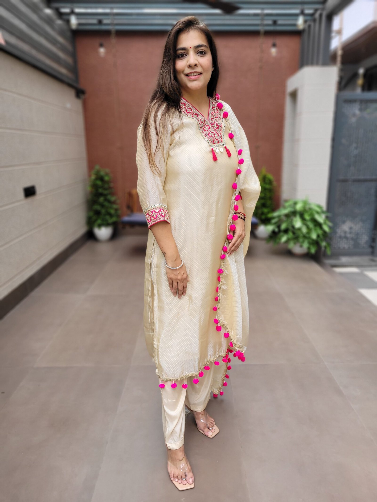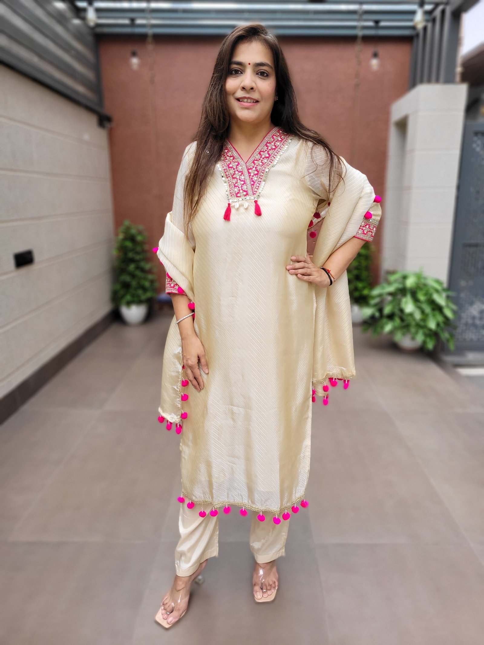 The PW-154 Pom Pom Suit Set is crafted from soft, luxurious tissue shimmer fabric, offering a lightweight and graceful drape. The kurta features intricate zari work, complemented by playful pom pom detailing, paired with a comfortable cotton lining and coordinated bottom for a complete, stylish look.