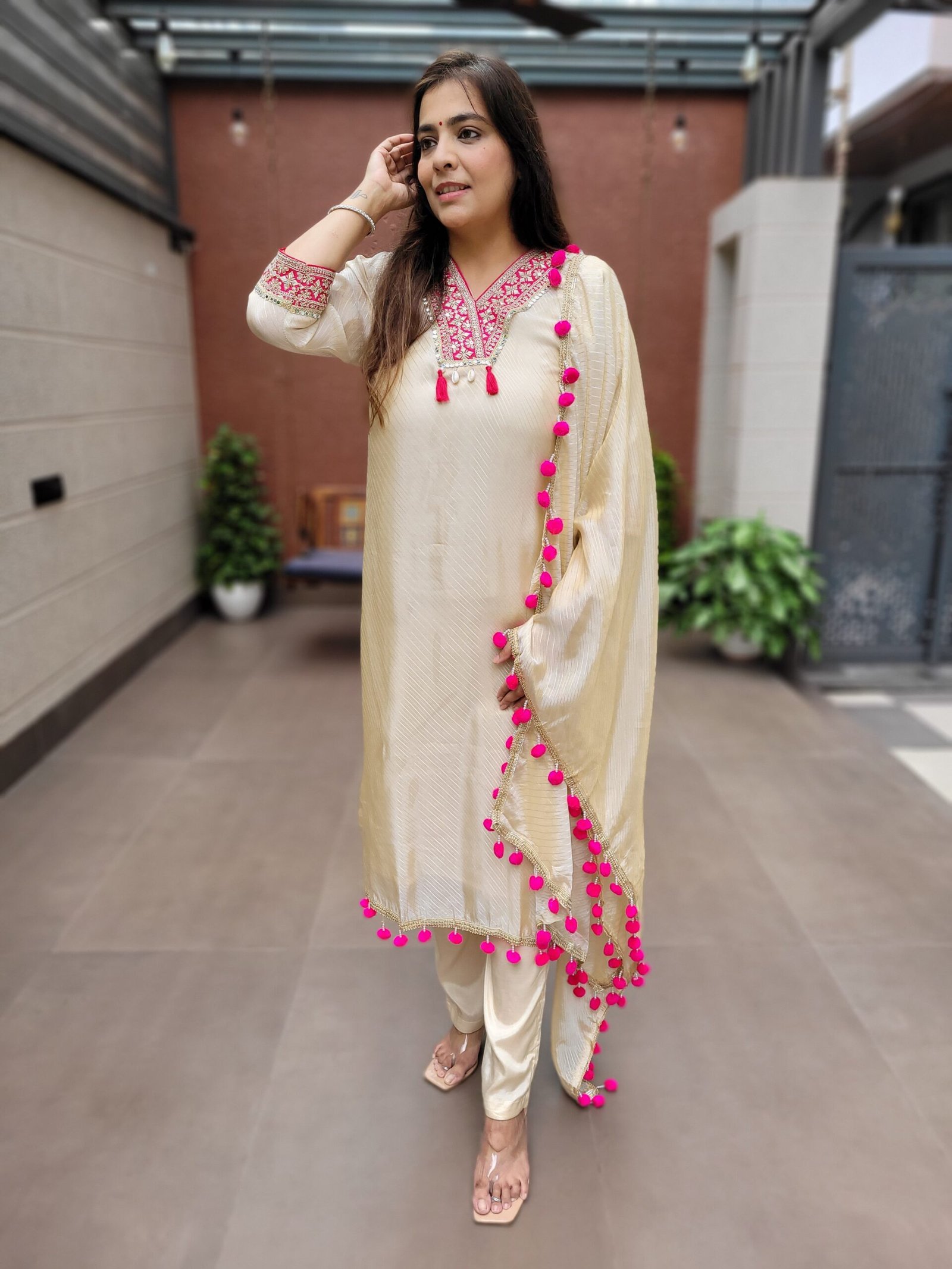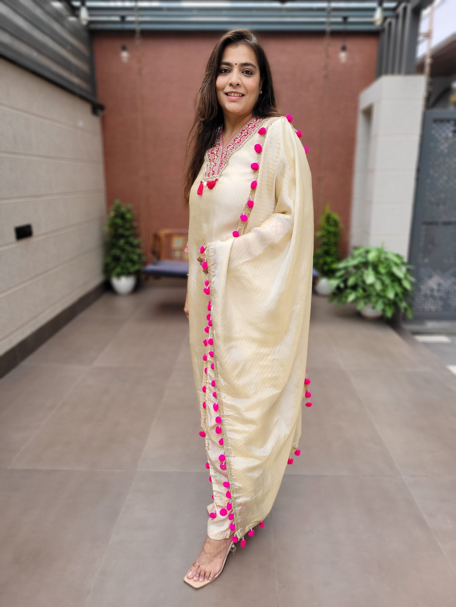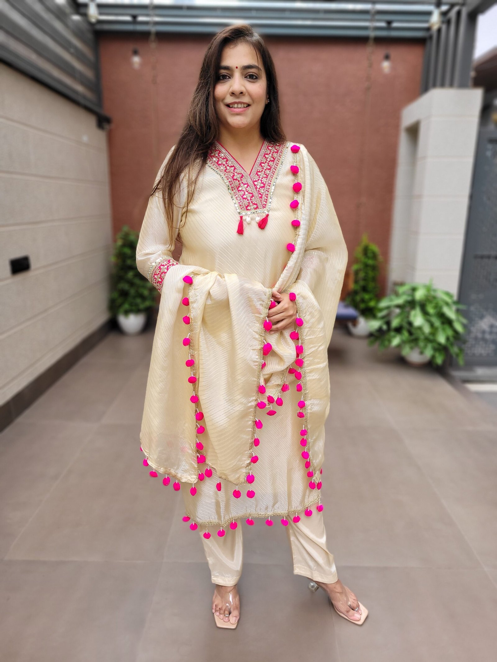 Pom Pom 3PC Suit Set in Tissue Shimmer with Zari Work