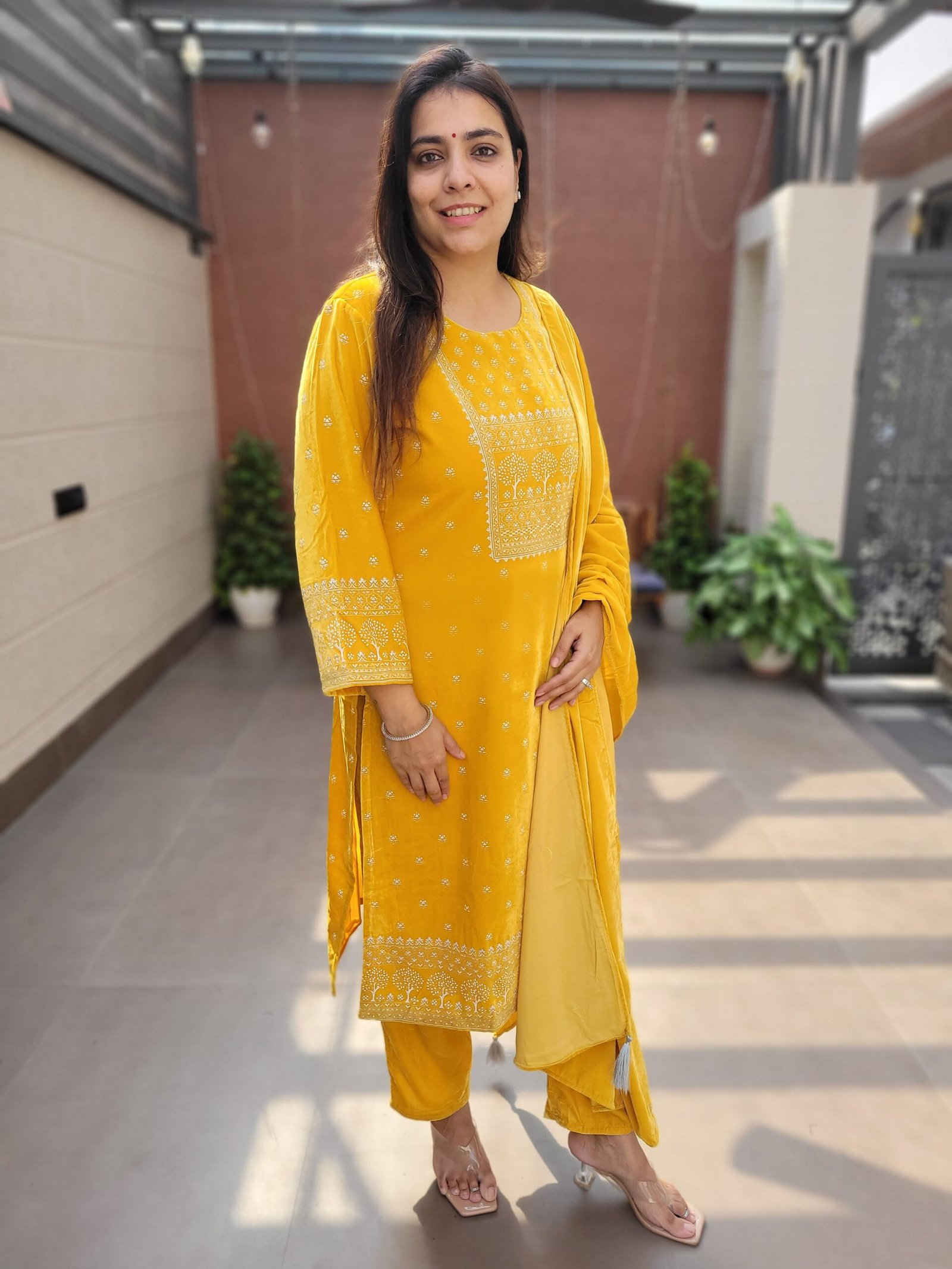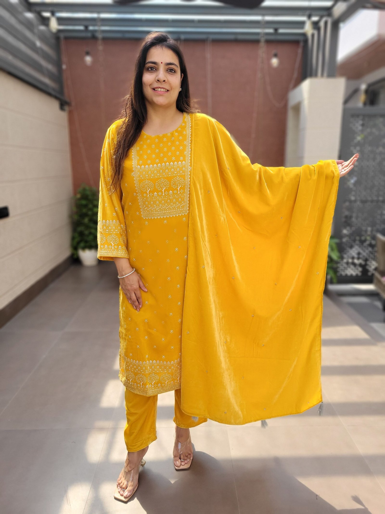 Whether you’re attending a wedding, a festive gathering, or a special occasion, this velvet set ensures you stand out in style. The rich velvet fabric provides warmth, making it an ideal choice for winter celebrations. The printed design enhances the visual appeal, adding uniqueness and personality to your look. The inclusion of lining ensures a perfect fit, giving you comfort and confidence throughout the day.