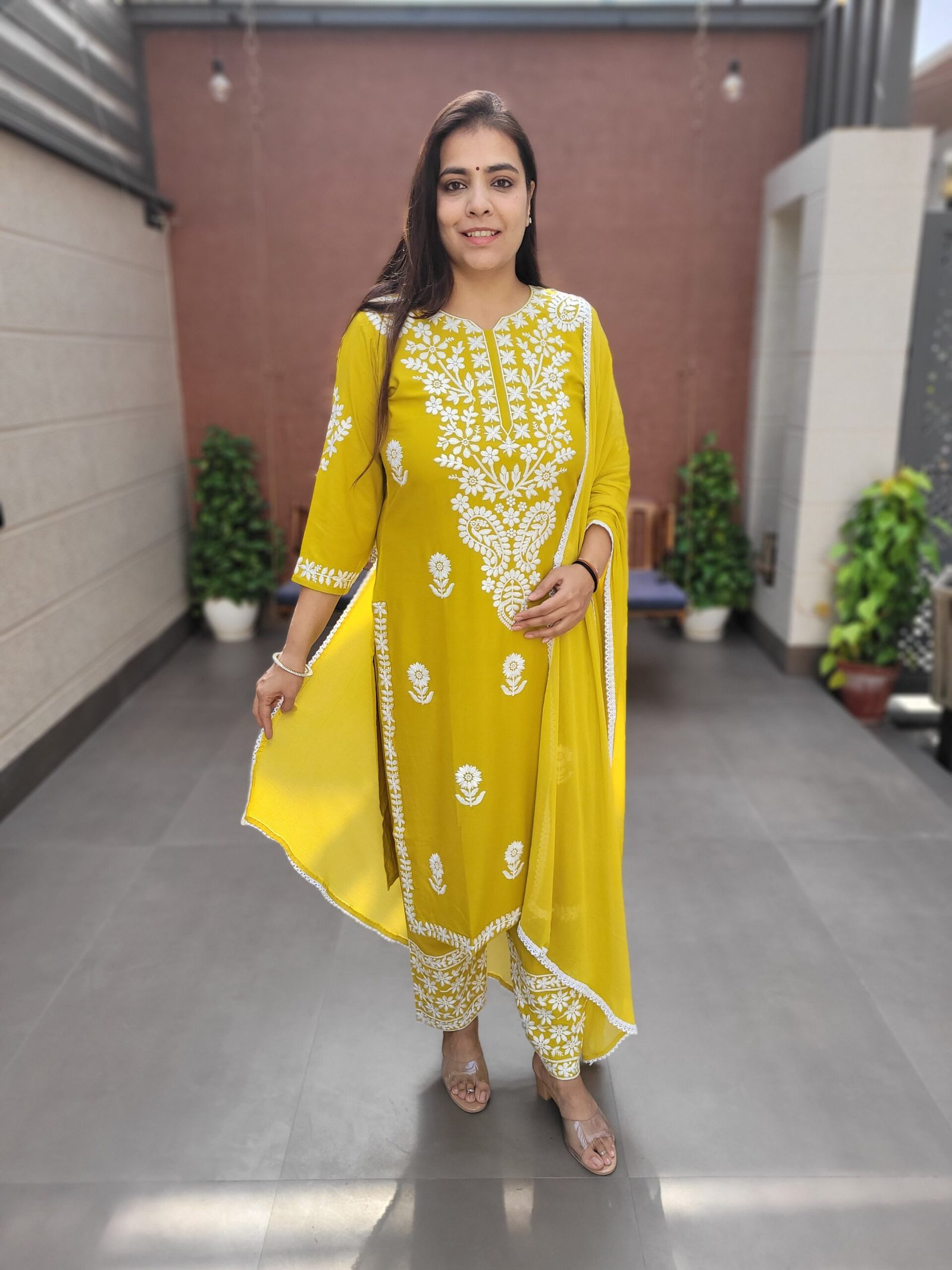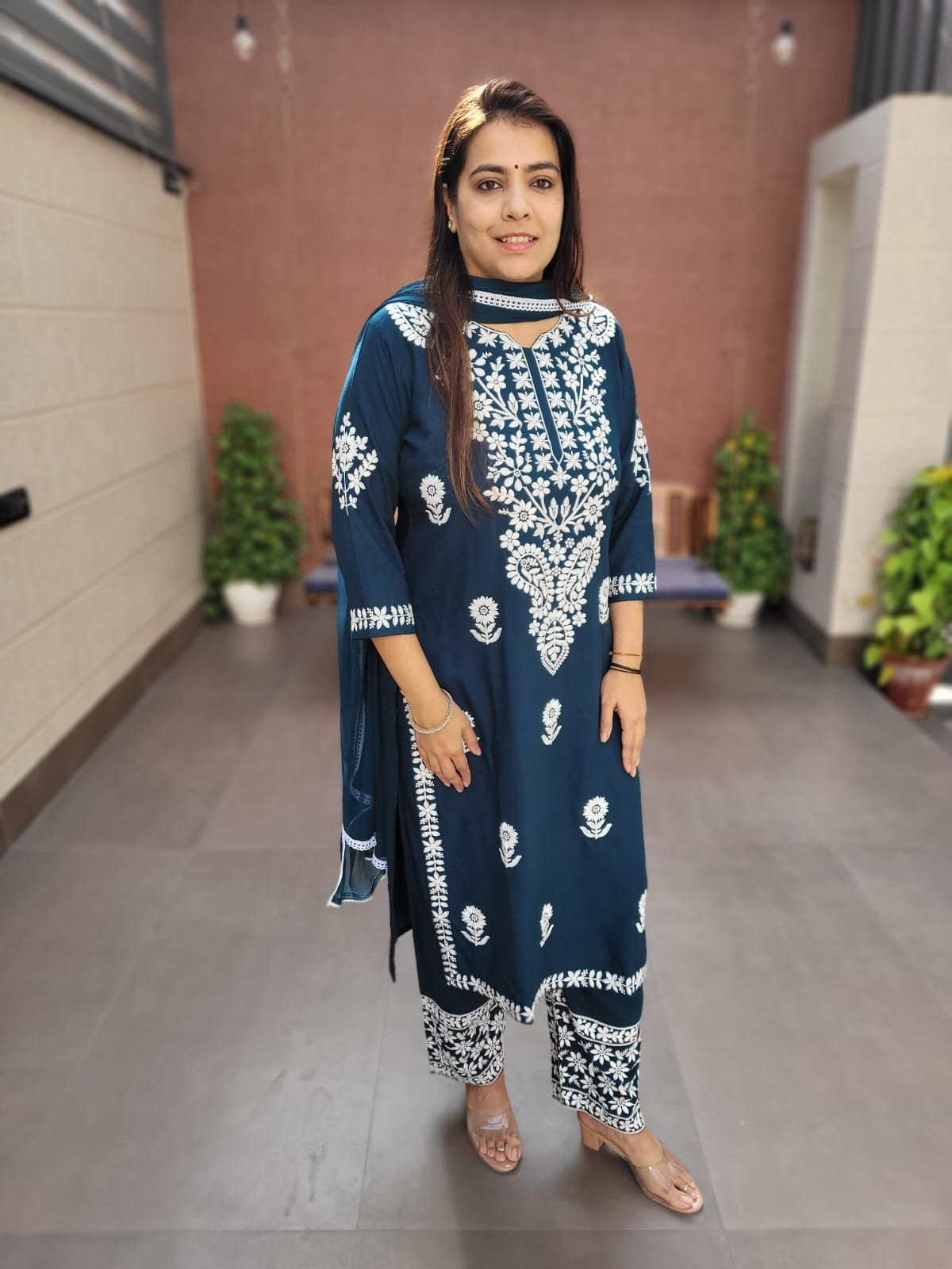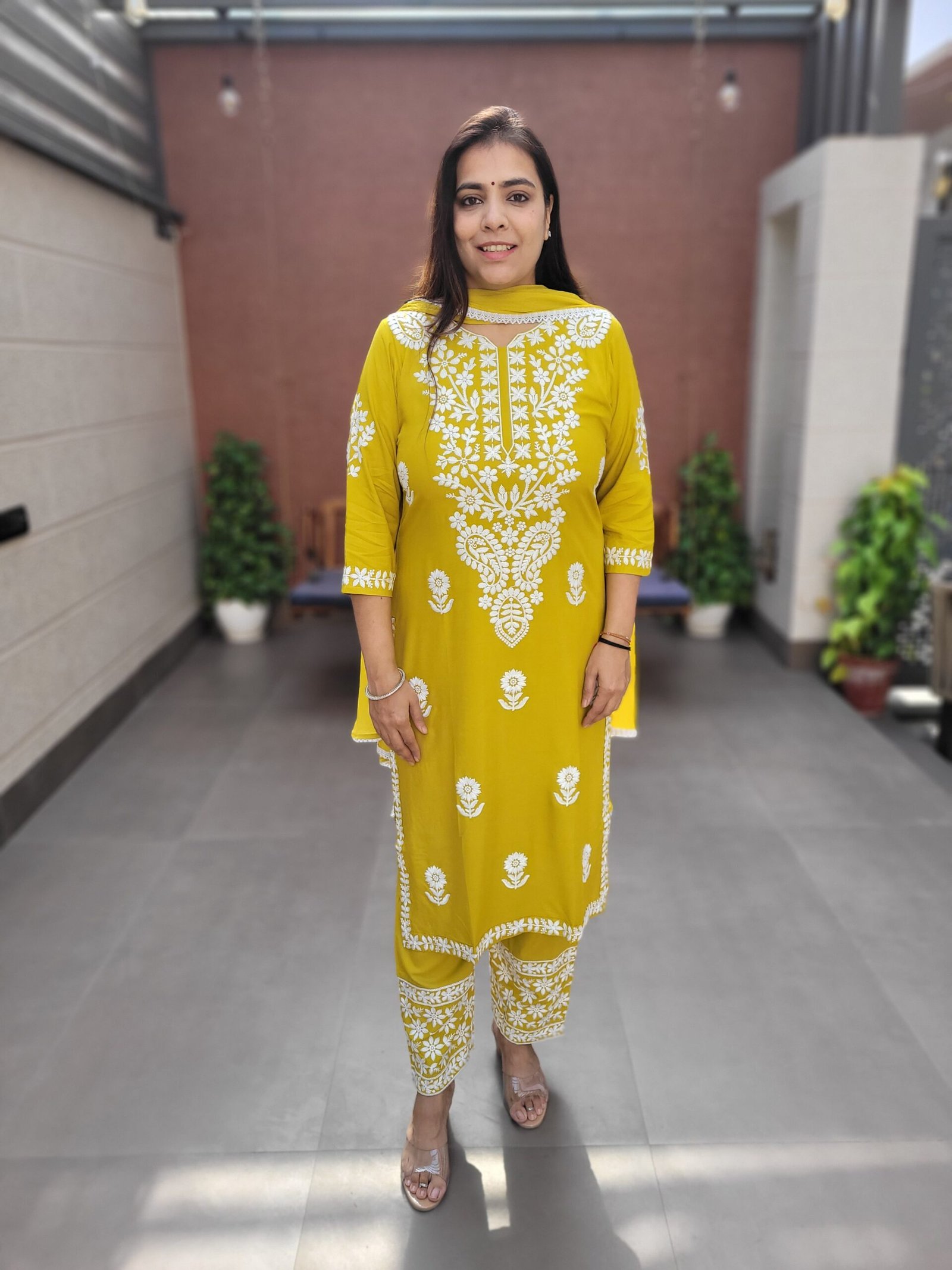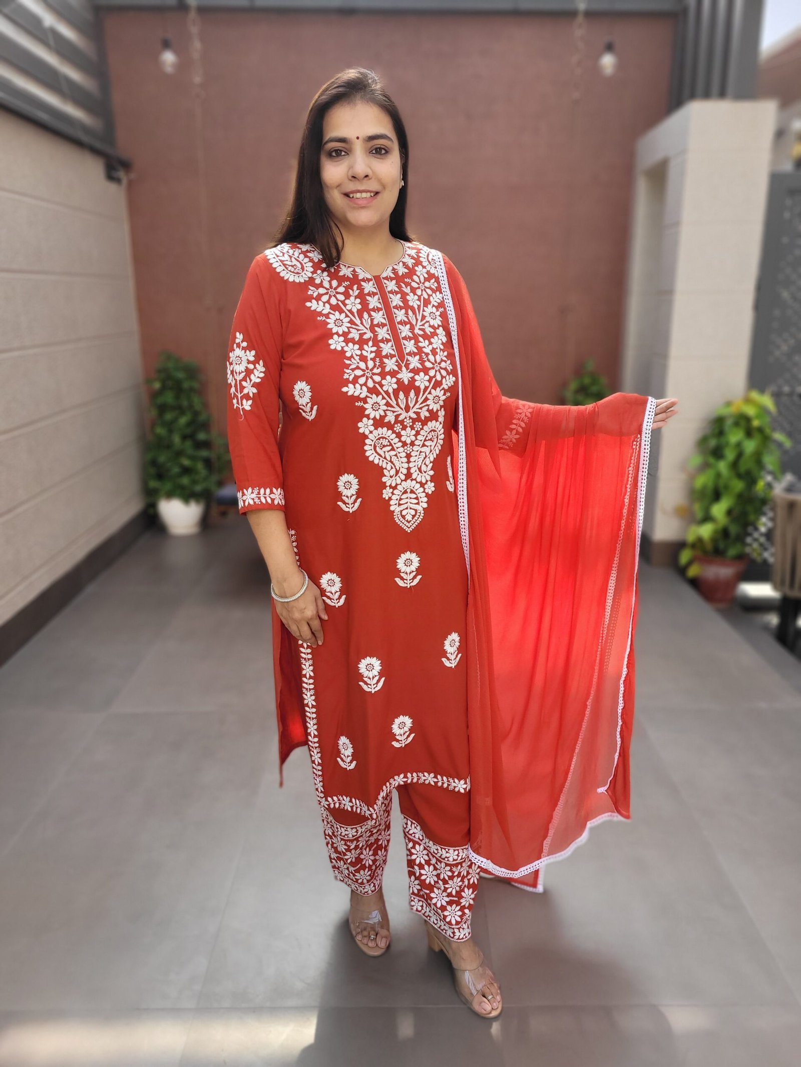 Add a touch of traditional charm to your wardrobe with this Chikanari 3PC Set, made from premium rayon fabric. The intricate Chikanari embroidery on this set enhances its elegance, making it a perfect choice for both casual and semi-formal events. With its soft and breathable fabric, this set ensures comfort all day long while elevating your style quotient.