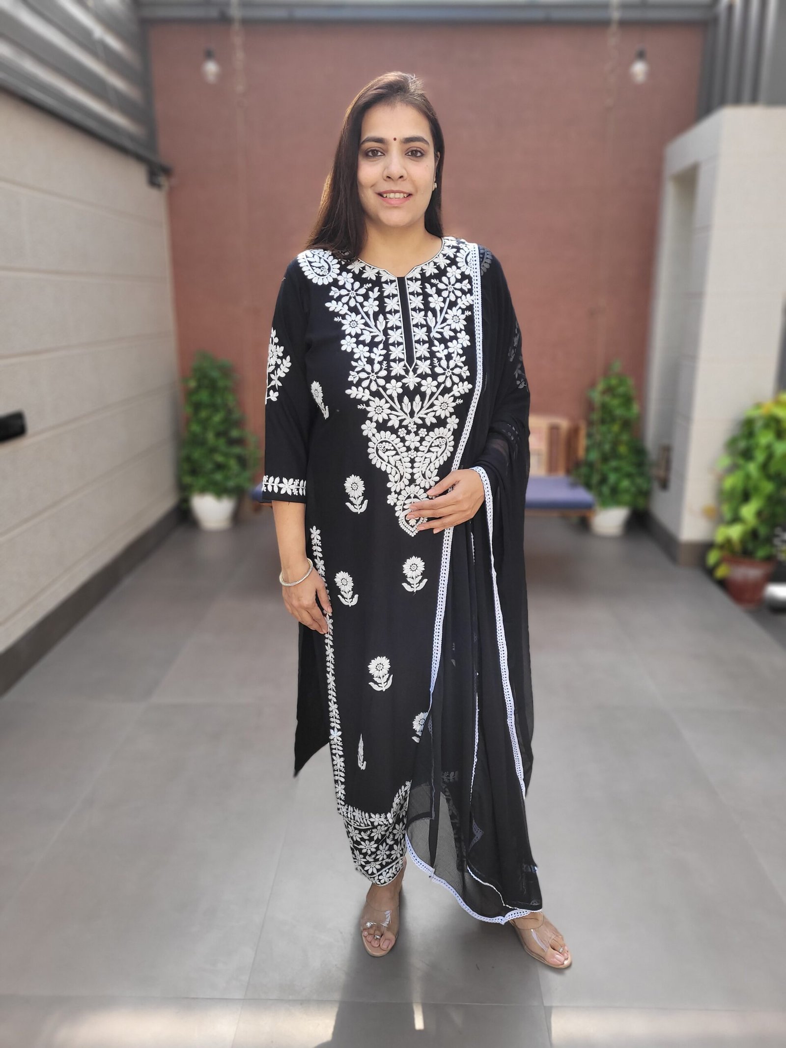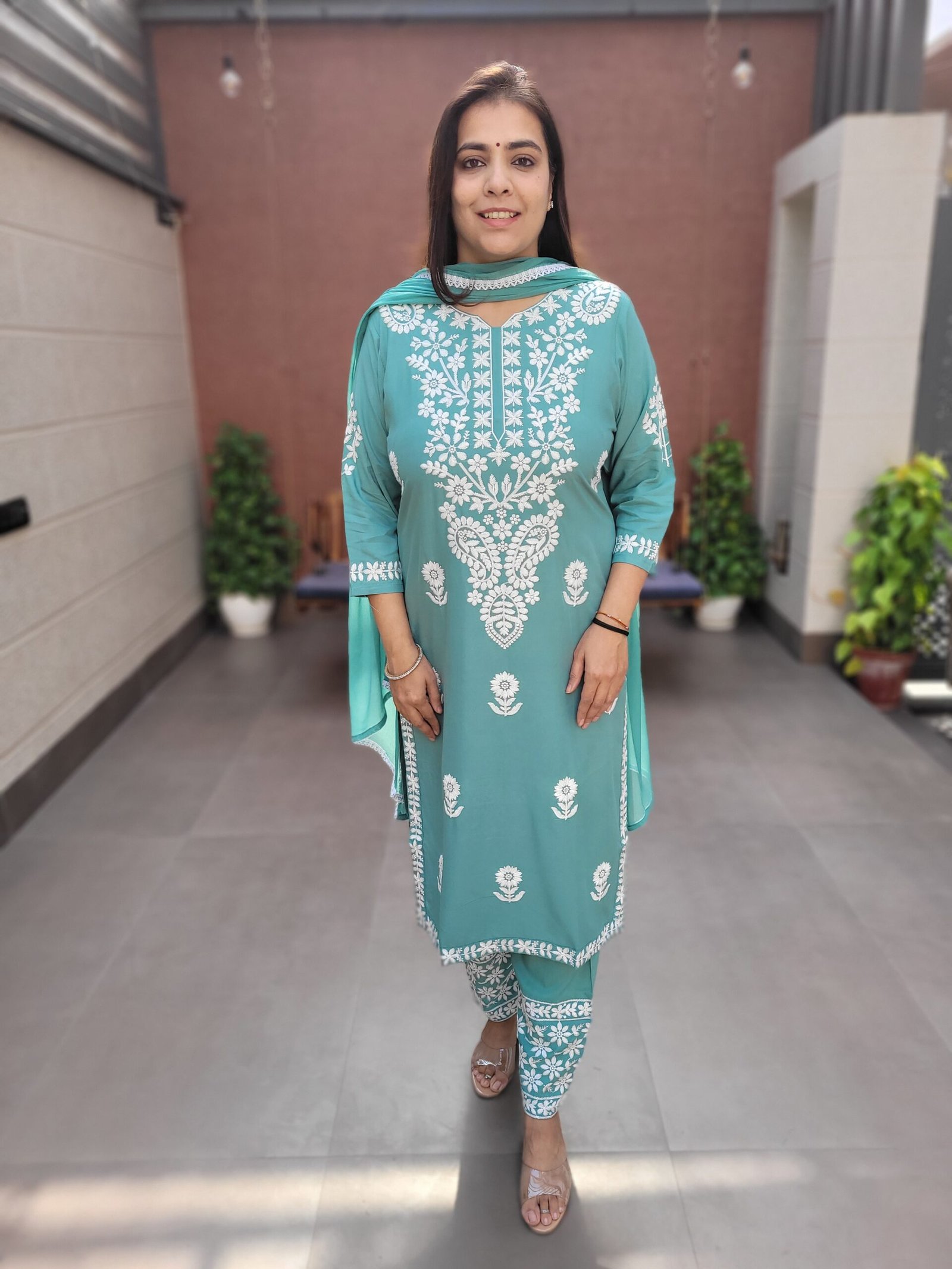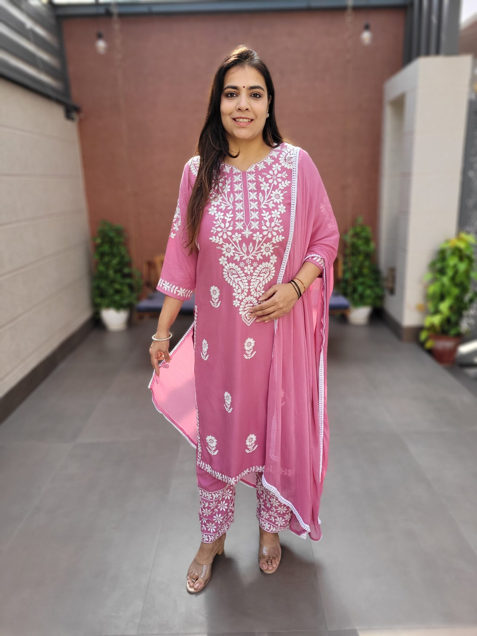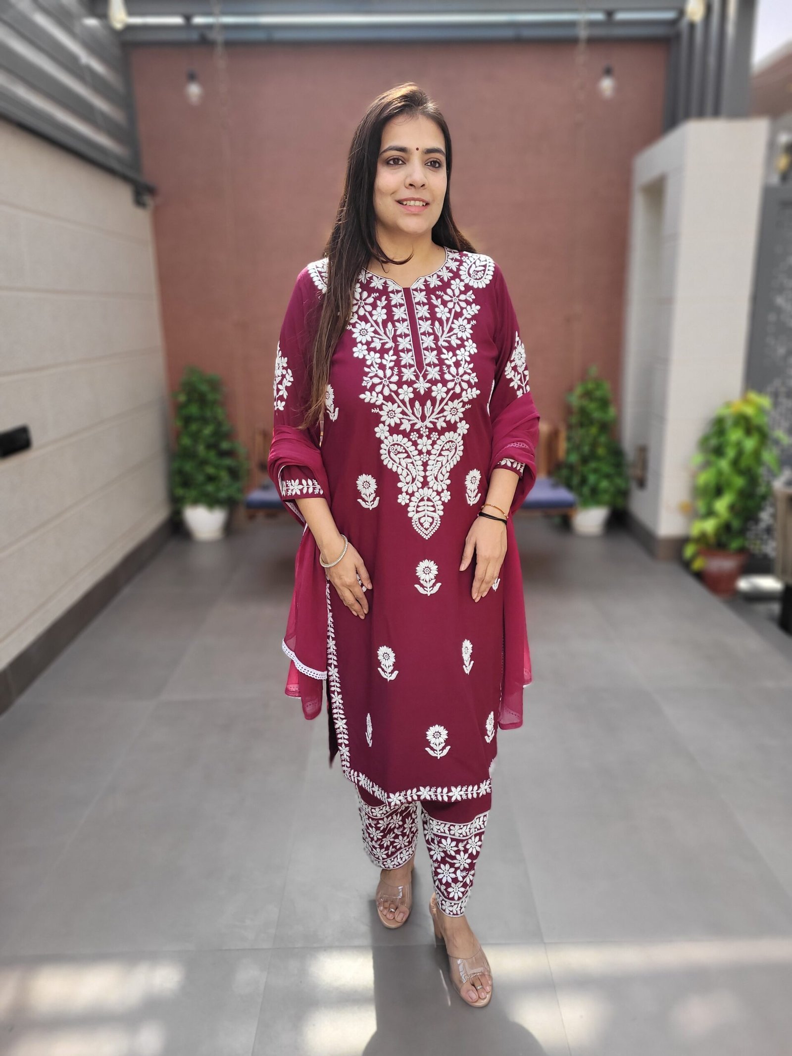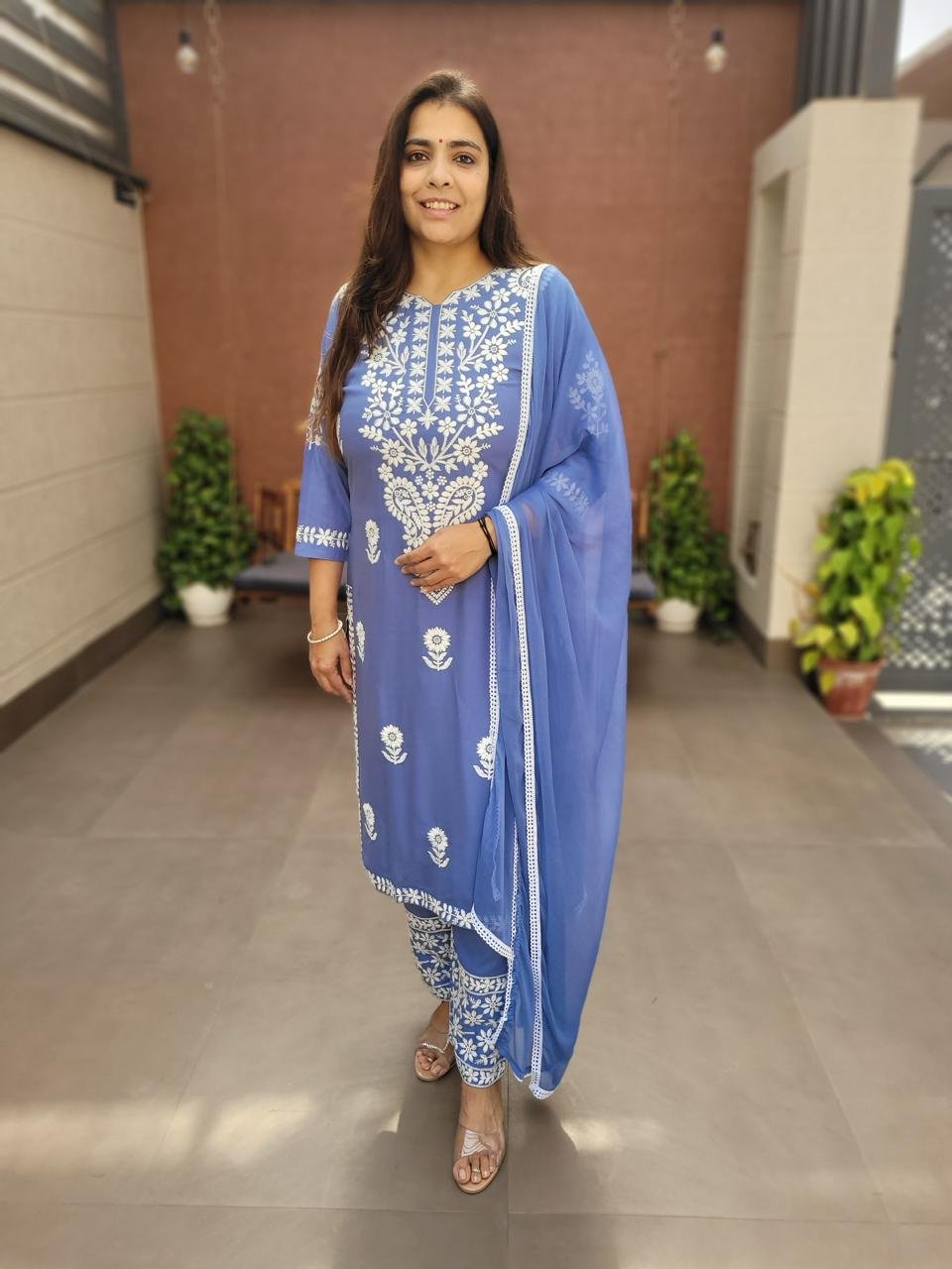 Add a touch of traditional charm to your wardrobe with this Chikanari 3PC Set, made from premium rayon fabric. The intricate Chikanari embroidery on this set enhances its elegance, making it a perfect choice for both casual and semi-formal events. With its soft and breathable fabric, this set ensures comfort all day long while elevating your style quotient.