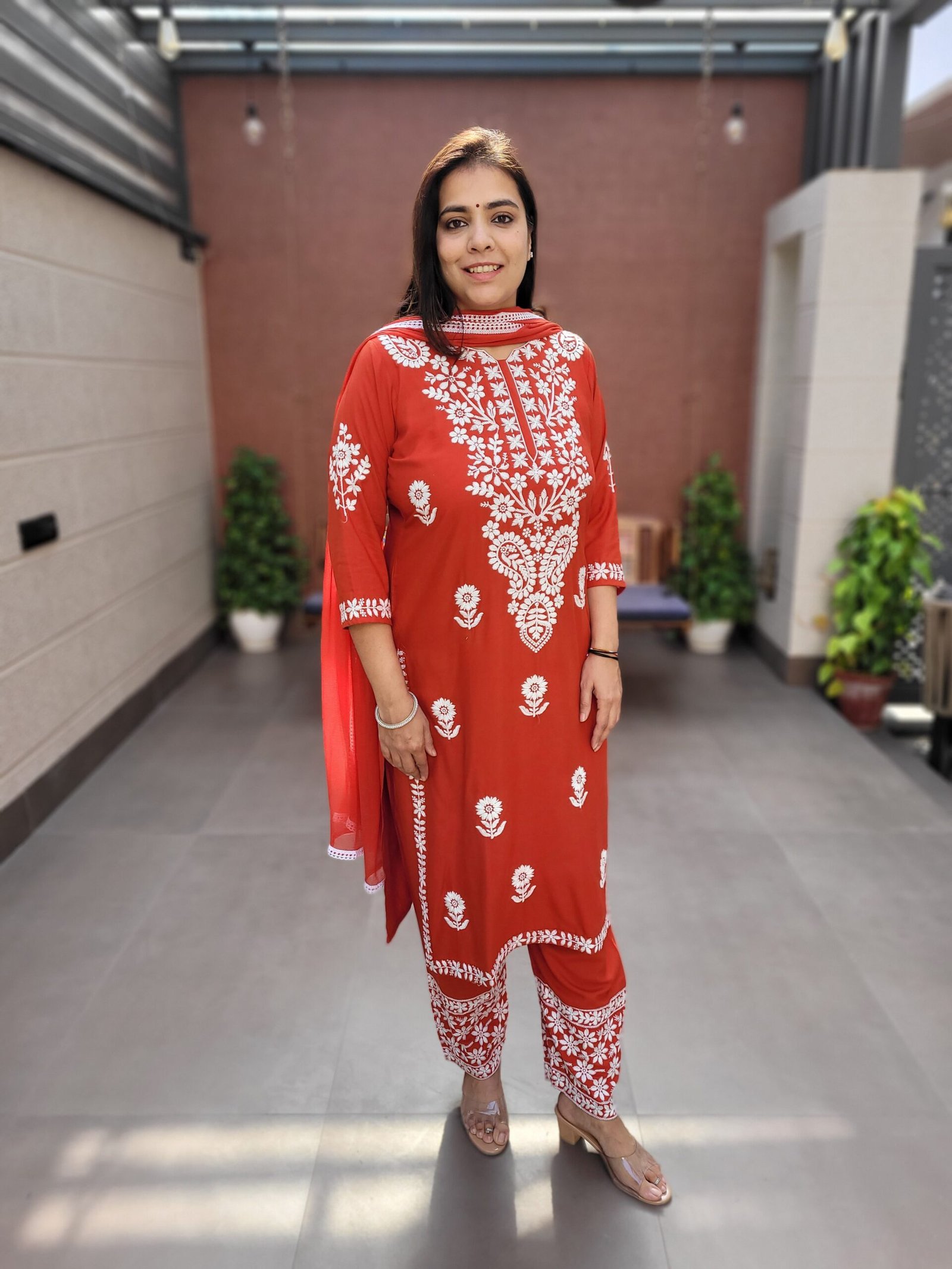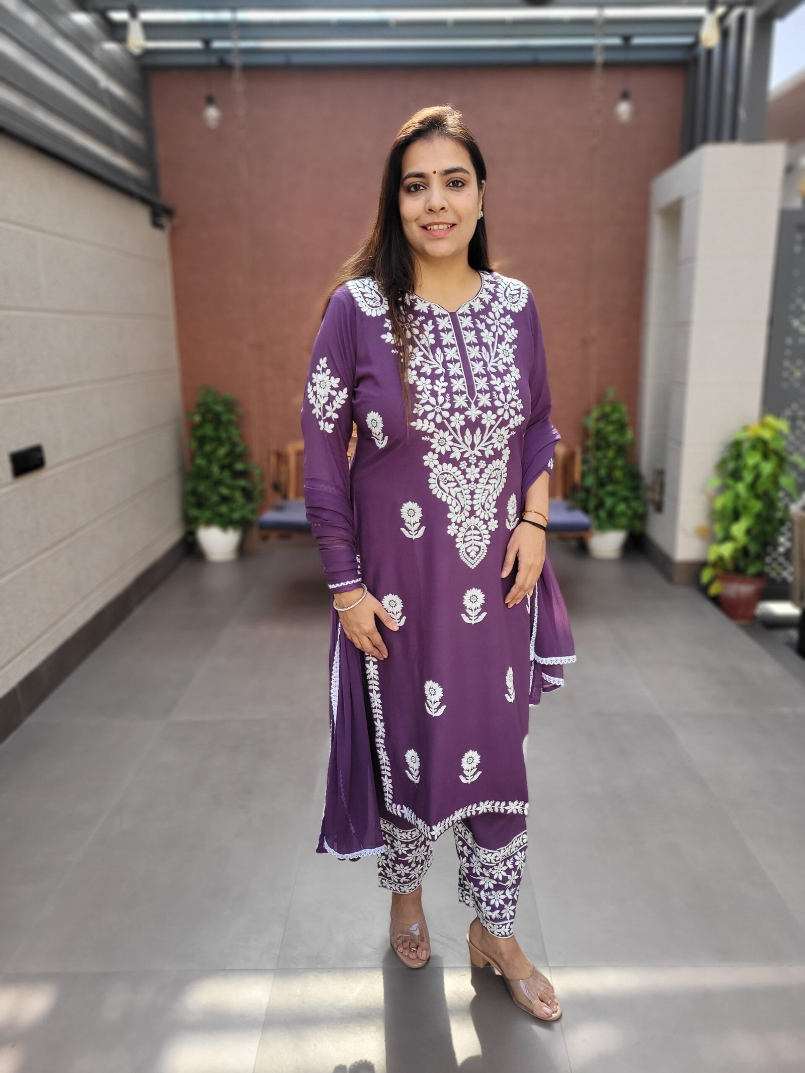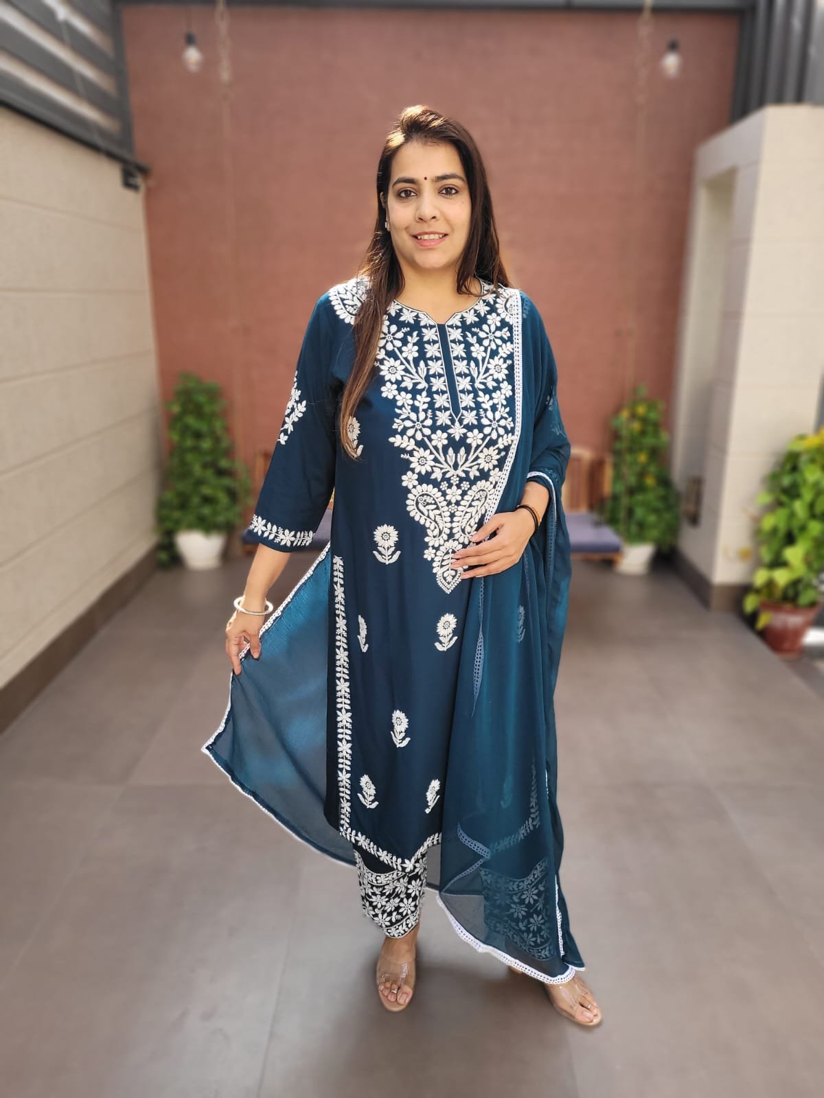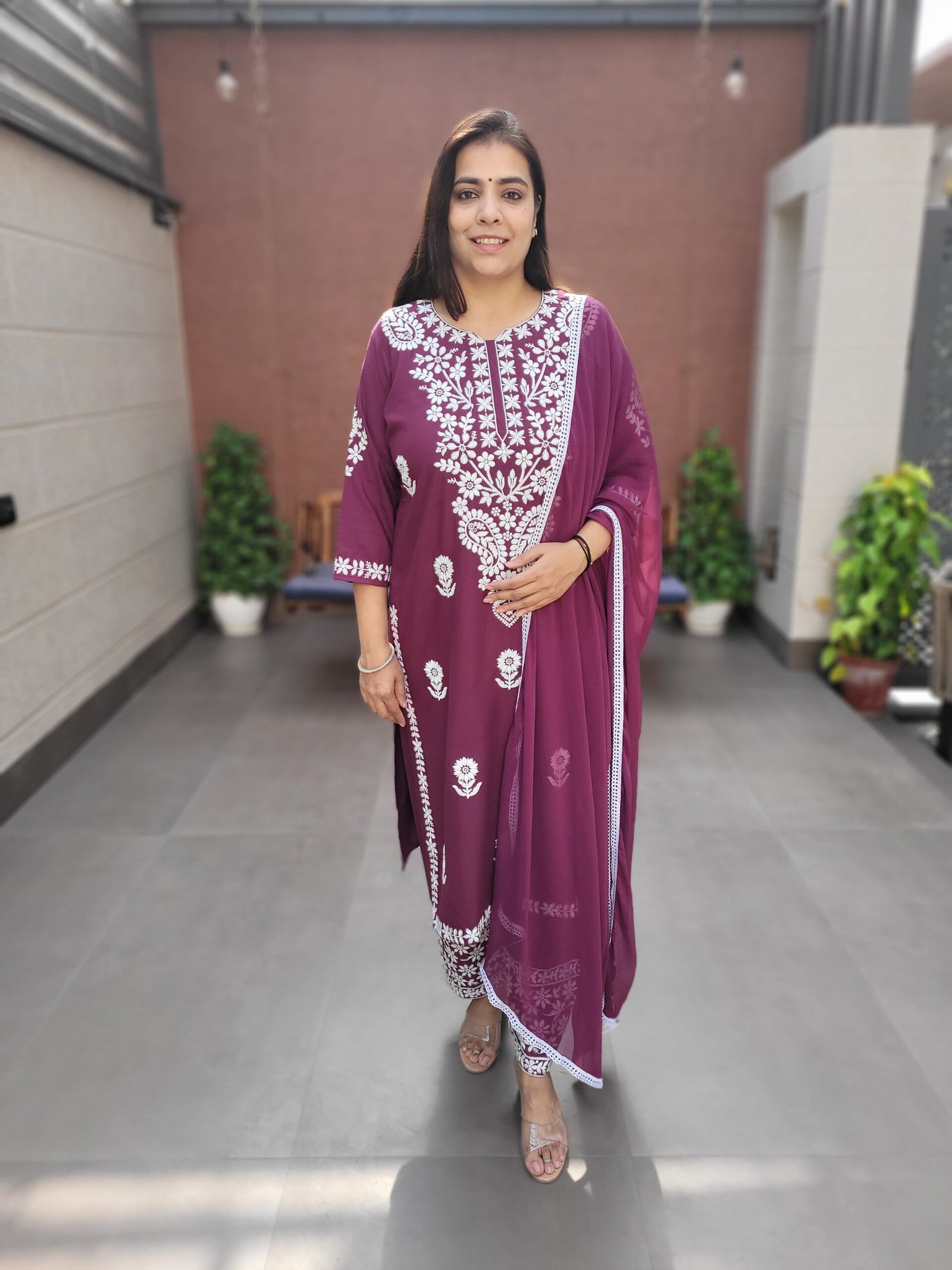 Add a touch of traditional charm to your wardrobe with this Chikanari 3PC Set, made from premium rayon fabric. The intricate Chikanari embroidery on this set enhances its elegance, making it a perfect choice for both casual and semi-formal events. With its soft and breathable fabric, this set ensures comfort all day long while elevating your style quotient.