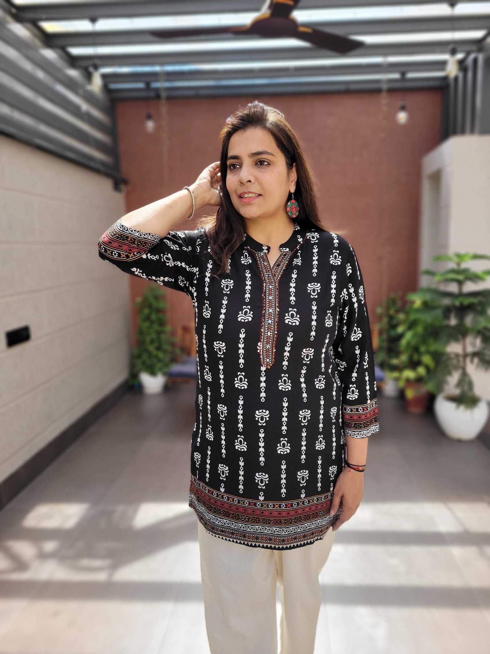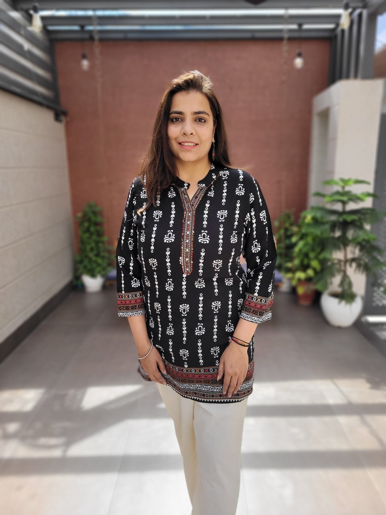 Delicate handwork detailing enhances the tunic with subtle charm, making it suitable for both casual outings and office styling. Its lightweight feel and versatile design make it an easy choice for effortless ethnic fashion.