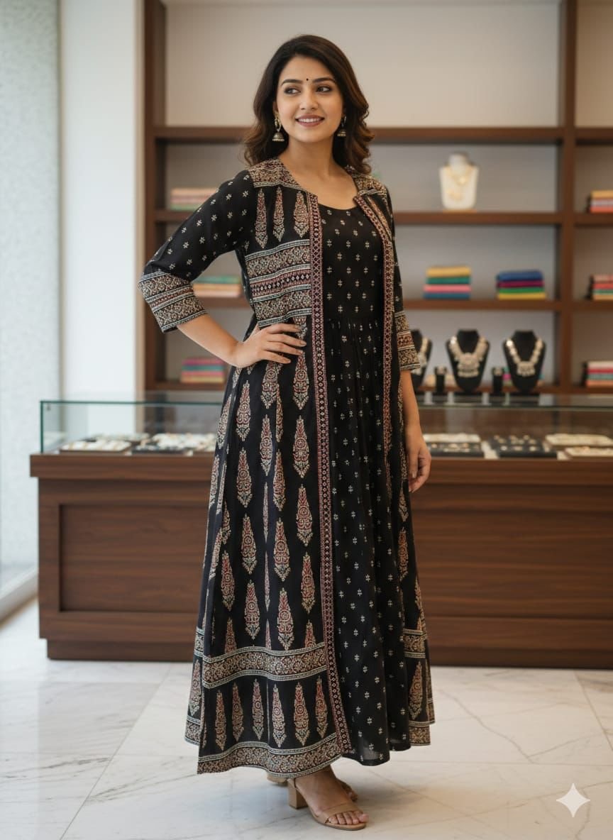 The GW-074 Smocking Dress with Shrug is a perfect blend of modern style and comfort. Made from premium rayon, the outfit offers a soft feel with a graceful flow.
