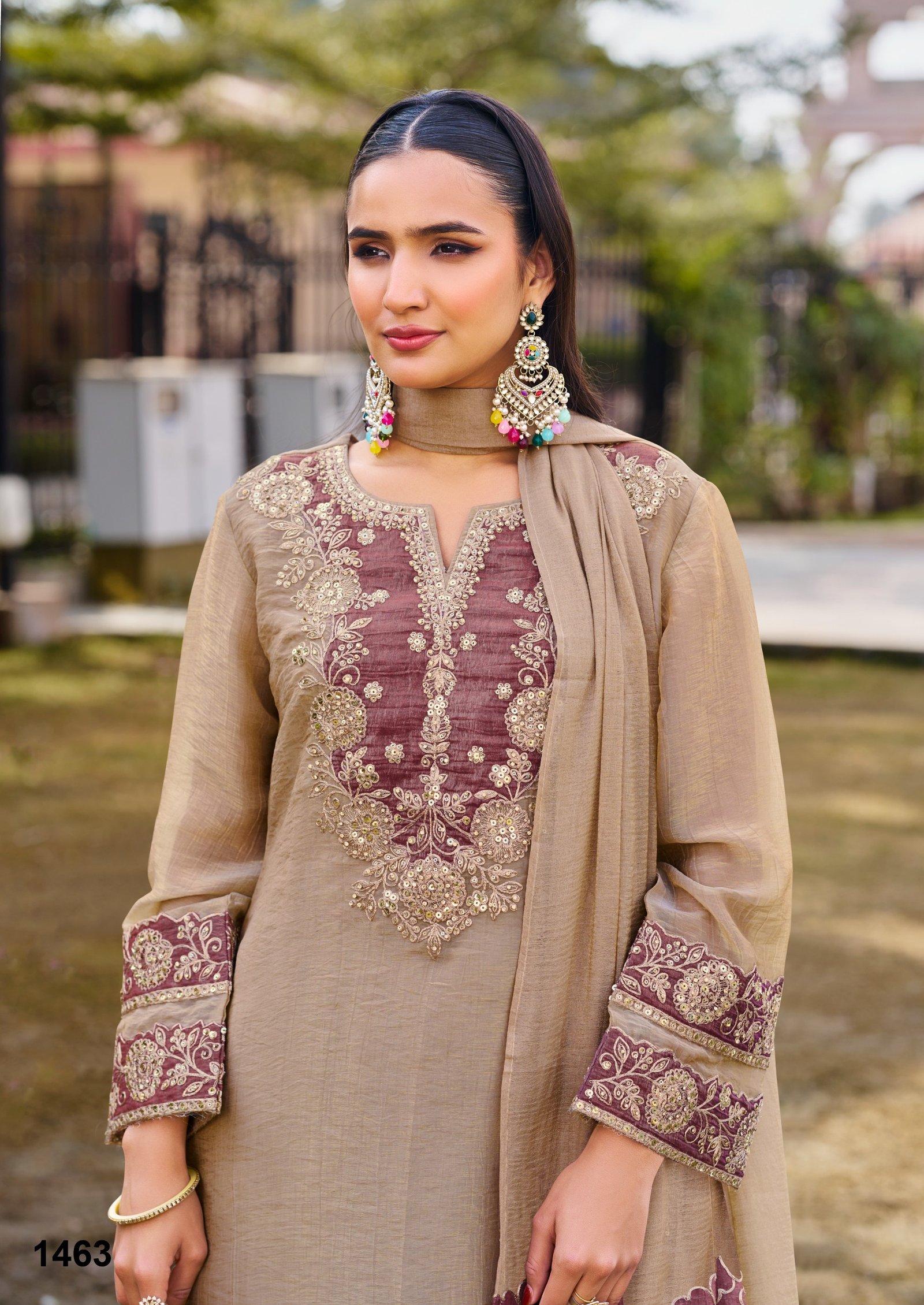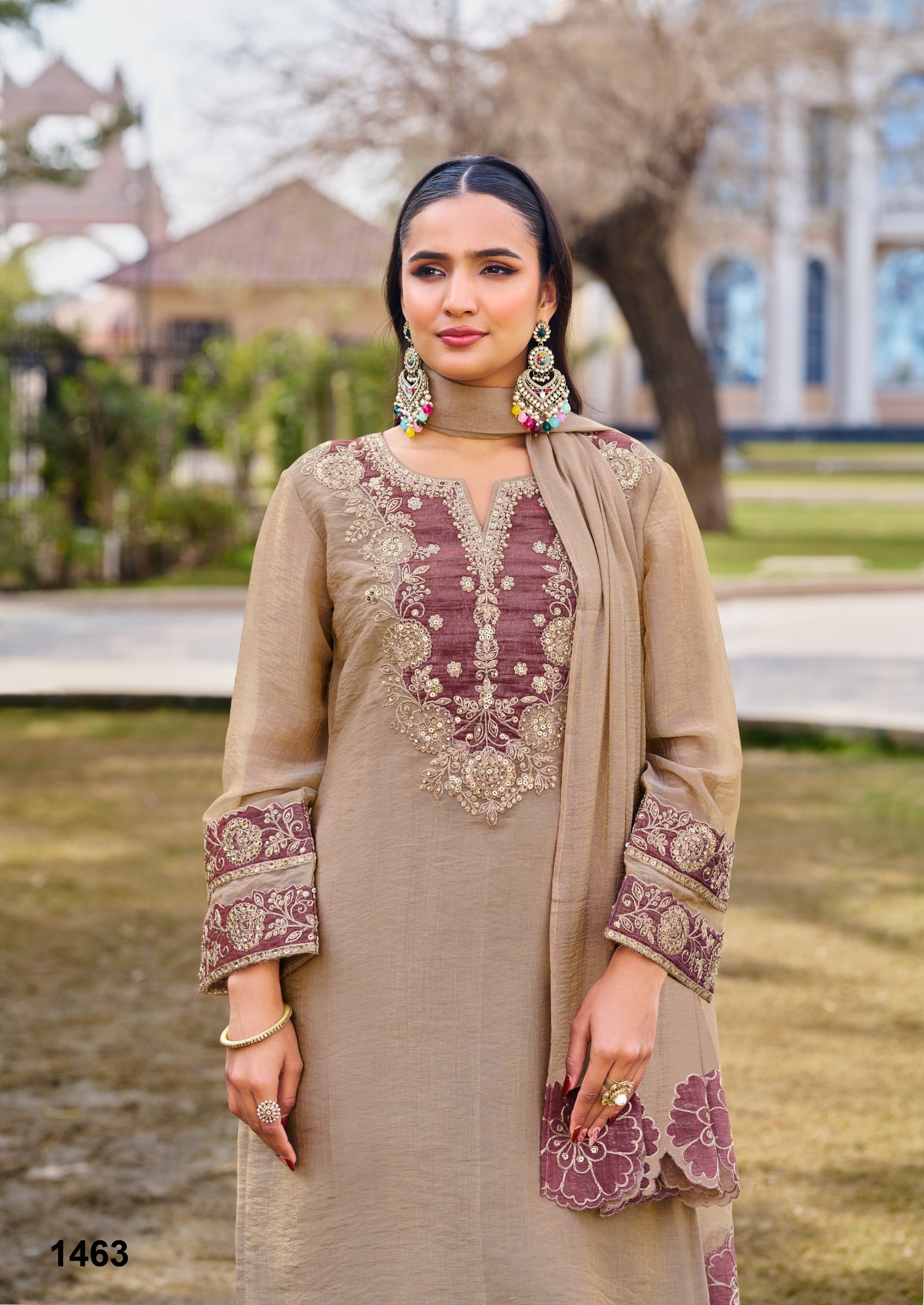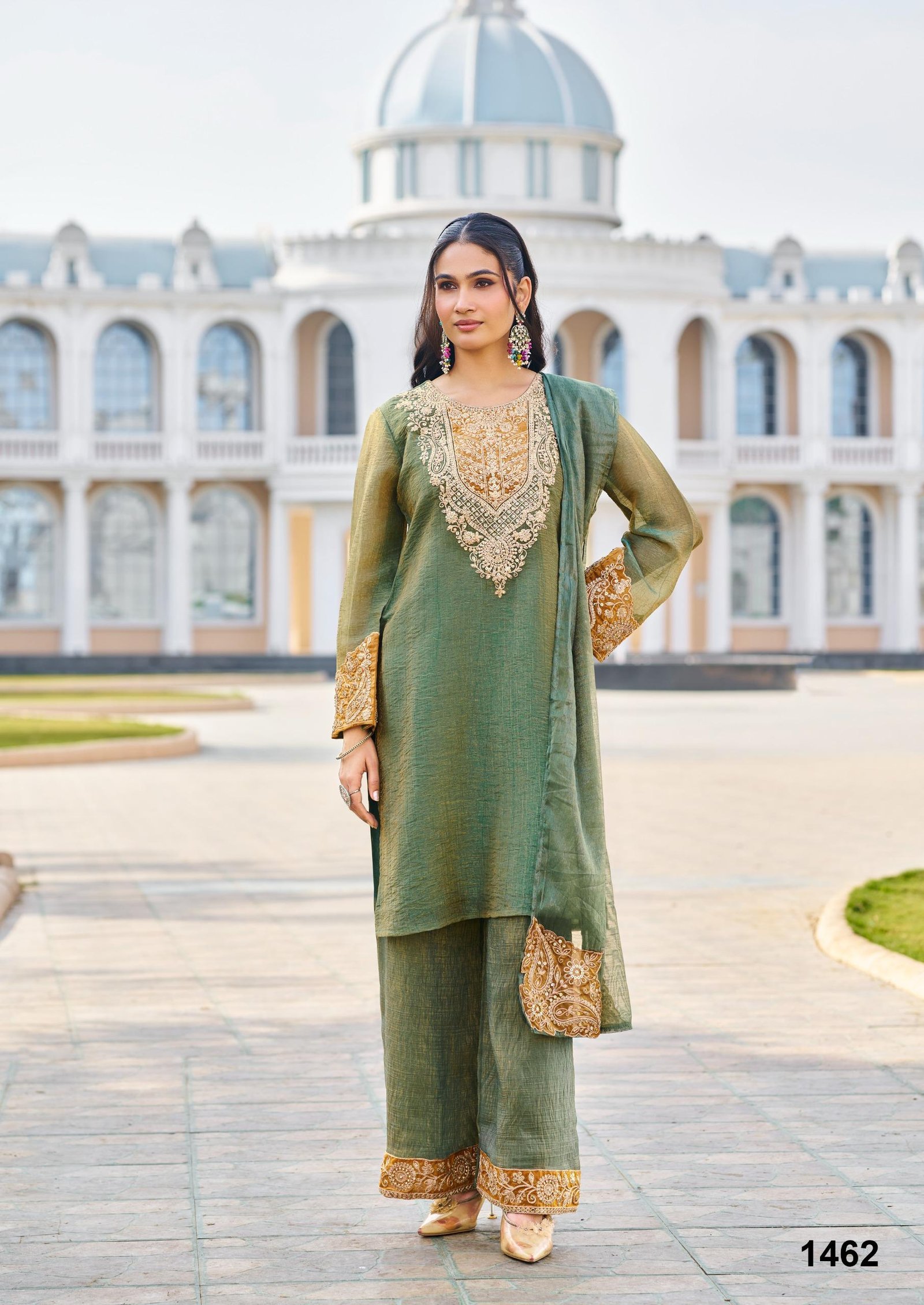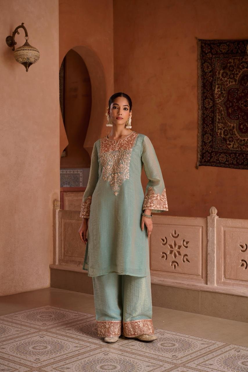 The kurta is further enhanced with designer tissue patch work, adding structure and a refined handcrafted appeal. A soft cotton lining ensures comfort, allowing you to enjoy long functions without discomfort. The coordinated bottom and stylish dupatta complete the ensemble, making it a perfect choice for grand occasions.