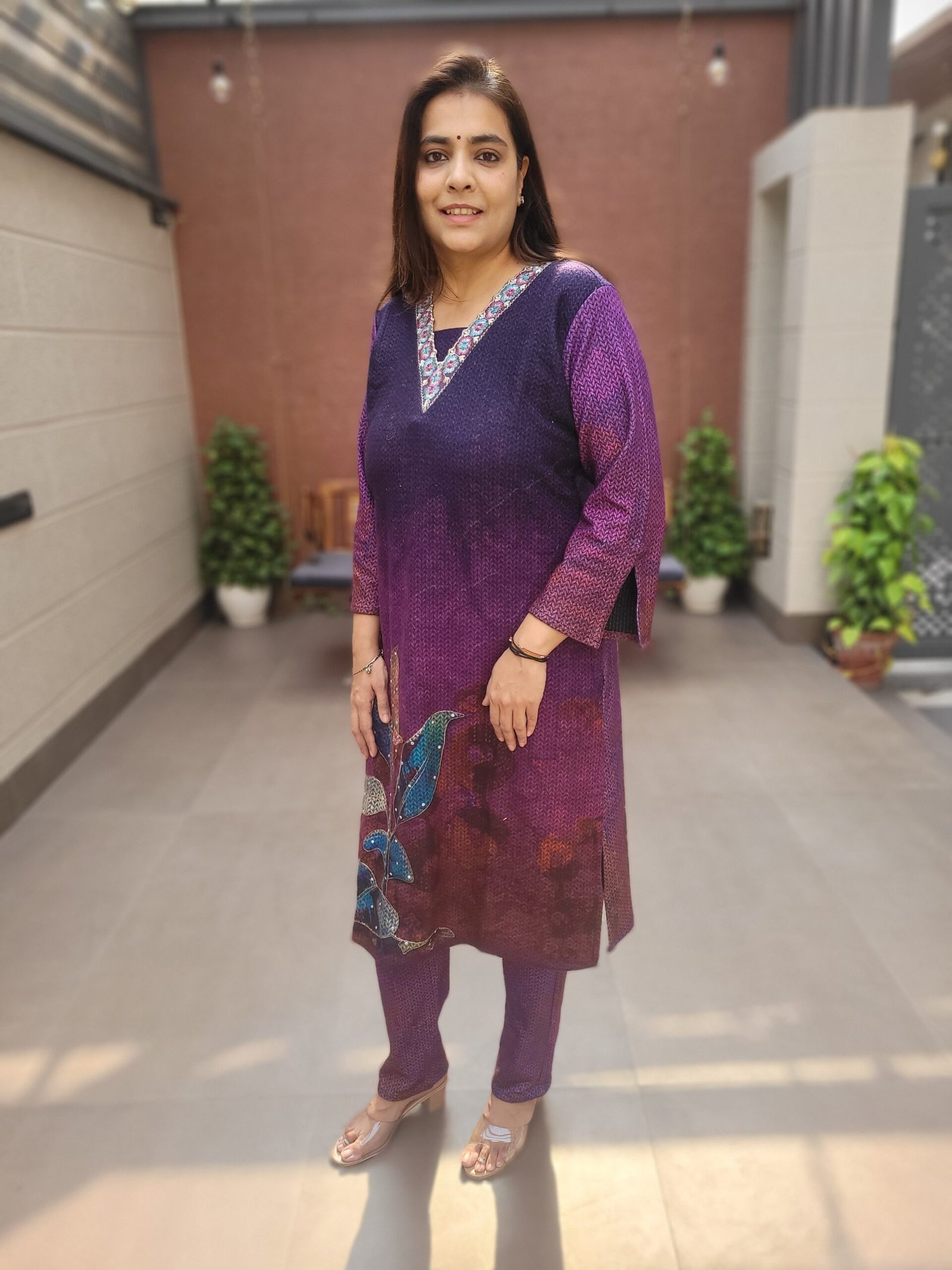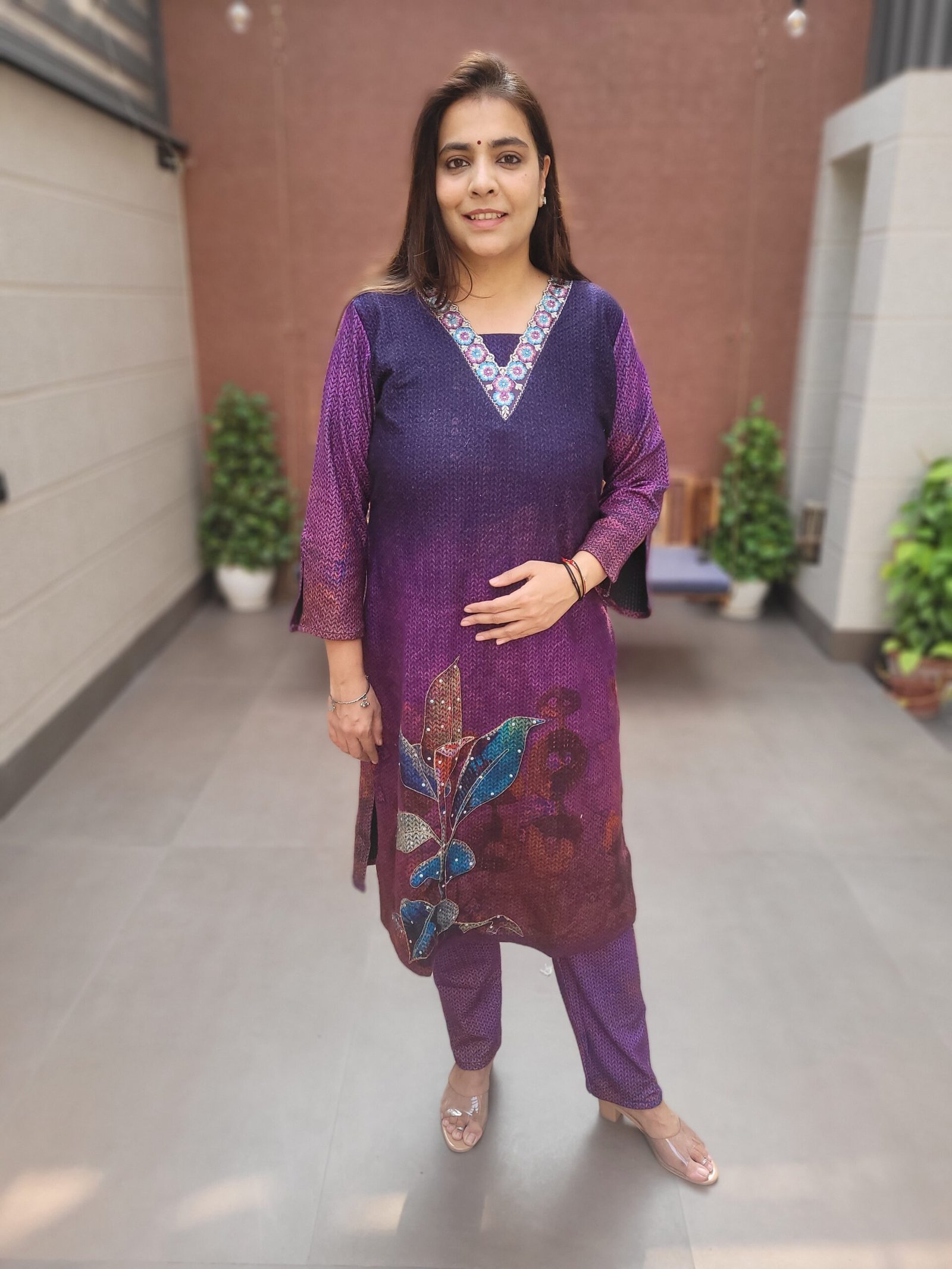 Its unique herringbone weaving design enhances the outfit with a subtle yet sophisticated pattern that stands out beautifully in velvet. The kurta features handwork on the front panel, adding an elegant handcrafted touch that elevates the overall look.