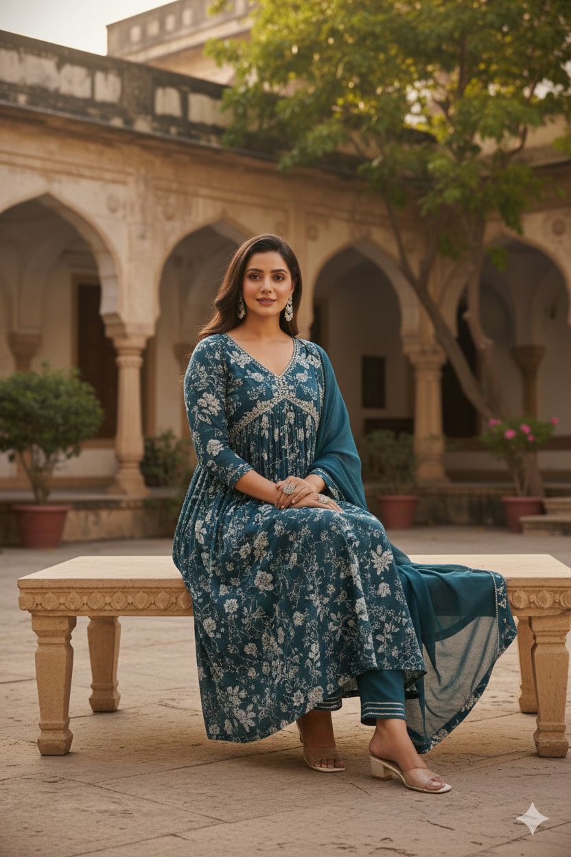 Cotton lining ensures comfort while maintaining structure. This set is ideal for festive evenings, wedding functions, and stylish ethnic occasions.