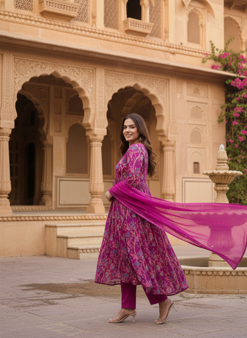 Step into elegance with this Designer 3PC Set crafted in luxurious Pure Chinon. Known for its soft drape and rich texture, chinon adds a flowy, graceful fall to the outfit—making it an ideal choice for festive gatherings, family functions, or evening events.