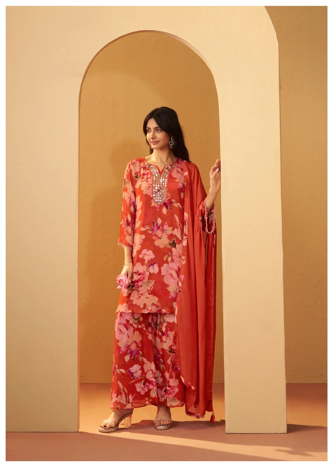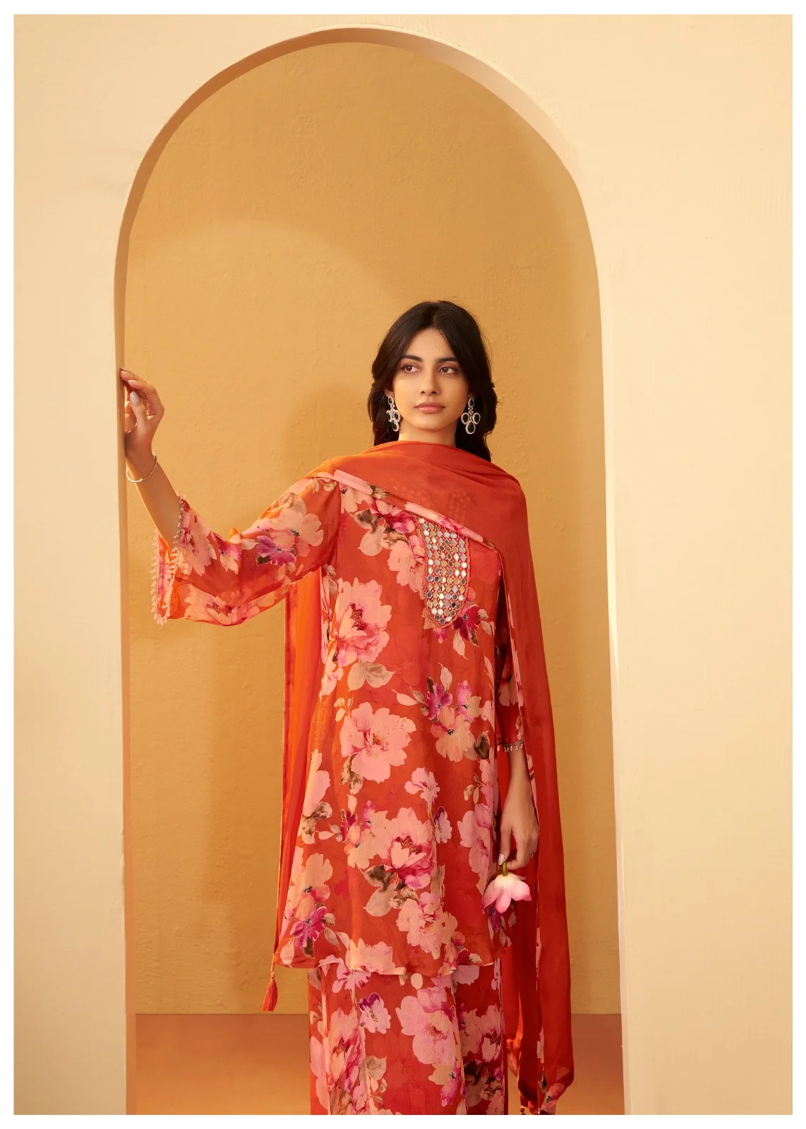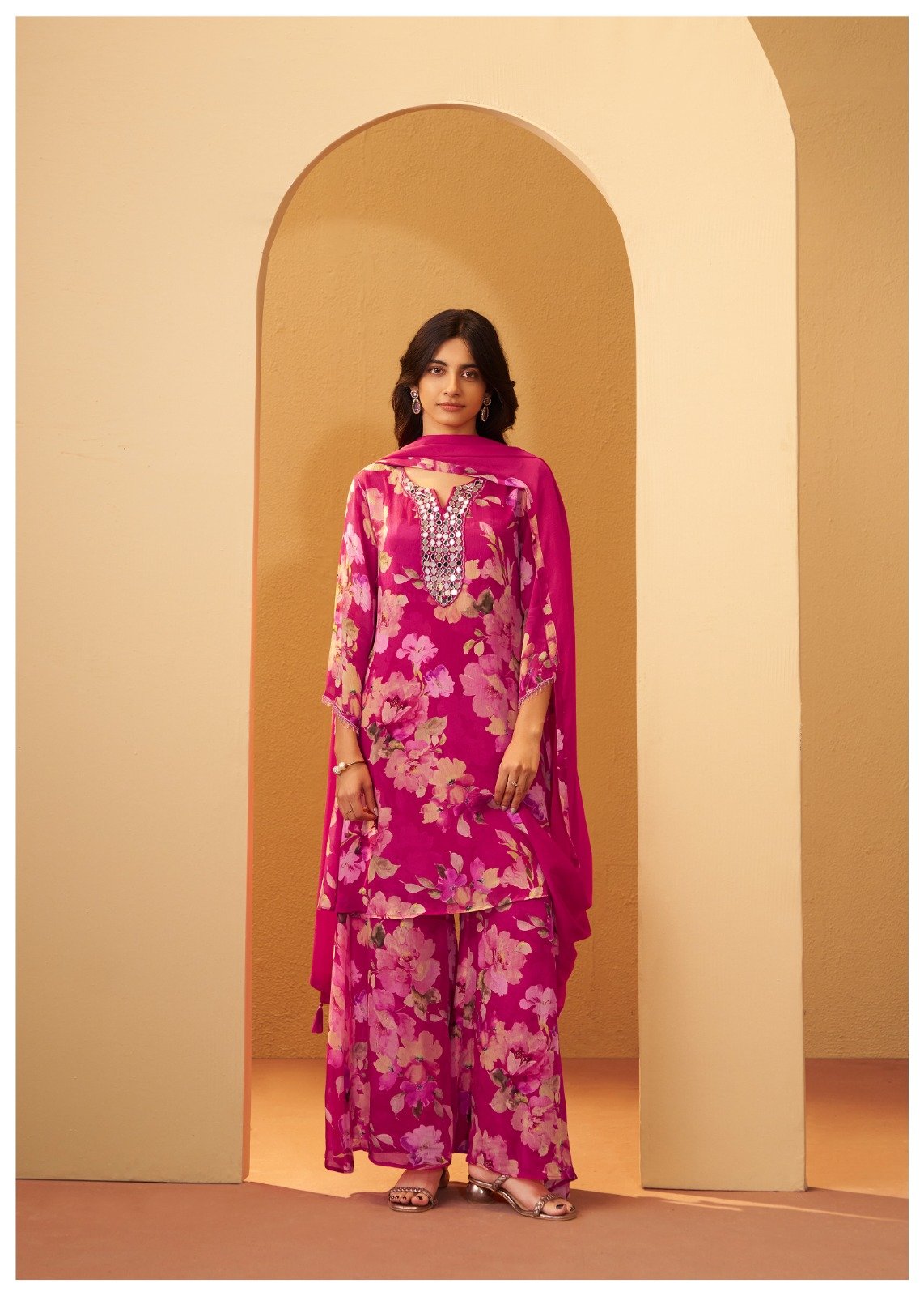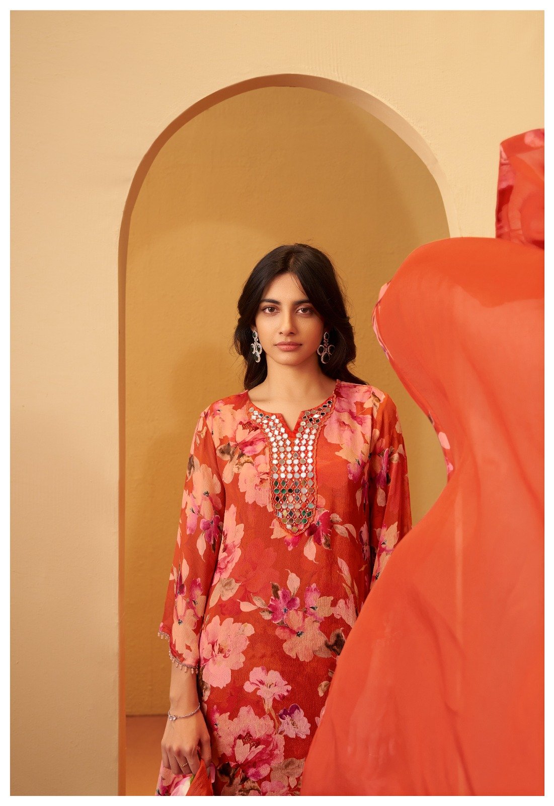 The divider-style bottom adds a contemporary touch, offering both comfort and a stylish silhouette. The outfit is completed with a pure chinon dupatta that falls gracefully, enhancing the overall charm of the ensemble.