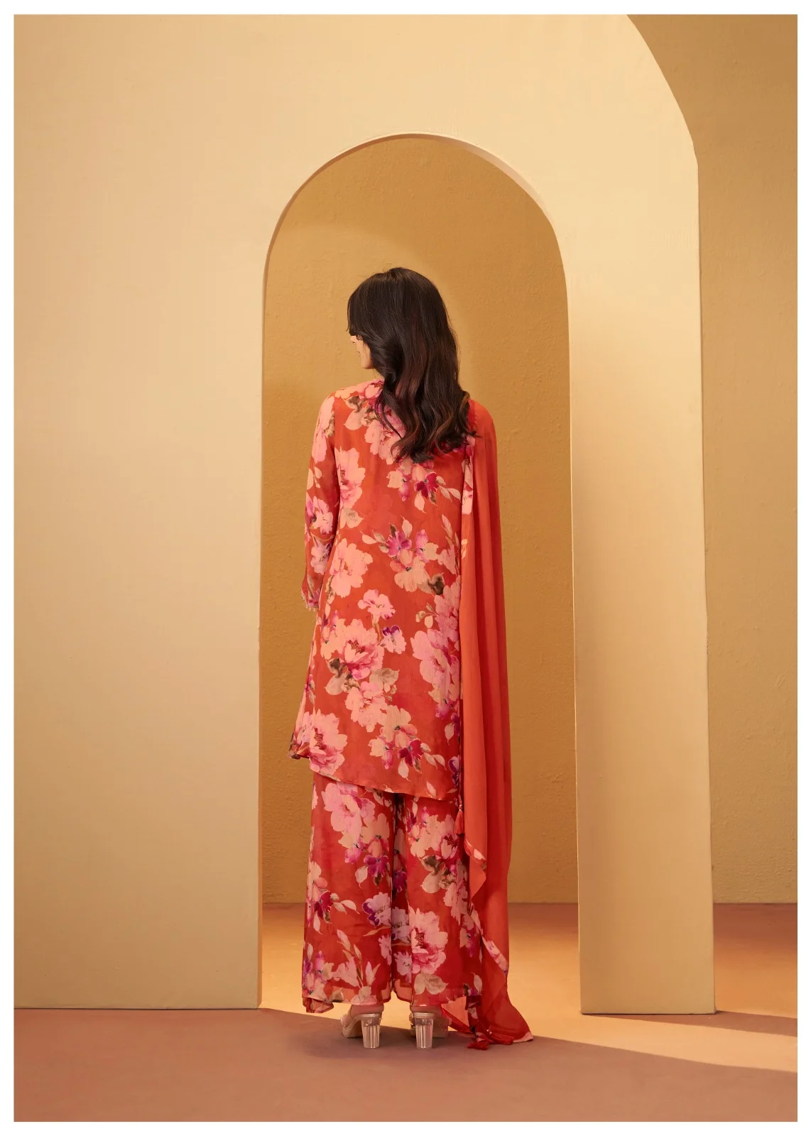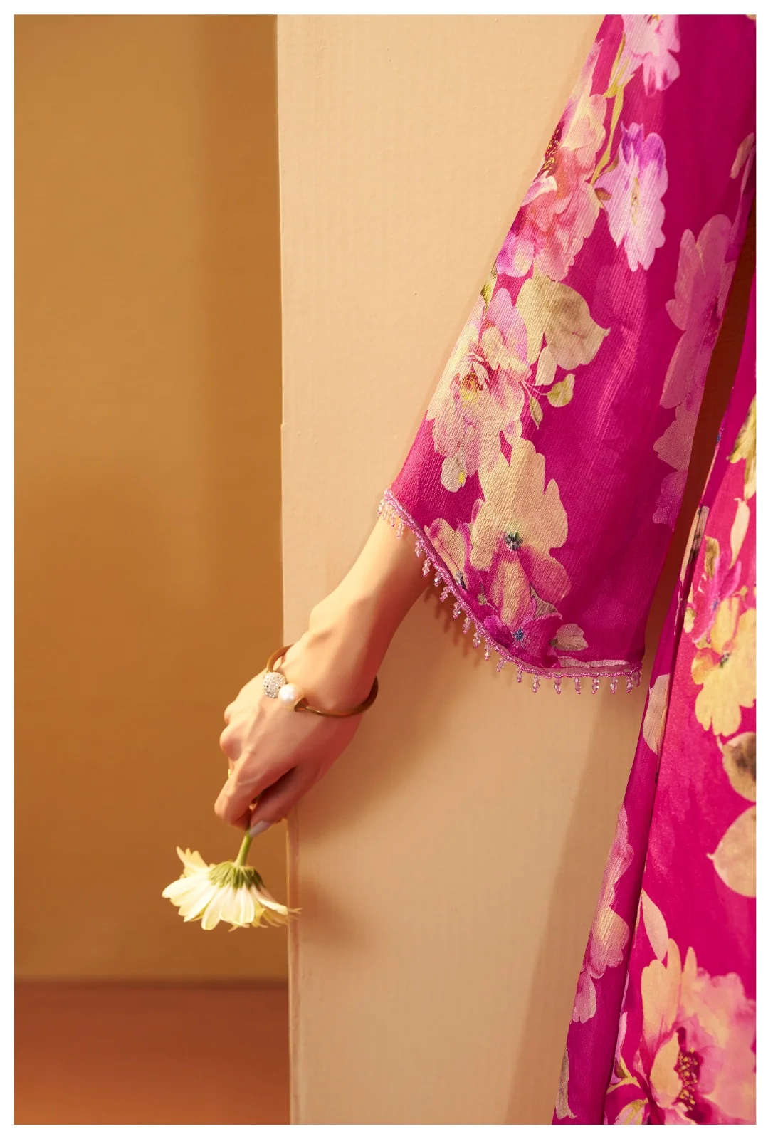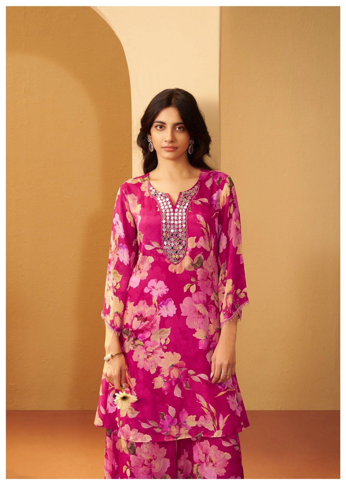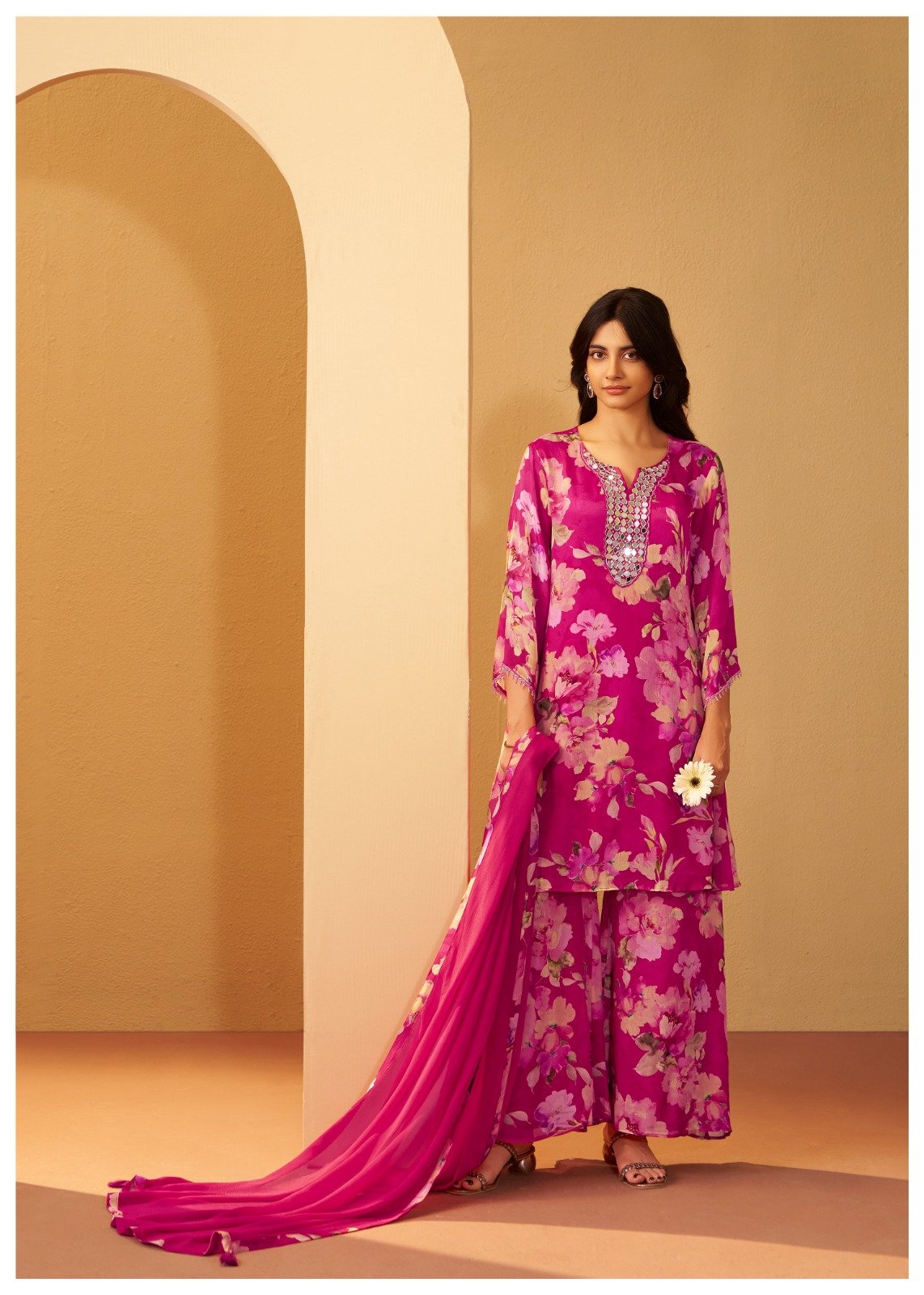 The divider-style bottom adds a contemporary touch, offering both comfort and a stylish silhouette. The outfit is completed with a pure chinon dupatta that falls gracefully, enhancing the overall charm of the ensemble.