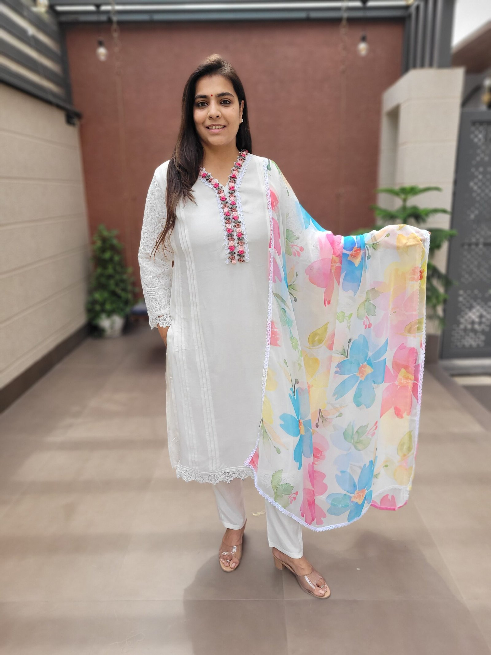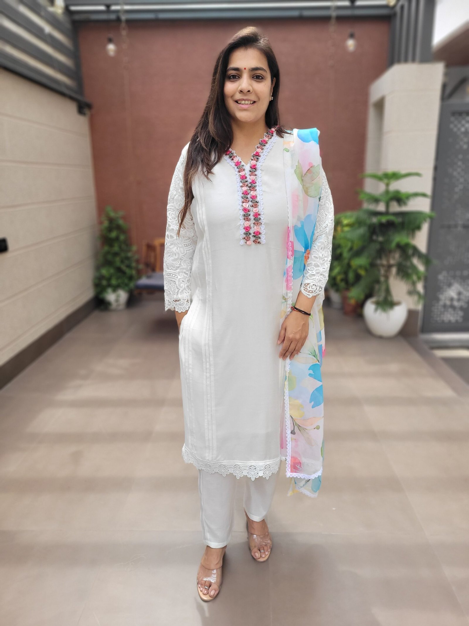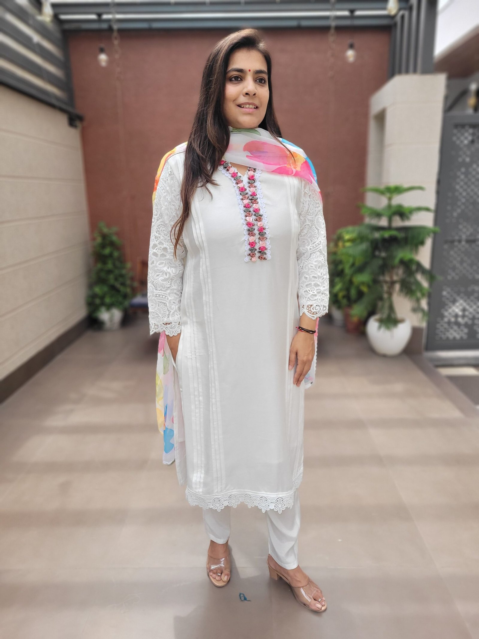The kurta features crochet sleeves and rose lacework on the yoke, adding a unique and feminine touch. Paired with a digital dupatta, this set is perfect for festive occasions and elegant day events.