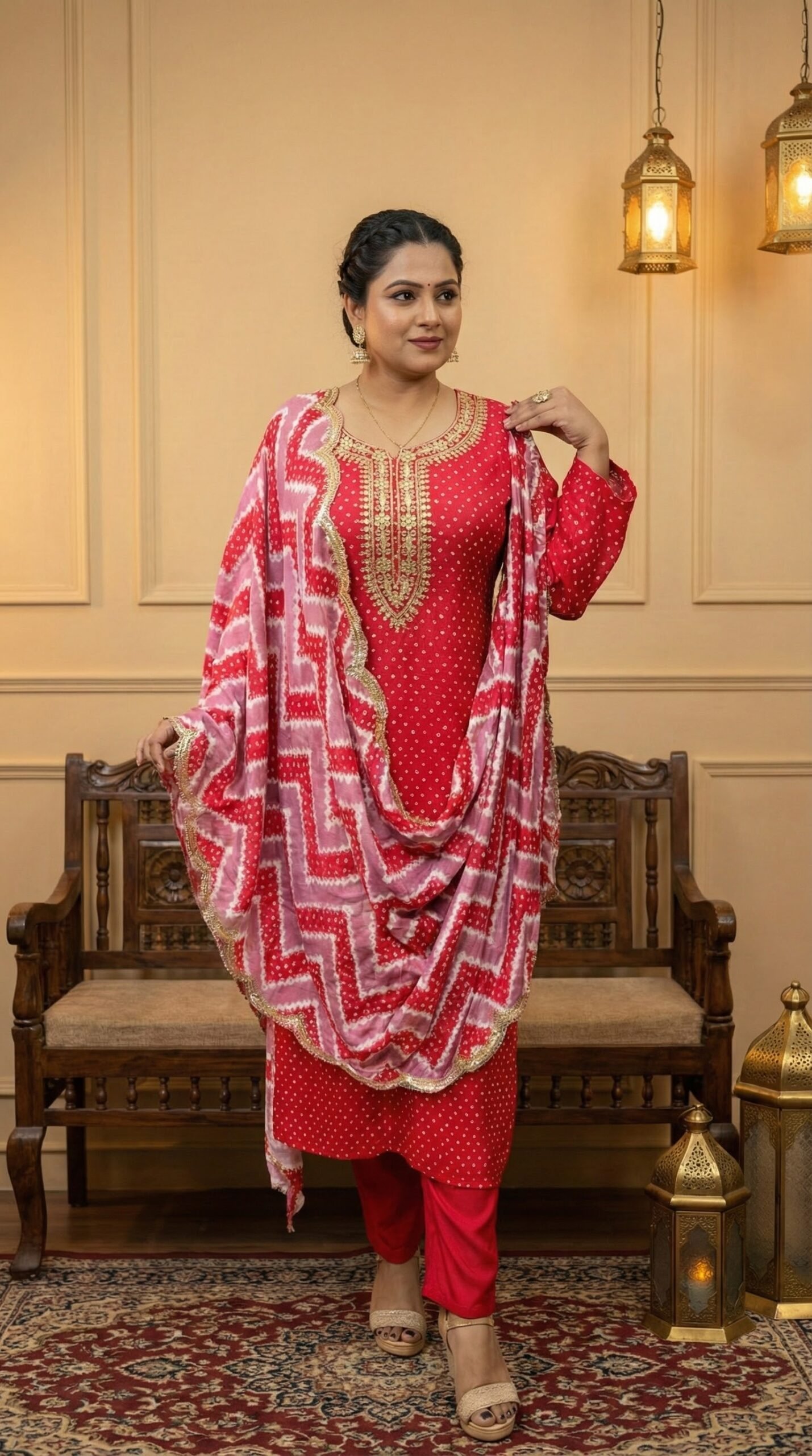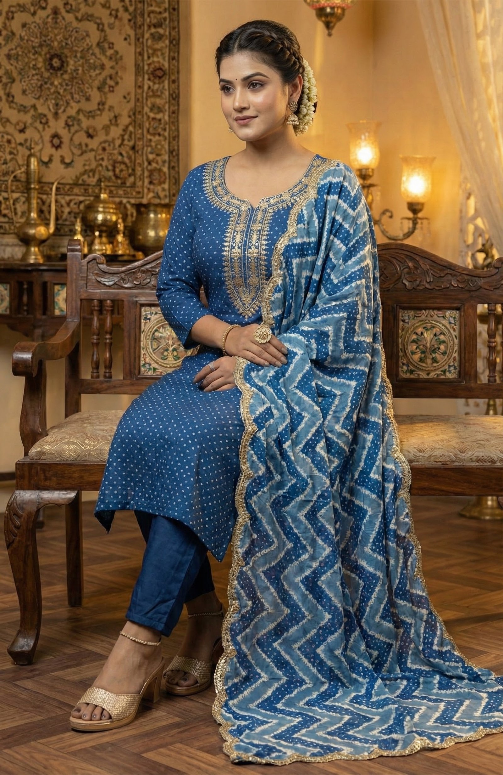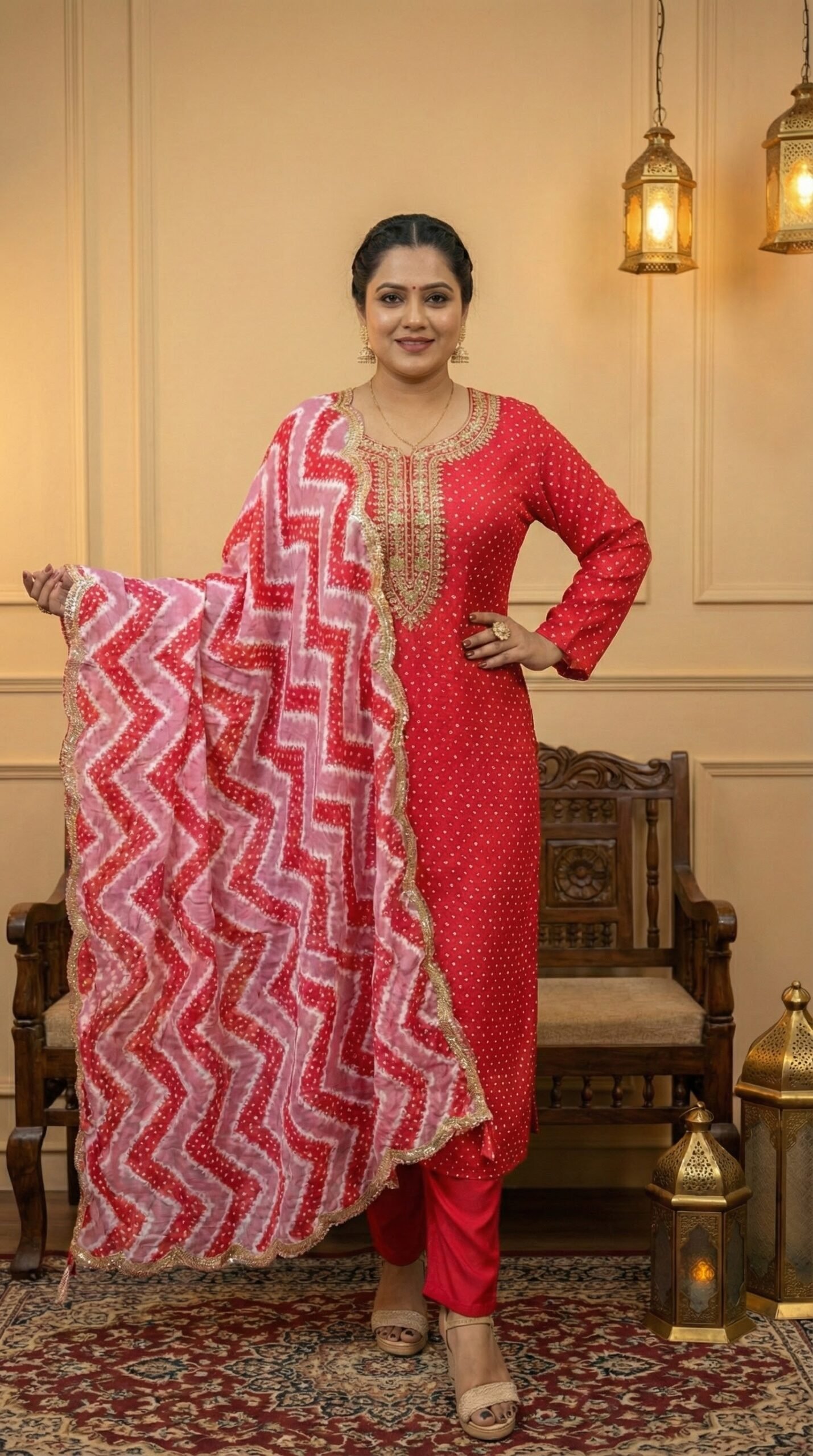 The DU-231 Bandhej 3PC Set is crafted in premium pure muslin, offering a soft, breathable, and luxurious drape. The kurta features a beautiful traditional Bandhej design, elevated with heavy zari work that adds just the right amount of festive shine.
