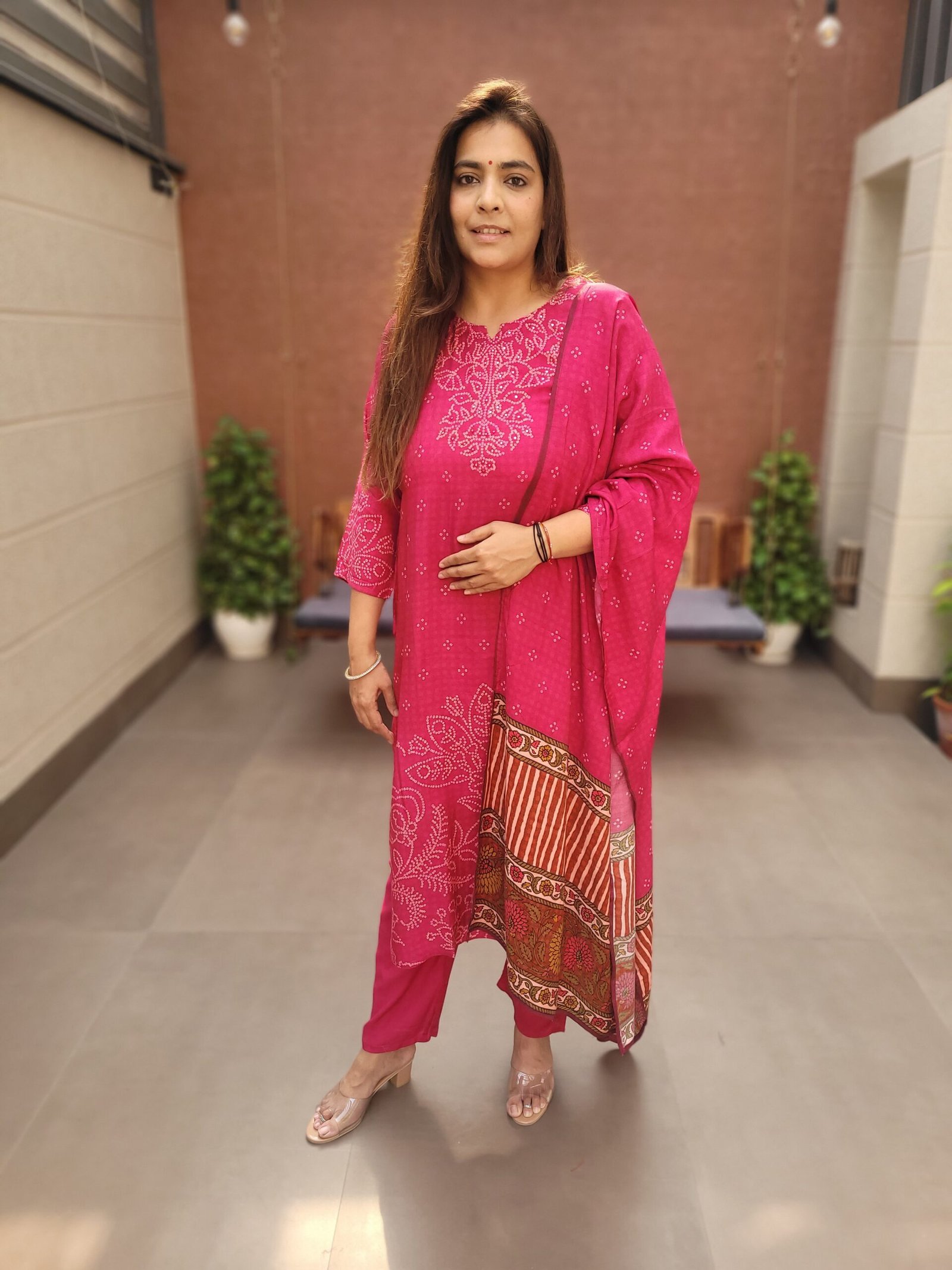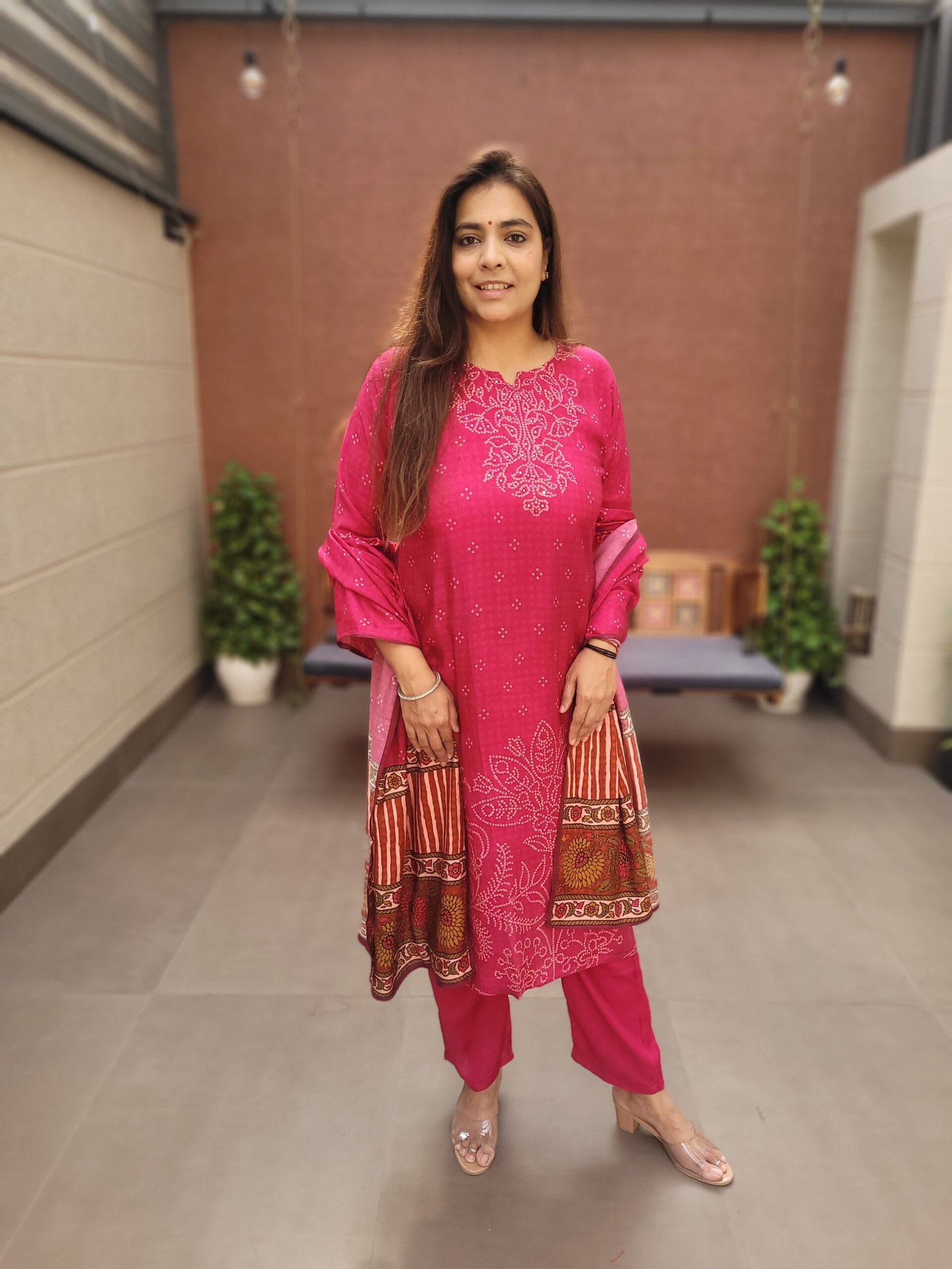 DU-430 blends the beauty of Bandhej with the softness of pure muslin. Its mirror detailing elevates the festive appeal, making it a graceful pick for special occasions.