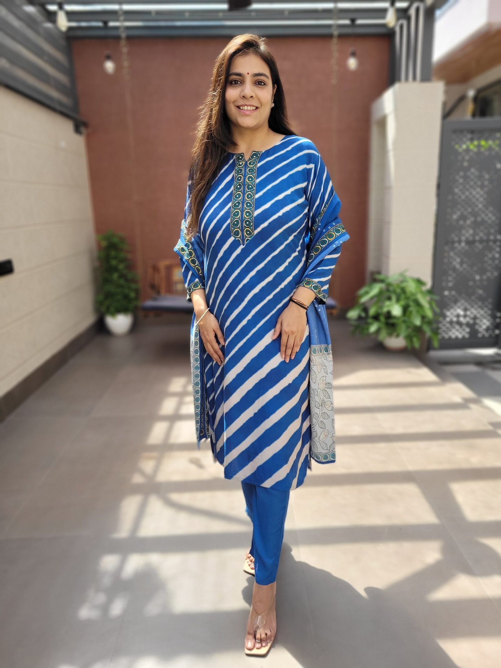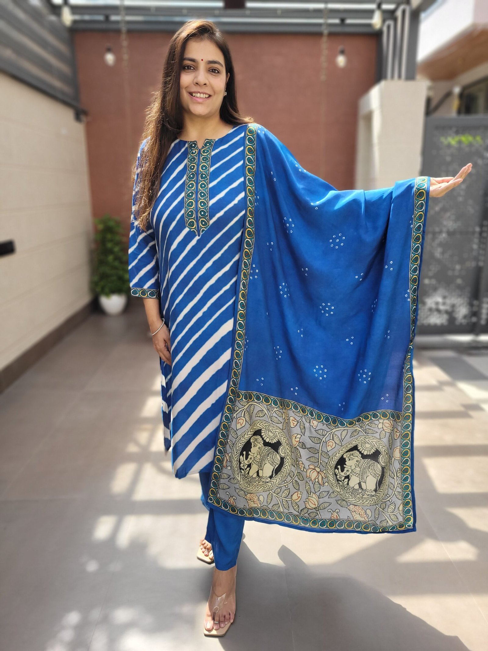 The DU-194 Pure Muslin Leheriya 3PC Suit Set is crafted from soft, breathable pure muslin, offering lightweight comfort and a luxurious feel. Adorned with delicate beads and sequins, this set reflects timeless Indian craftsmanship. The matching pure muslin dupatta features a charming elephant print, adding a whimsical touch to the elegant ensemble.