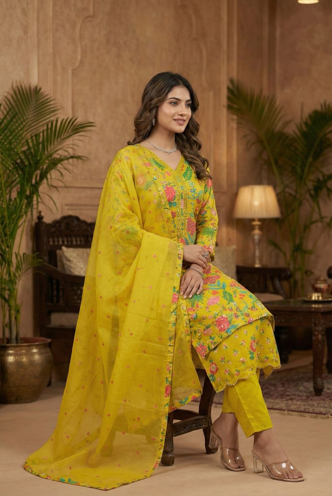 Paired with a lightweight, beautifully coordinated organza dupatta, this set creates a refined and elegant silhouette—perfect for festive gatherings, celebrations, and casual functions. The overall look blends comfort with sophistication, making it a must-have addition to your ethnic wardrobe.