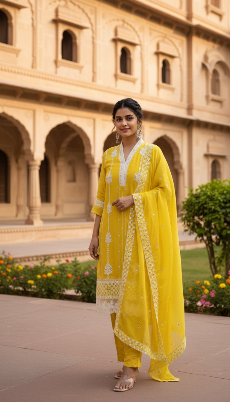 The DU-565 V-Neck 3PC Set is designed for elegant festive styling. Crafted entirely in pure organza, the kurta and dupatta feature embroidery and mirror work on the yoke and dupatta for a graceful, luminous finish.