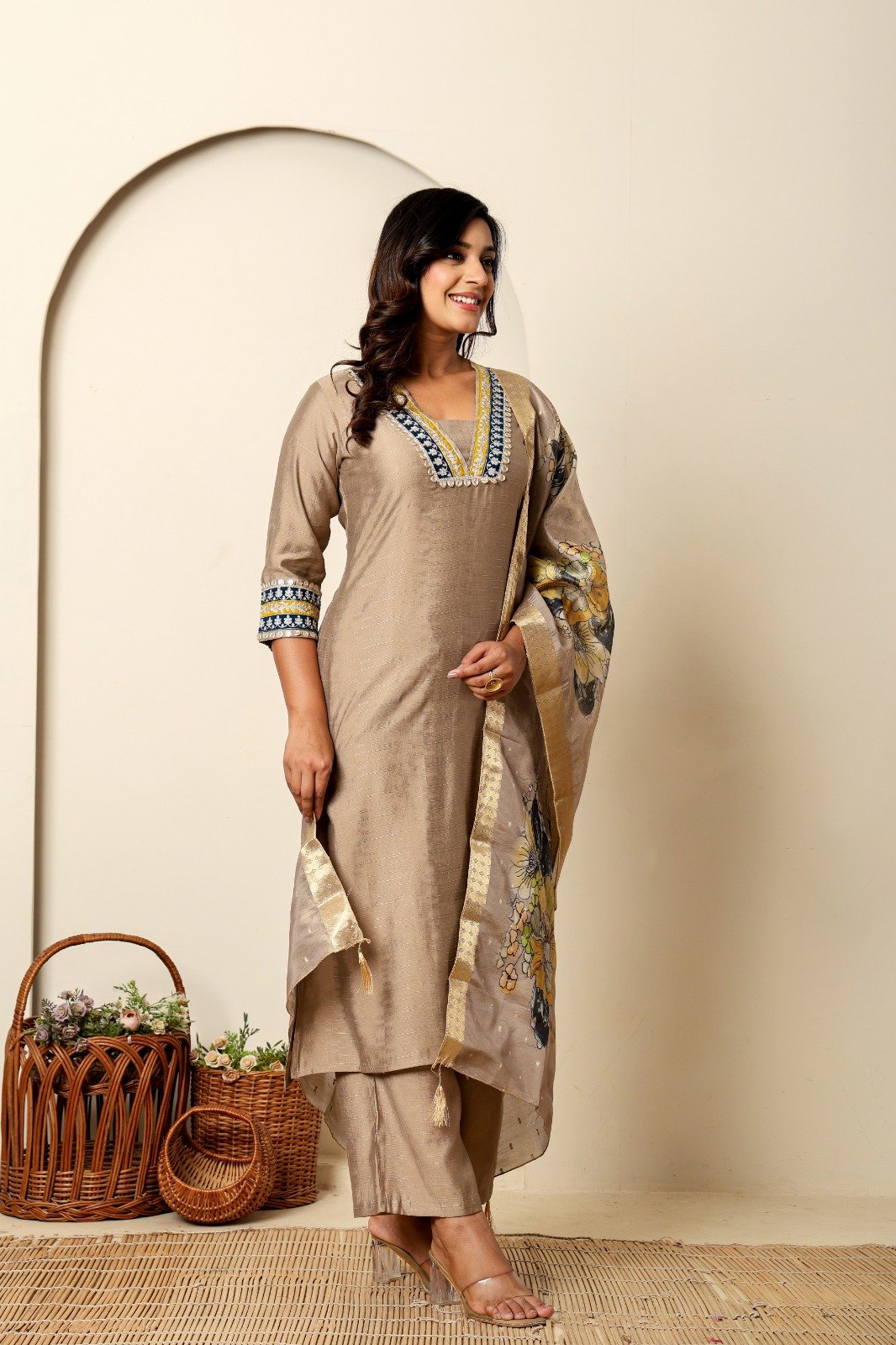 The delicate zari work enhances the outfit with subtle sparkle and intricate detail, reflecting expert craftsmanship and attention to every motif. Combined with the digital print dupatta, this suit strikes a perfect balance between traditional artistry and modern style, offering versatility for multiple looks. The vibrant cheeku shade adds warmth and richness, ensuring you stand out effortlessly while exuding grace.