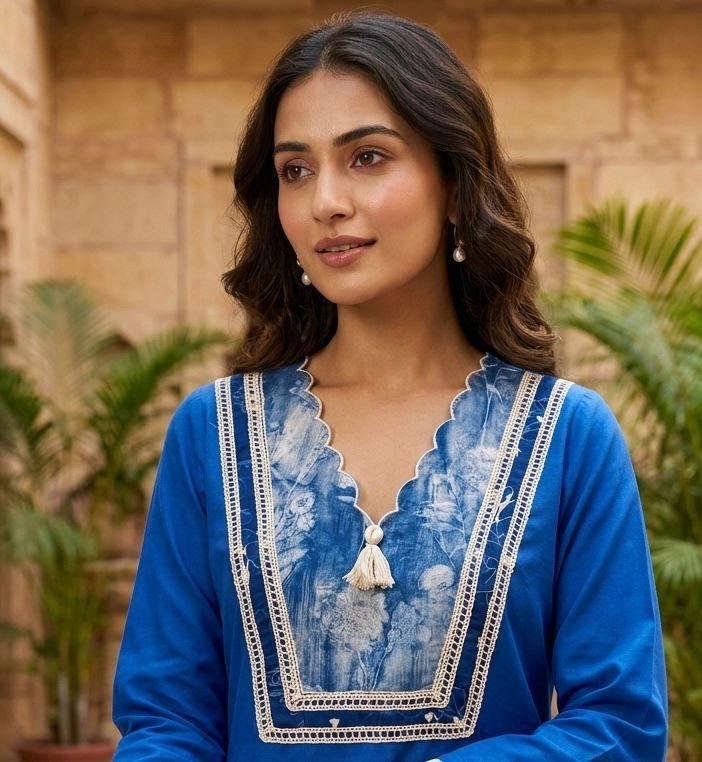 The outfit features lace work detailing on the top and applique work on the palazzo, adding depth and elegance to the design. Its modern silhouette makes it ideal for casual outings, brunches, and smart day wear.