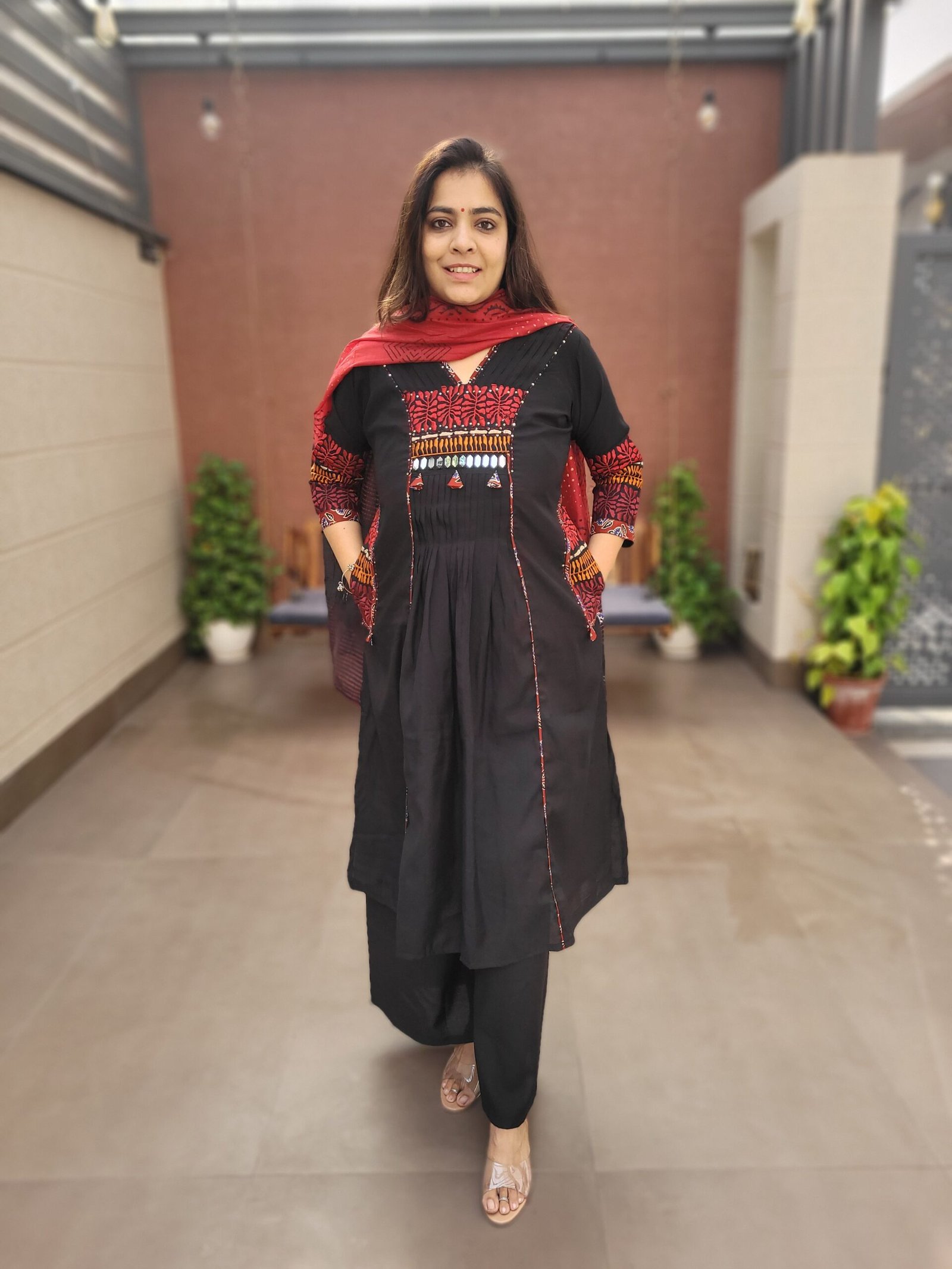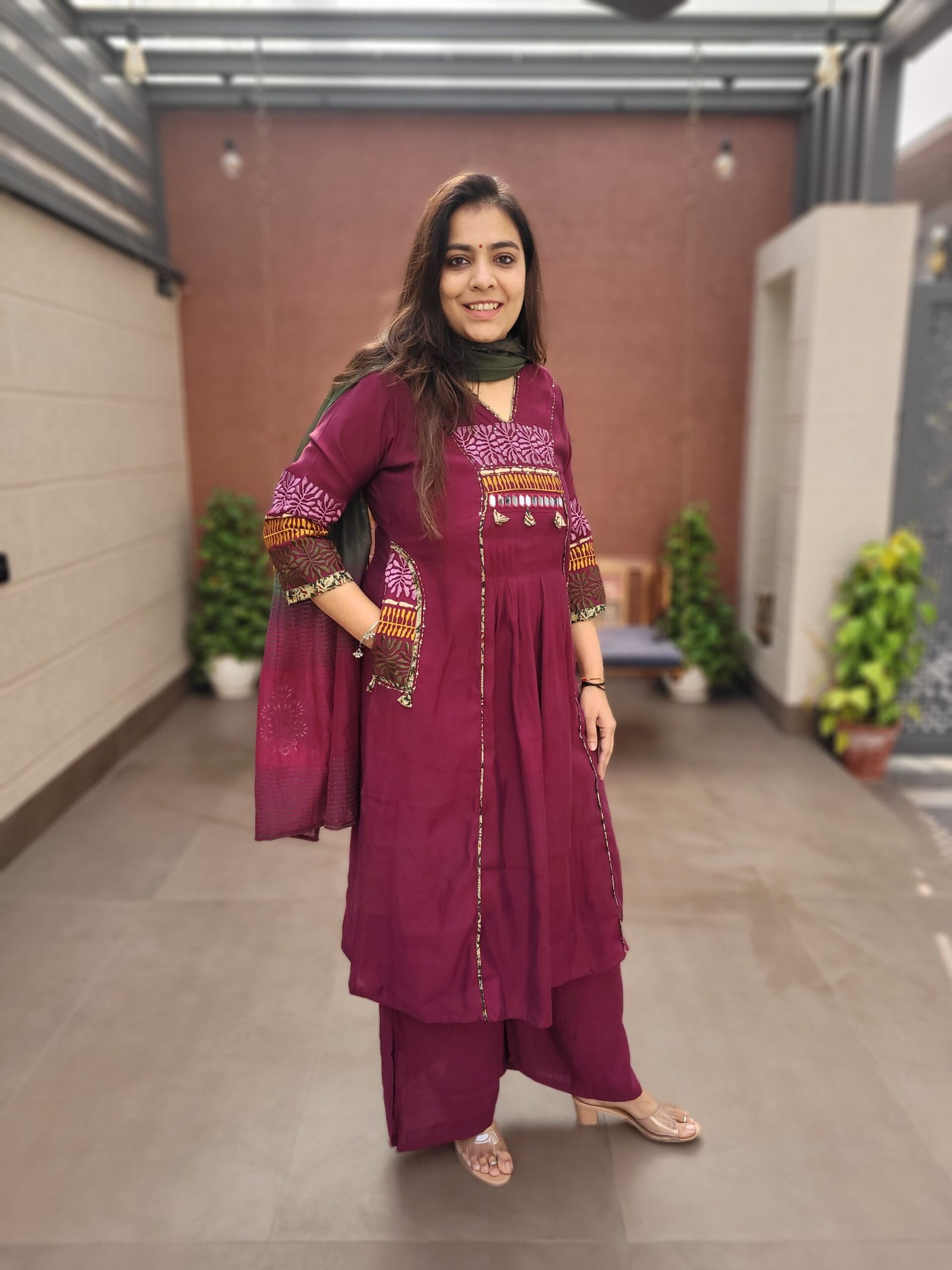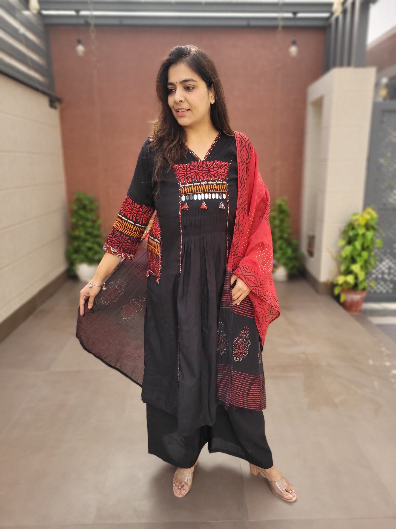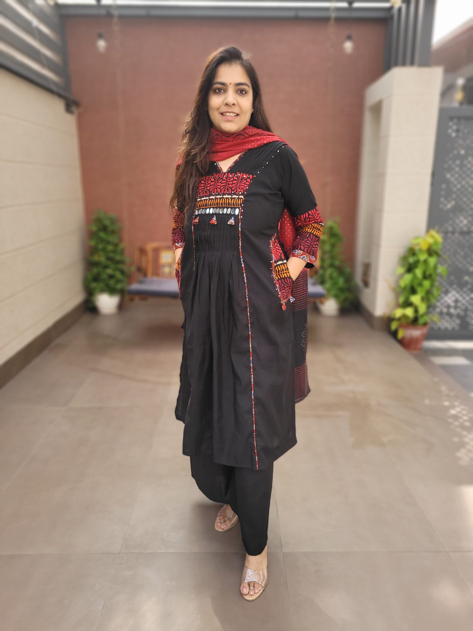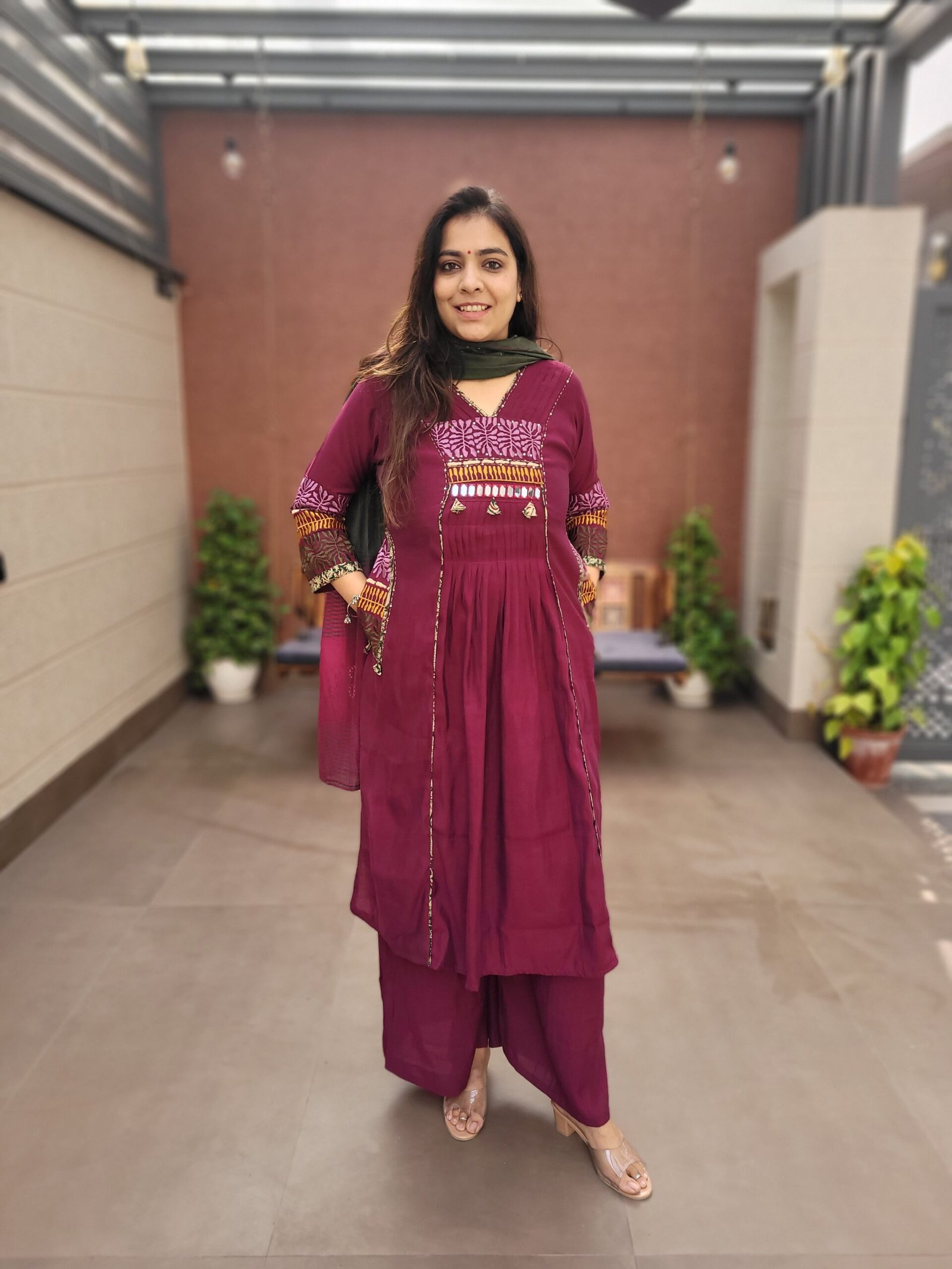 Detailed embroidery and mirror work on the yoke, sleeves, and side pockets elevate the design, while the cotton lining ensures comfort. The handblock dupatta adds an artisanal touch, making it ideal for festive and special occasions.