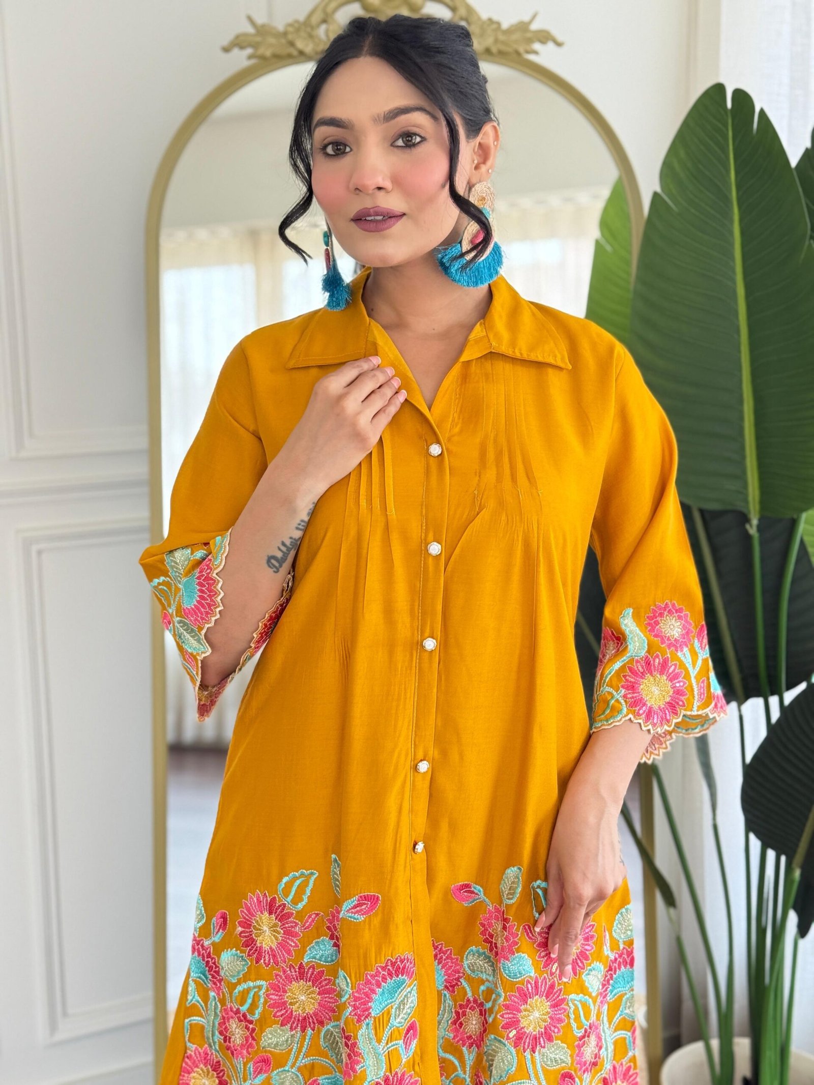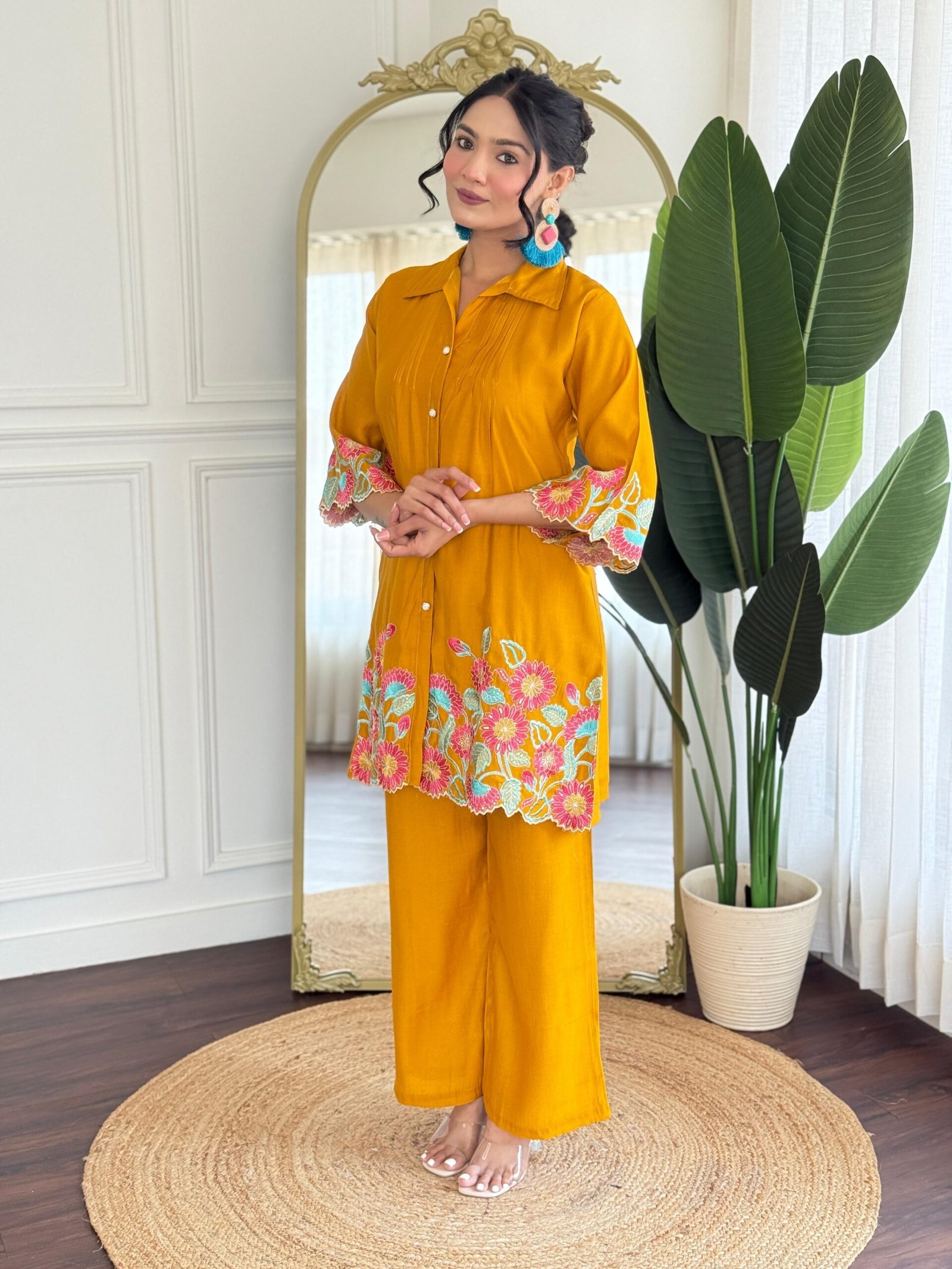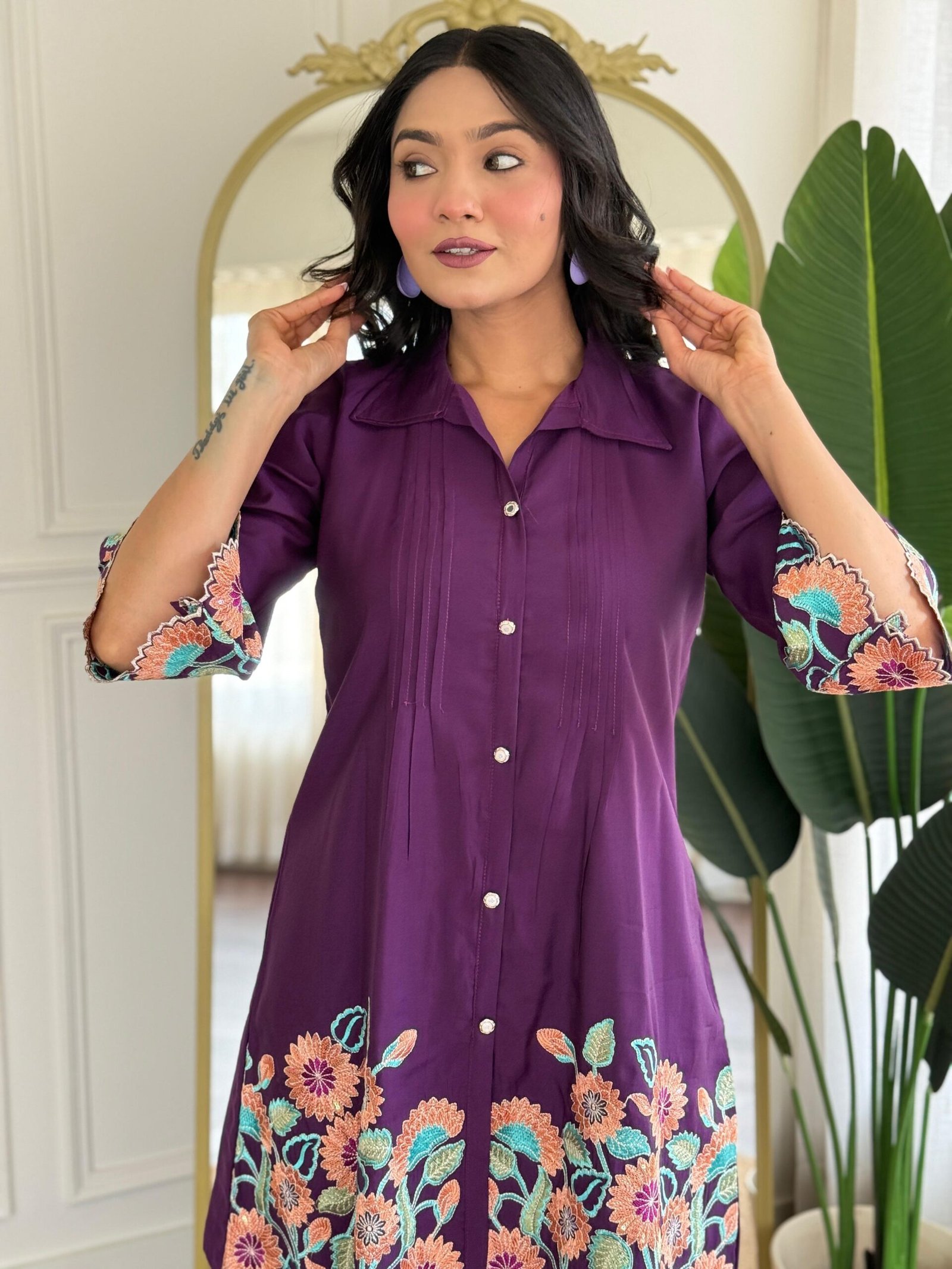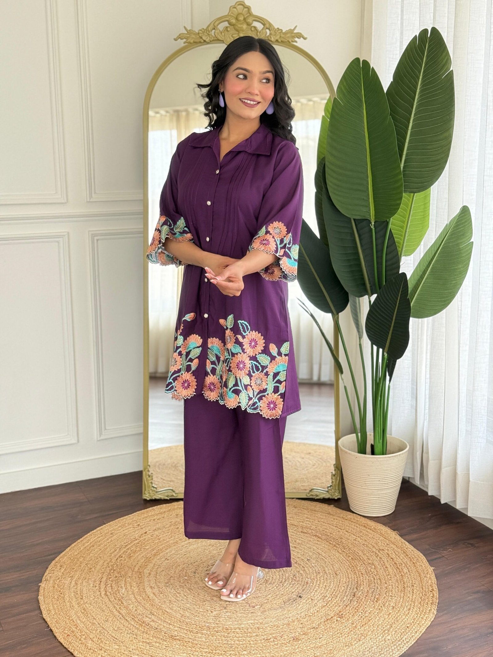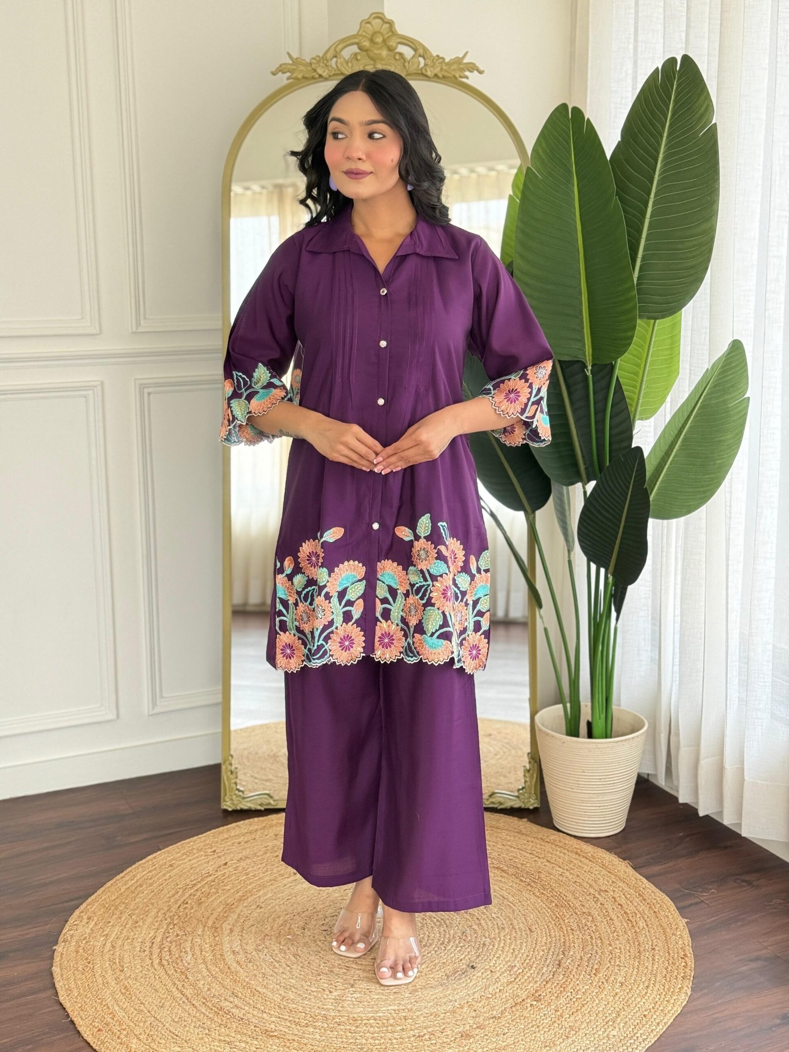 The Roman Silk Embroidered Co-ord Set is a timeless blend of elegance and comfort, designed for women who appreciate refined style. Crafted from luxurious Roman Silk, this set offers a subtle sheen and a graceful drape, making it ideal for any occasion.