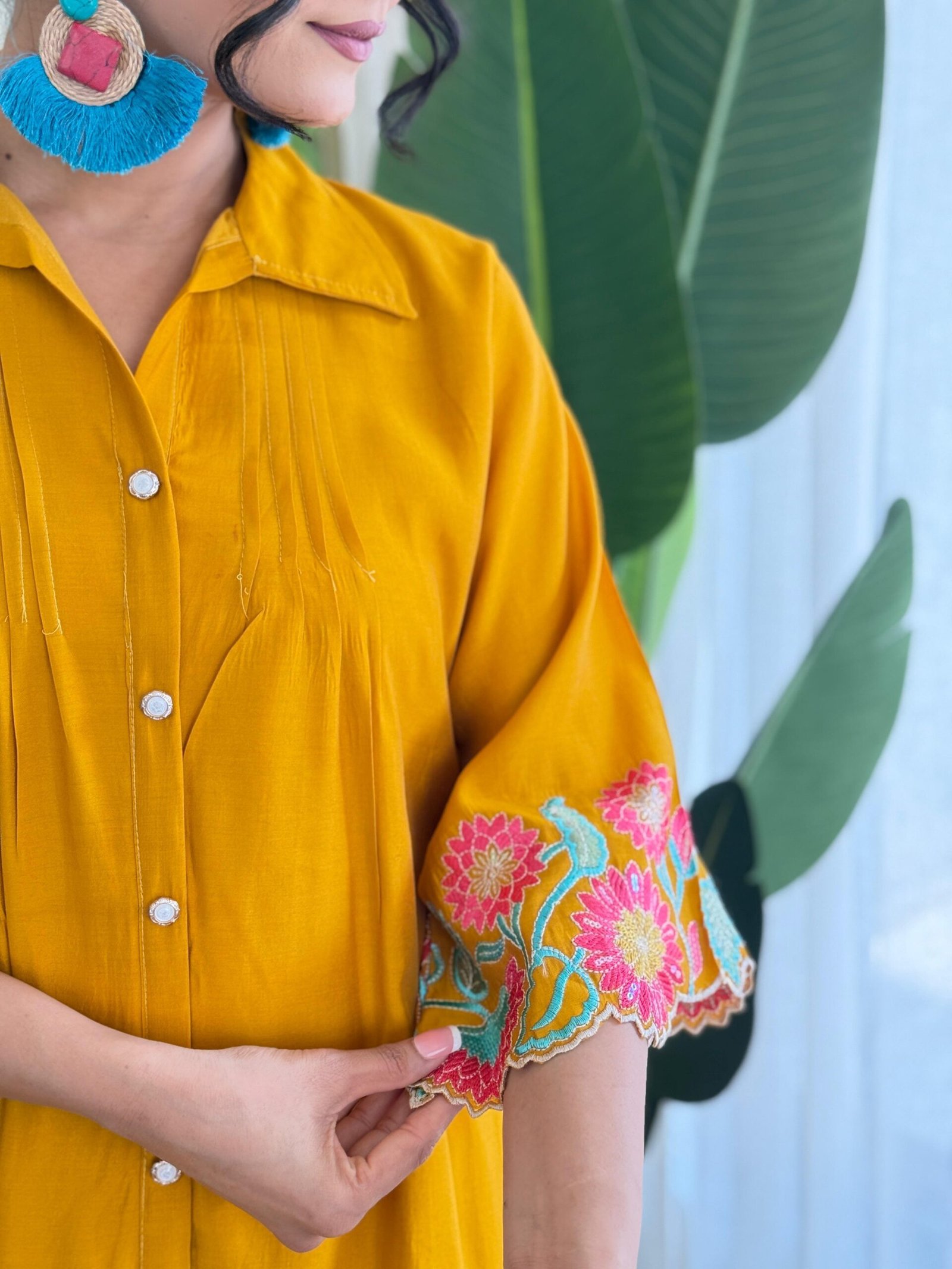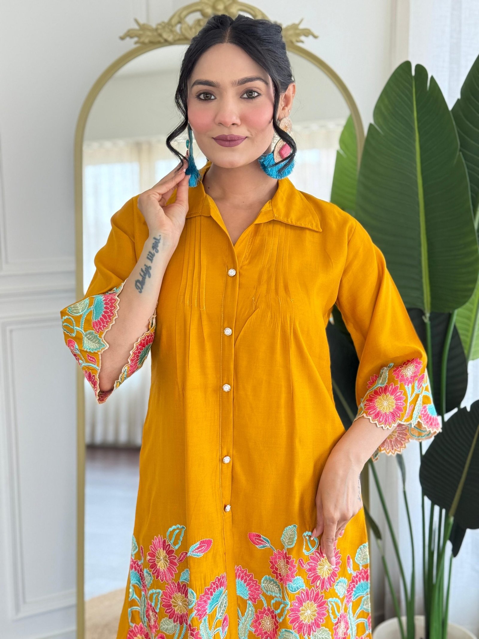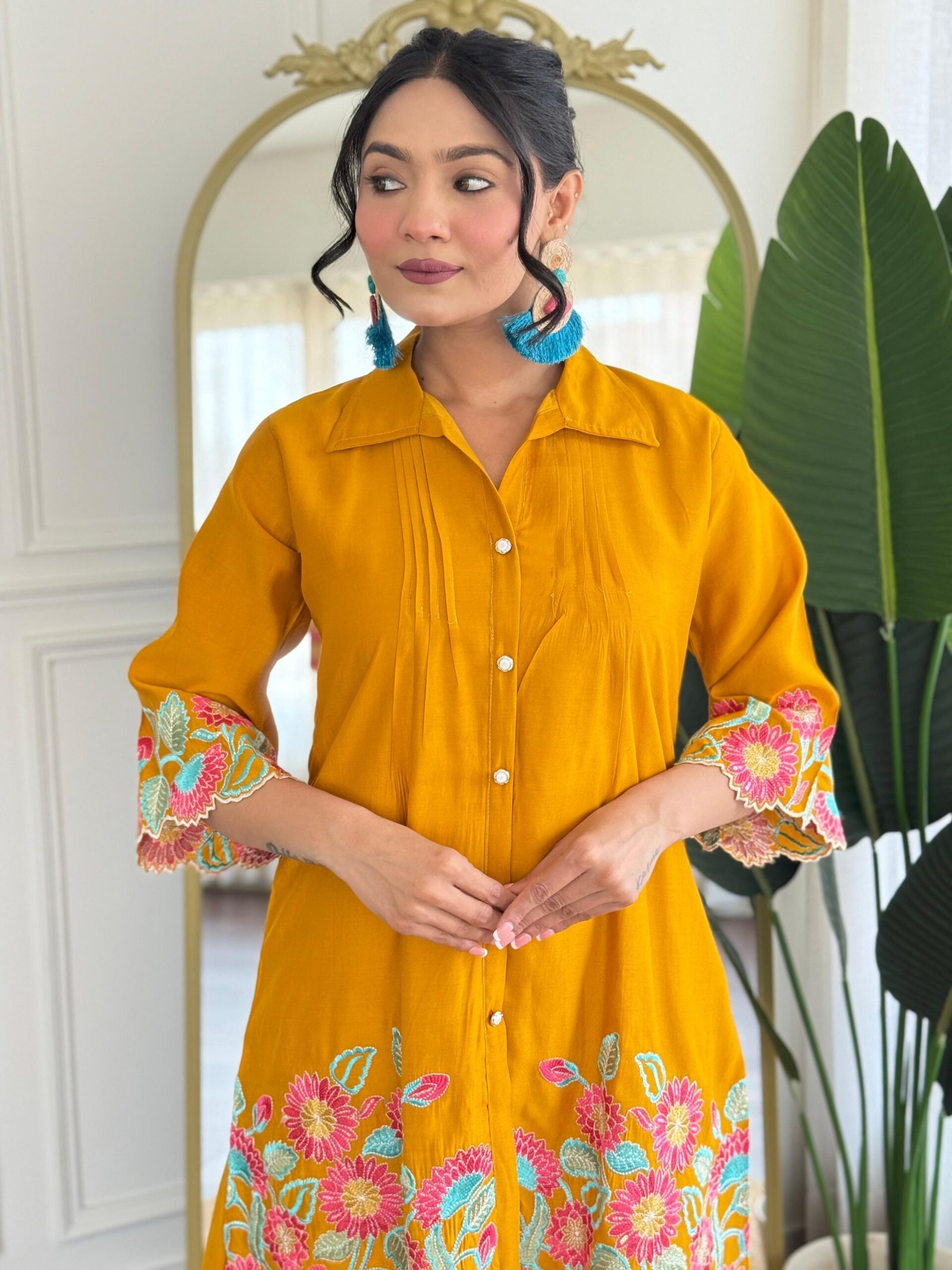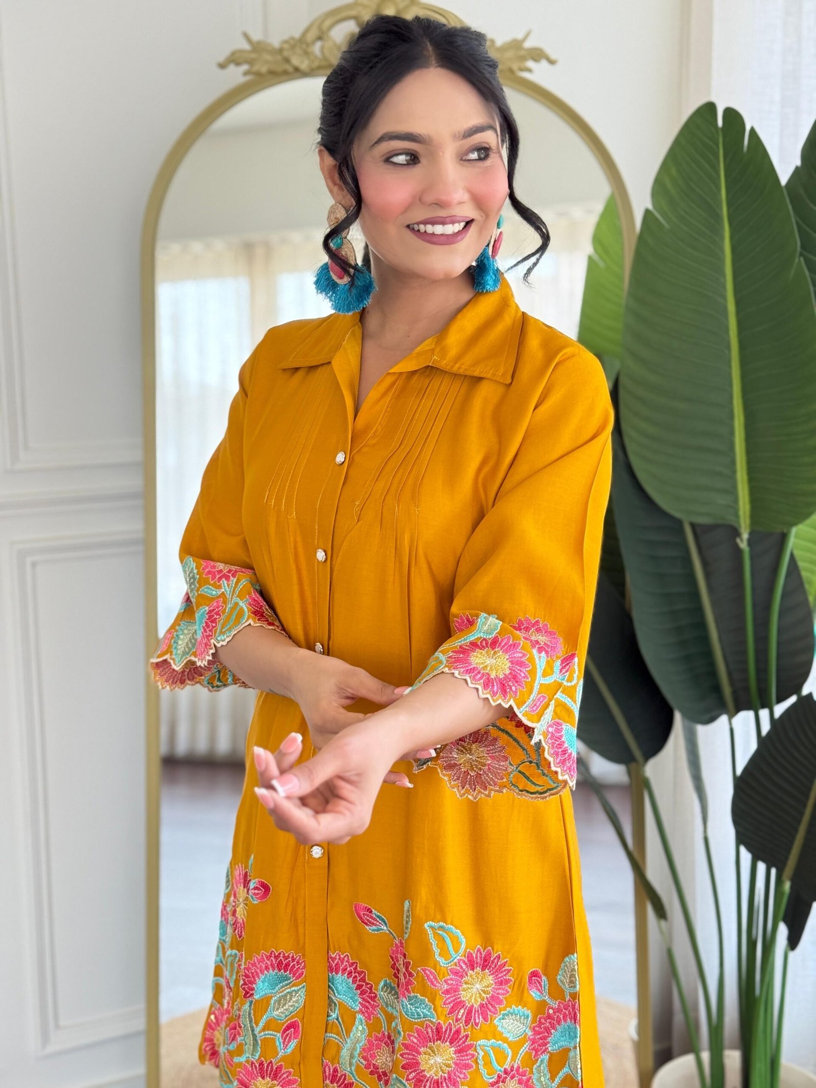 The kurta features intricate embroidery on the front panel and sleeves, adding sophistication to your look. The cotton lining ensures all-day comfort, while the Roman Silk bottom with precise cover stitching adds structure and durability.