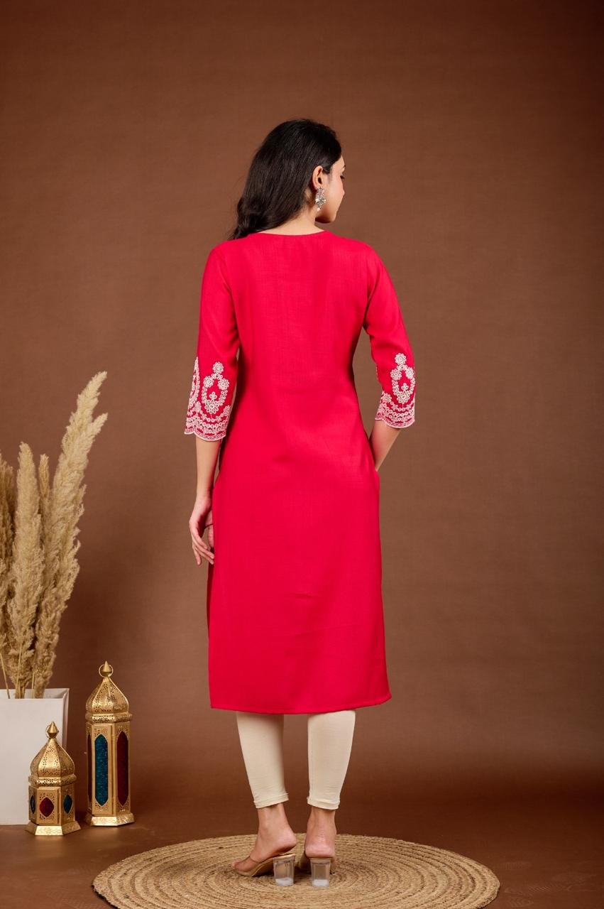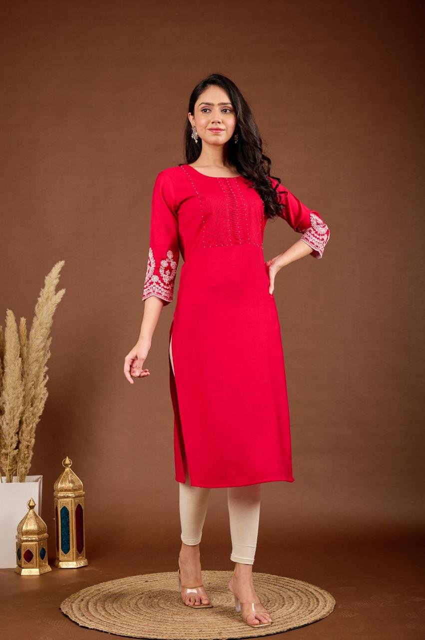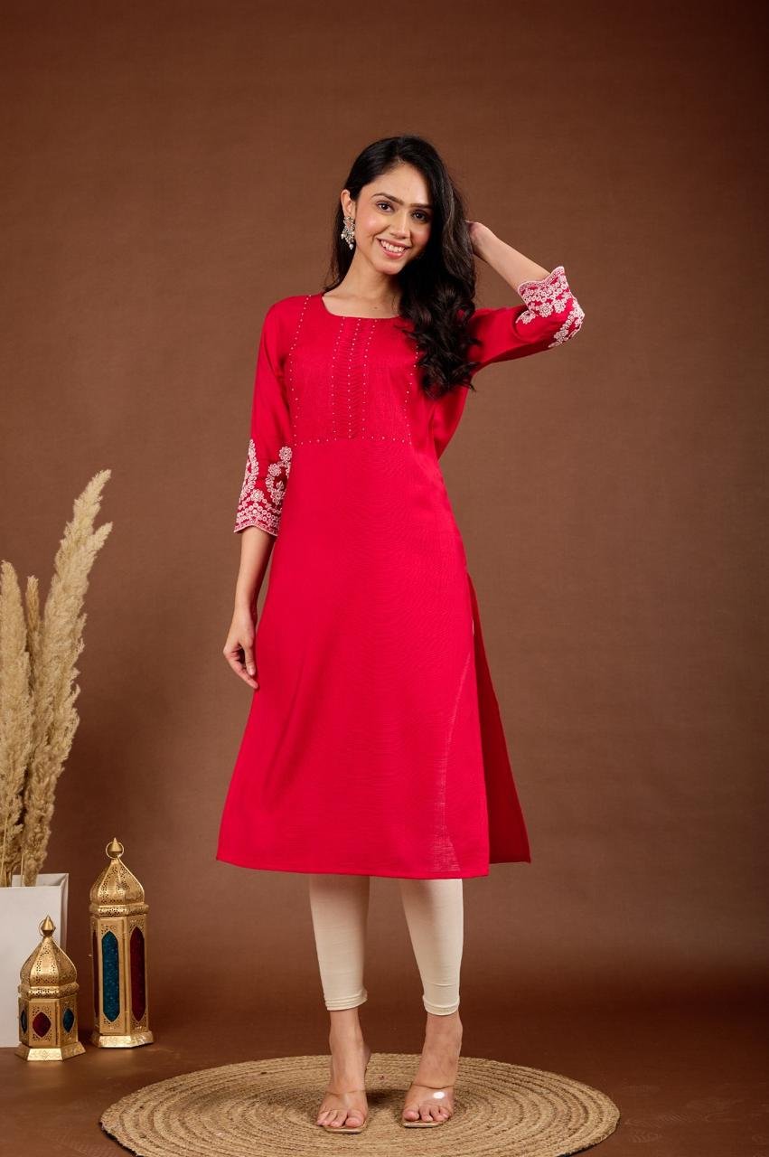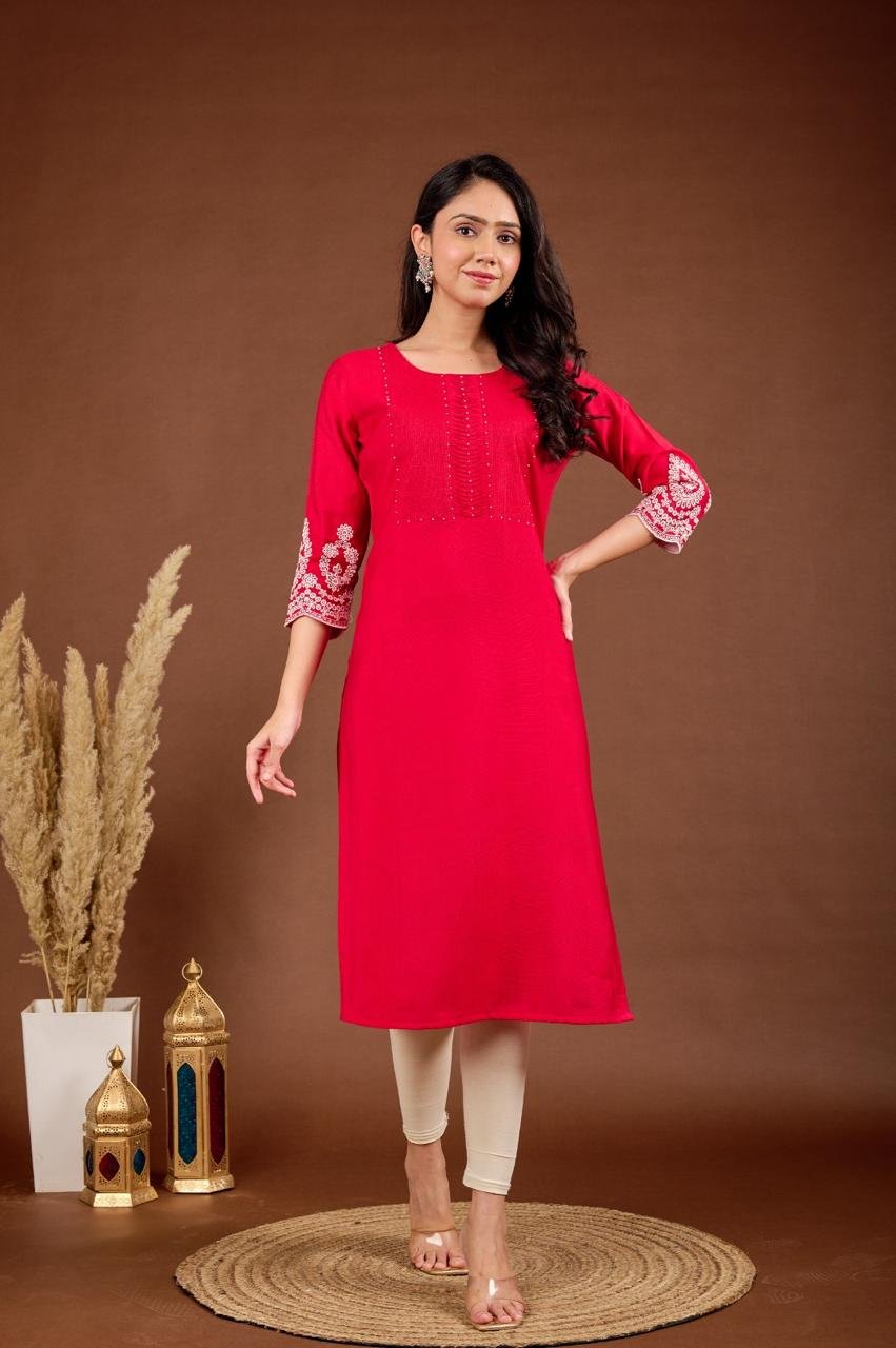 The KU-236 Roman Silk Embroidered Women’s Kurta with Beads & Anchoring Work is a stunning fusion of grace and craftsmanship. Made from premium Roman Silk, this kurta offers a smooth, lustrous drape and long-lasting comfort, perfect for festive occasions, semi-formal gatherings, or daily elegant wear.