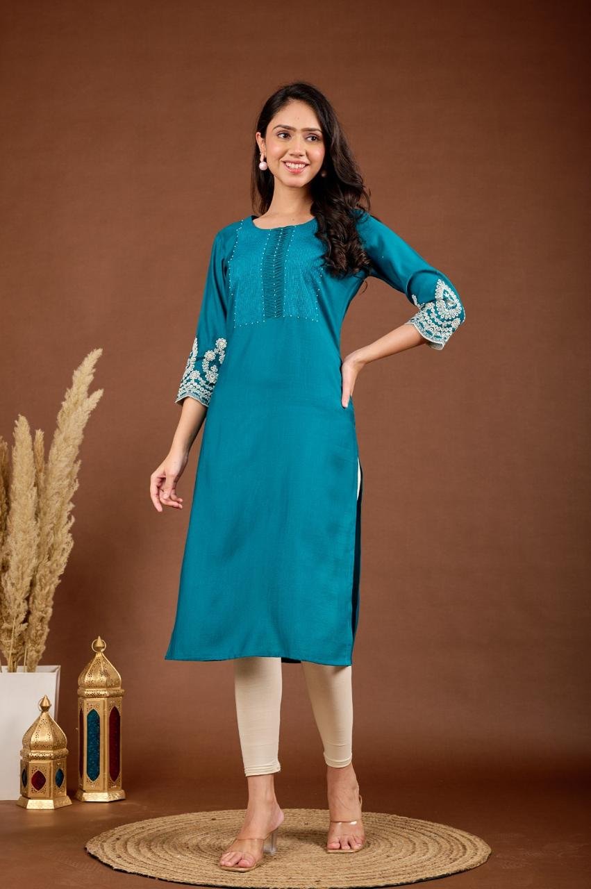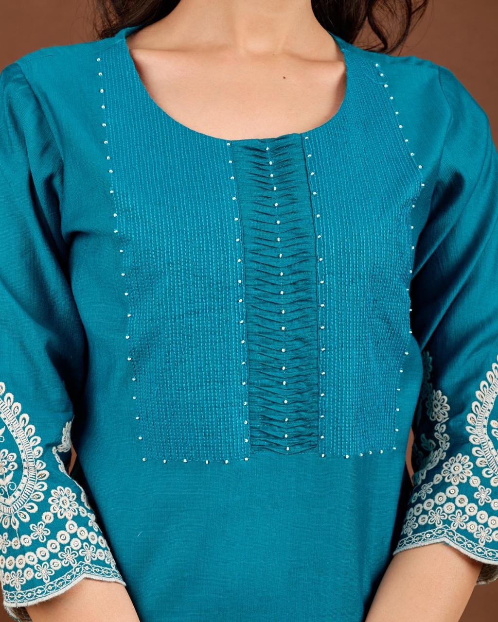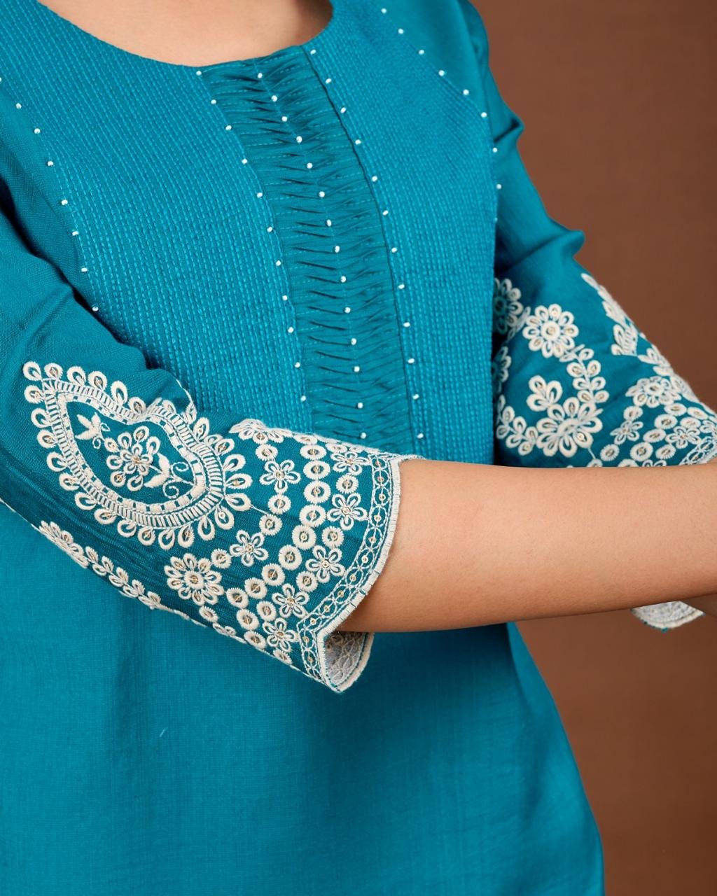 Featuring intricate anchoring and bead embroidery, complemented by beautifully detailed sleeves, this kurta adds refined sophistication to your wardrobe. Pair it effortlessly with palazzos, leggings, or cigarette pants for a complete, stylish ensemble.